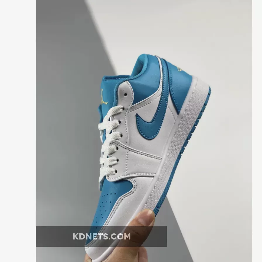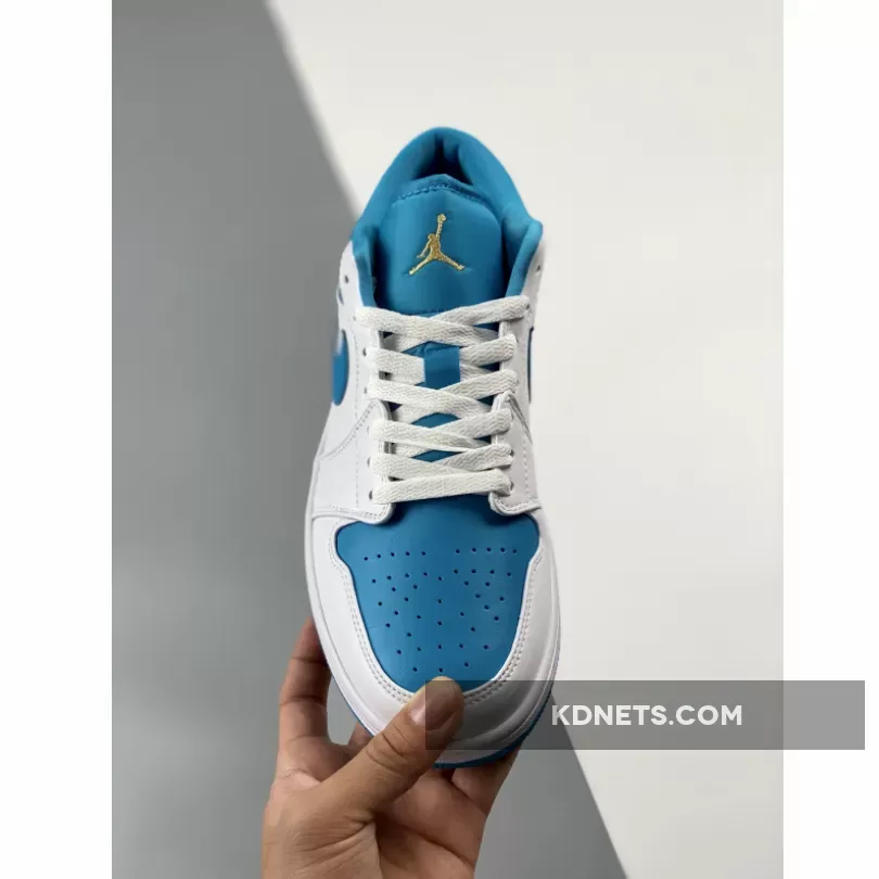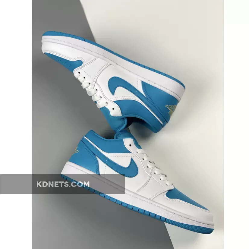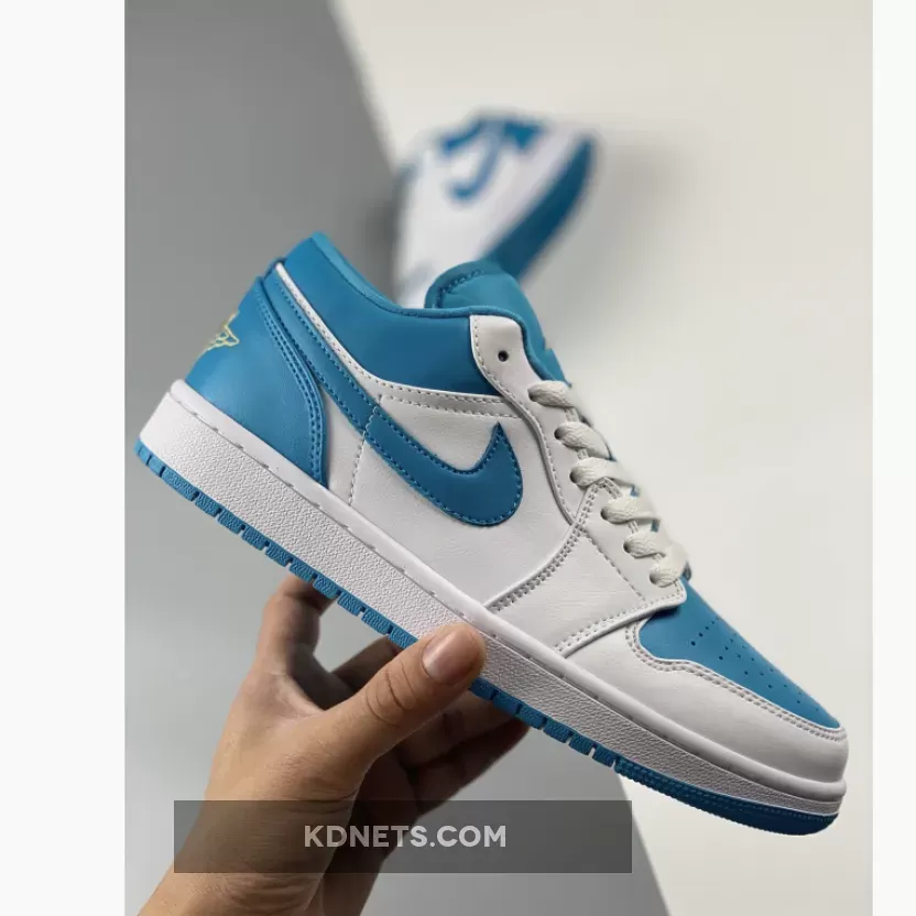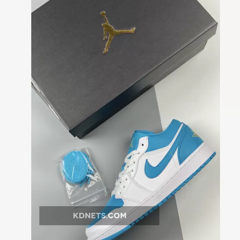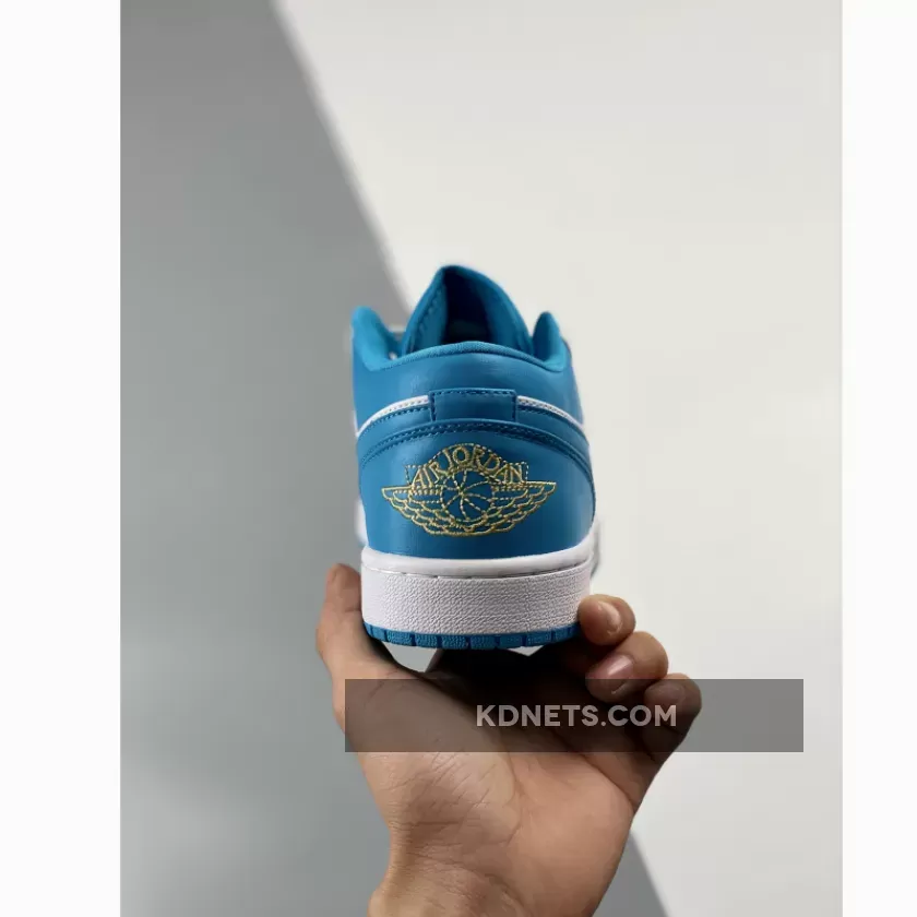 Just like the majority of Air Jordan 1 Lows, the upper seeks a majority leather construction from the toe to the heel. The toebox, heel, ankle collar, and signature Nike Swoosh are all dressed in “Aquatone.” Furthering its colorless impact across the midfoot and quarter overlays, the back half of the pair indulges almost exclusively in teal through its Swoosh, upper collar and heel counter while the lofty explorations of the established two hues pair together amidst its white midsole and blue tread underfoot. The back of the heel is embroidered with “Celestial Gold” Air Jordan Wings. While bright orange embroidery would match to a T.The outsole is also painted in teal blue and makes its way onto the star count on the toe portion of the sole.