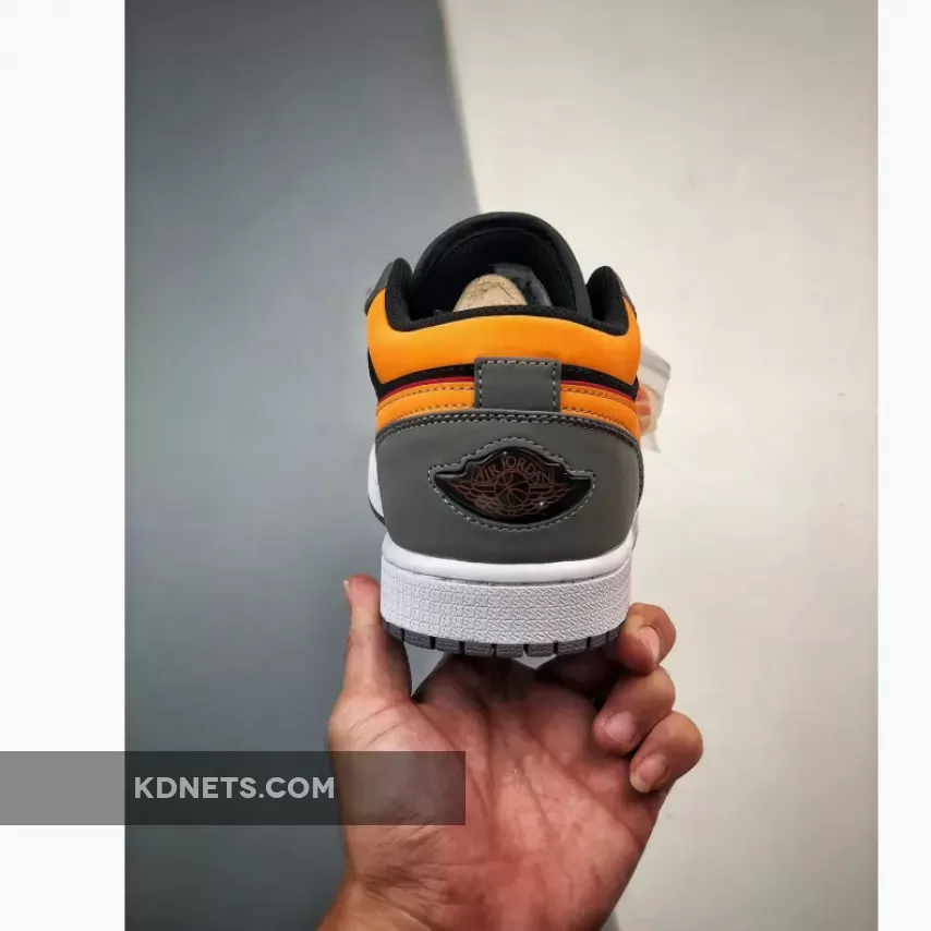Done in an official color scheme listed as Black, Vivid Orange, Light Granite, Cardinal Red, White, this new iteration of the Air Jordan 1 Low is constructed in a mix of nubuck and leather alongside mesh used on the tongues and inner lining.