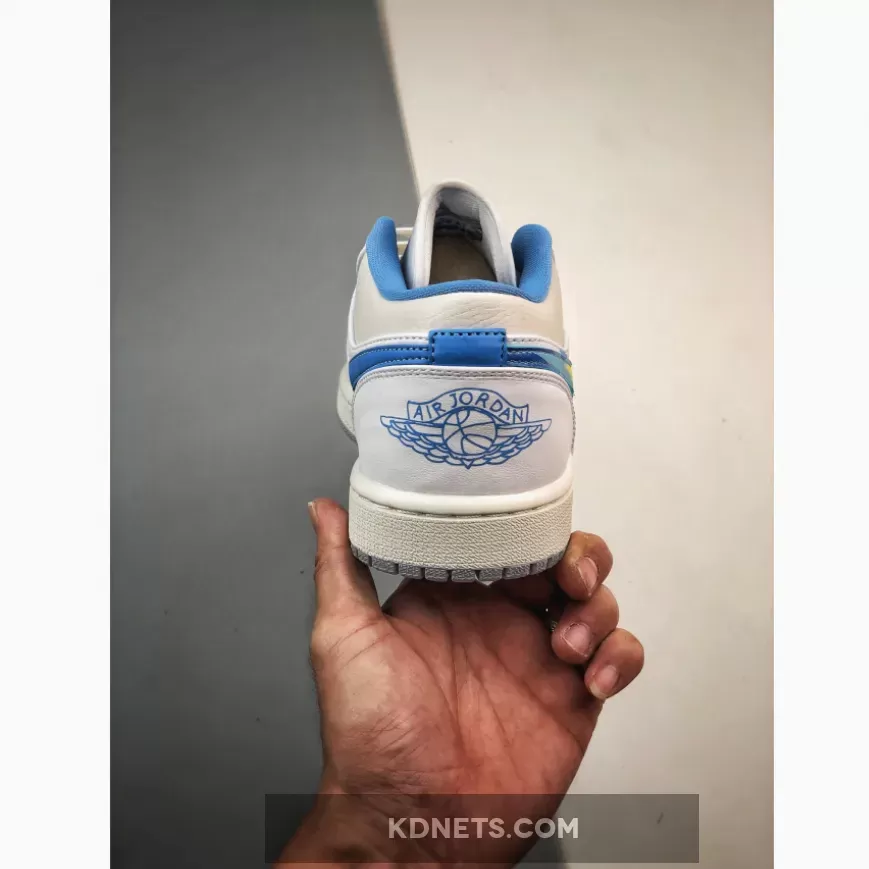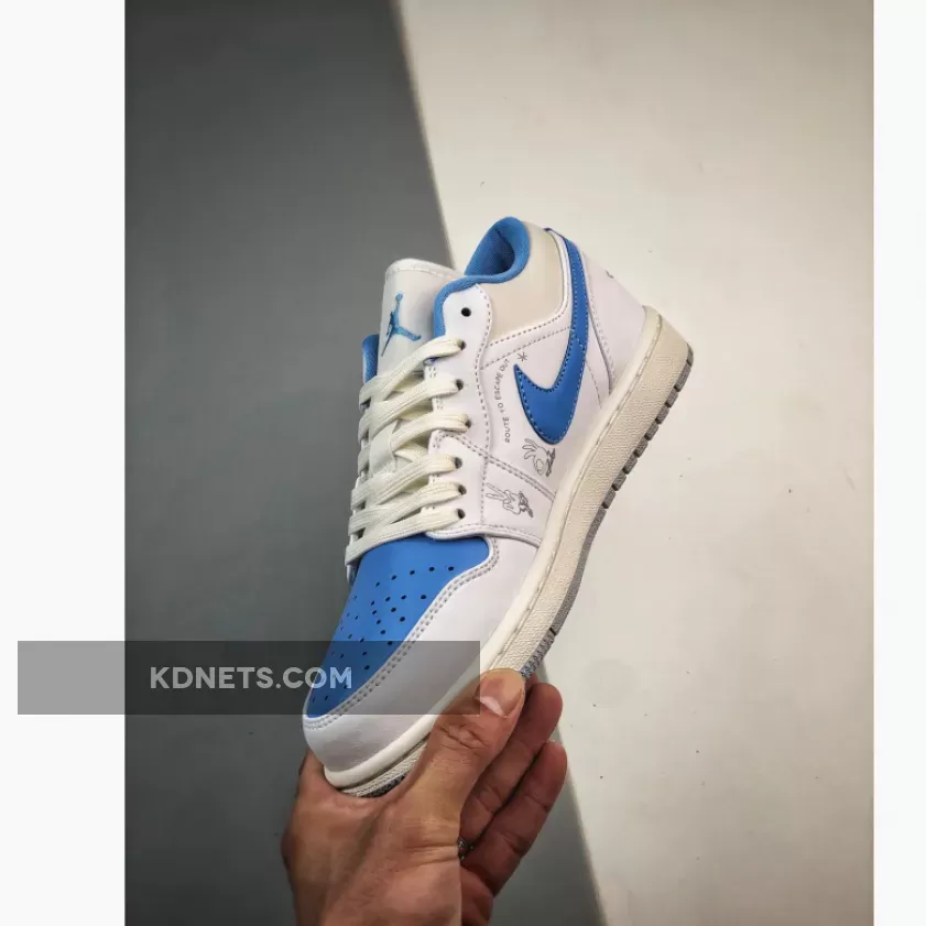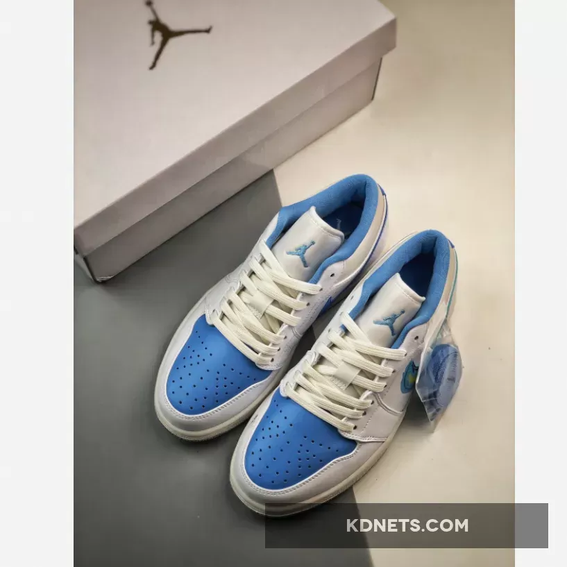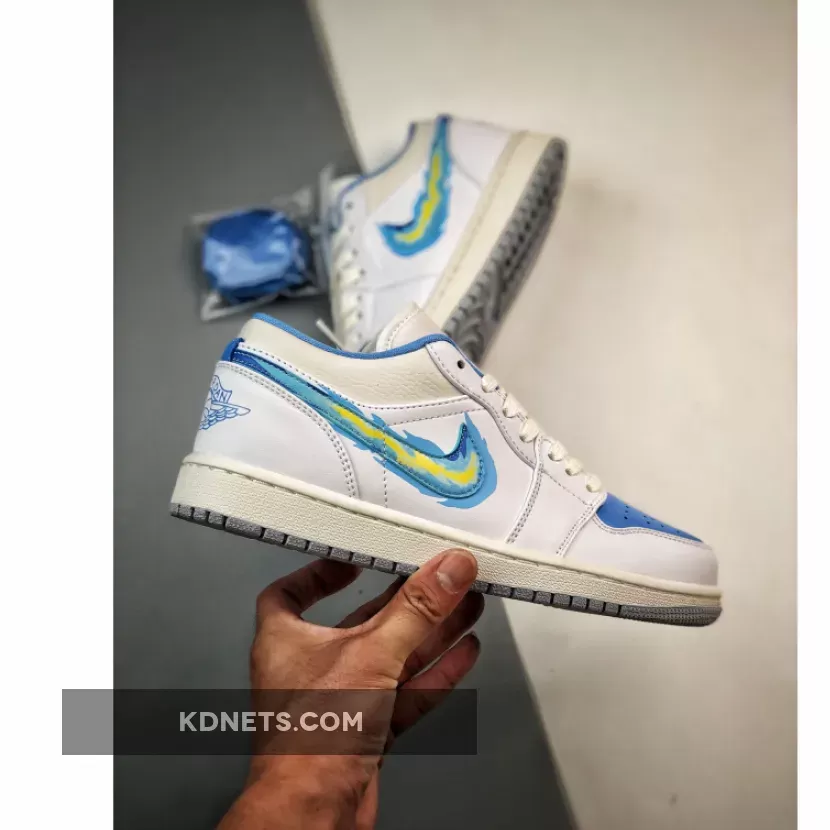 Seen here in an all-leather upper, the model features hits of cream/white with accenting university blue shades seen throughout. This blue hue takes over the toebox, Jordan branding, and sockliner, while all panels (minus the collar’s creamy hit) take on a stark white finish. Along the midfoot, the Swoosh logo gets covered in a blue flame graphic on the lateral side, while the medial side features a solid university blue Swoosh. Although this medial side forgoes the custom graphic, there are unique details like “Born To Fly” text and skate-friendly graphics in a grey hue. Back on the heel, the Jordan Wings logo appears drawn on the upper in university blue. Finishing the custom graphics are the nods to skateboarding on the reverse of the tongue, with the left sneaker showcasing an on-fire skateboard and the right hosting a book titled “Just Skate.” Rounding out the design is the sail midsole paired with a grey rubber outsole.