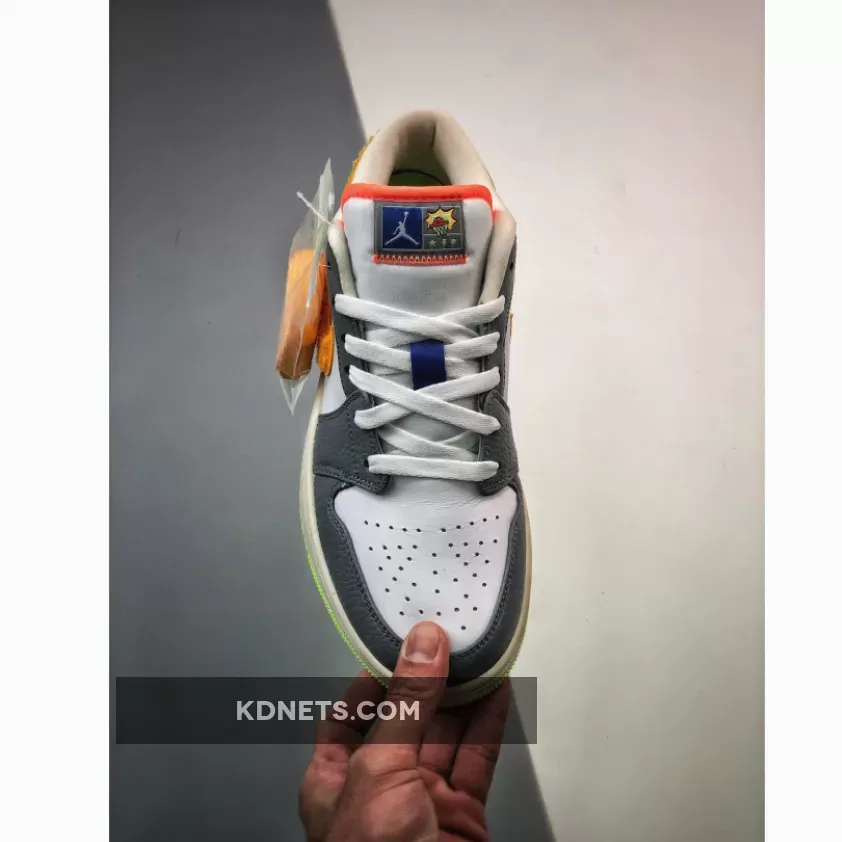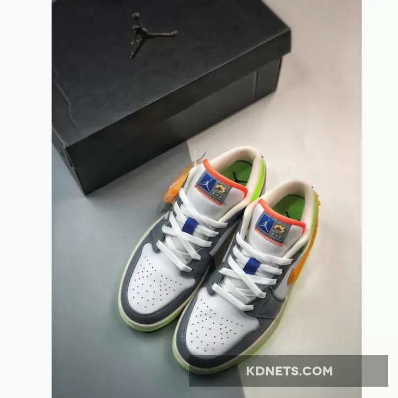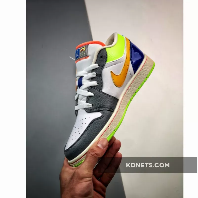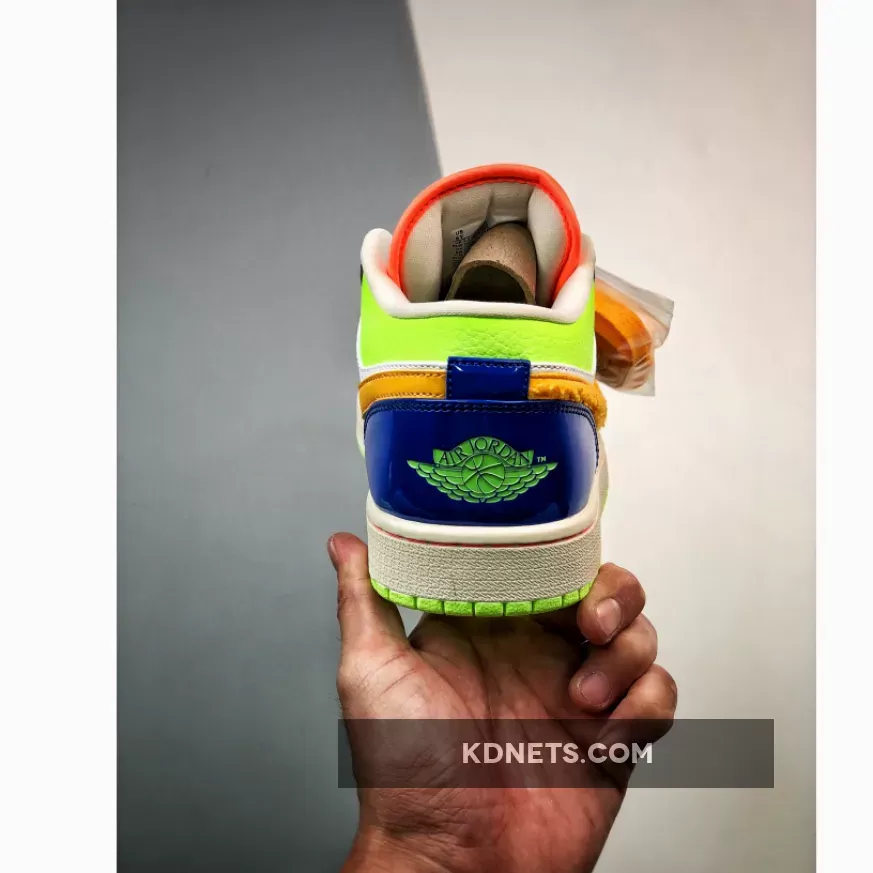 The sneaker starts off with a simple “White” leather base that fills the toebox and quarters. This AJ1 Low has standout overlays in “Shadow Green” tumbled leather on the toe and Blue patent leather on the heel. The sneaker has “Volt” tumbled leather around the ankle, which corresponds with the matching “Volt” outsole. The complex upper is given even more depth with the addition of the chenille Swooshes on the side panels. The back of the heels are complete with “23” branding and the Air Jordan Wings. The sneaker is finished with a split tongue tag that features a hoop graphic and the Jumpman.