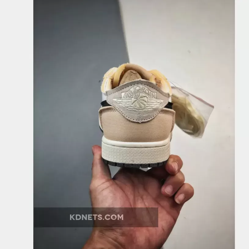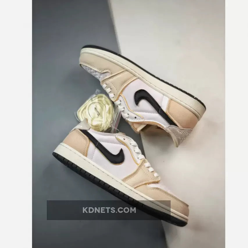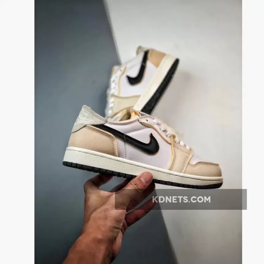 The “Coconut Milk” colorway features the same utilitarian design that focuses on water resistance. Borrowing the silhouette from the Air Jordan 1 Low OG, the shoe features a slightly modified upper. The base layer has a deconstructed aesthetic as the Swooshes and overlays feature exposed foam edges to give it a three-dimensional look. The upper is mostly a crisp, white base, featuring warm grey-sail overlays and a bold, black Swoosh. The shoe sits atop a sail-colored midsole and a black rubber outsole to match the Swoosh. The tongue is dressed in a light pink tone and the Nike Air branding is seen across the tongue tab and insoles while the Air Jordan branding is embroidered onto the heel to round out the design.