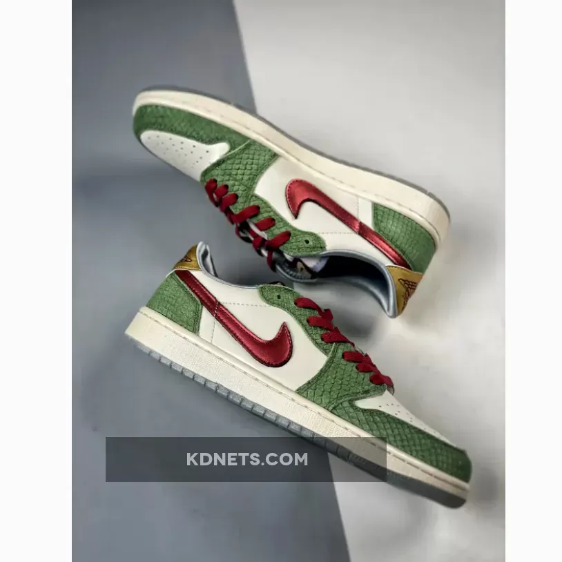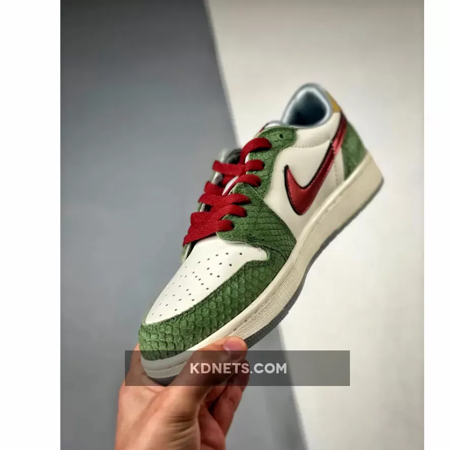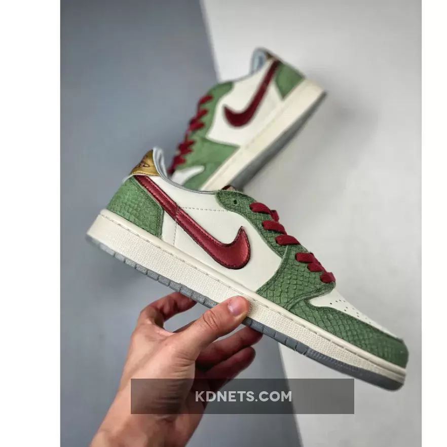 The Air Jordan 1 Low “YOTD” boasts a captivating palette that blends Sail, Cedar, Oil Green, Light Pumice, and Dark Team Red hues. the upper sports a “Sail” leather base that complements the “Oil Green” scale overlays that span from the mudguard to the heel counter. Adding a dash of contrast, Dark Red accents grace the Swooshes, embroidered Wings logo found on the Golden heel tabs, “Nike Air” tongue labels, and a set of laces. Inside, a refined Light Grey satin lining exudes elegance, all set atop a pristine White midsole, which meets the ground with a Green rubber outsole. Key thematic details round out the look courtesy of the sockliner, inside of the tongue and a celebratory red envelope. As a final touch, this extraordinary pair comes packaged in a special Year of the Dragon-themed box.