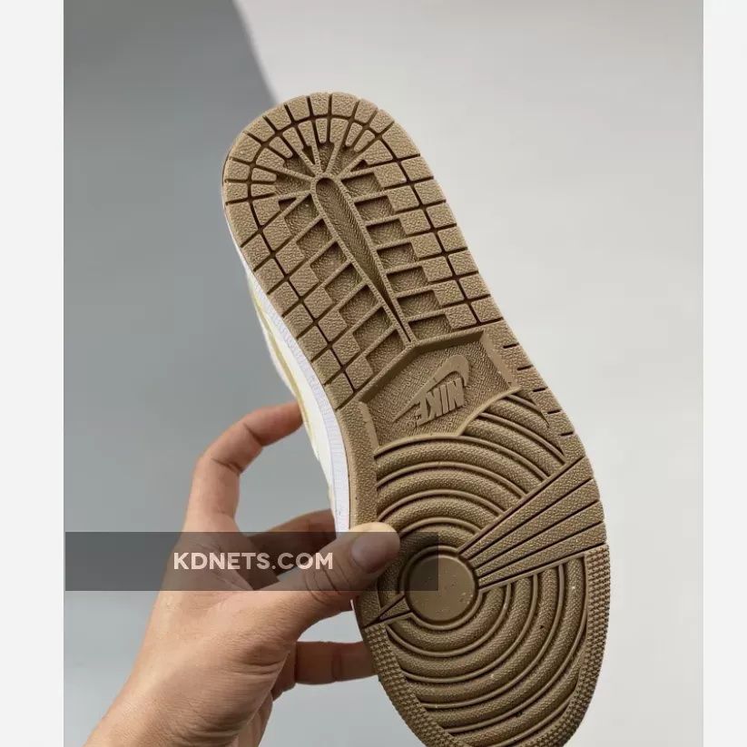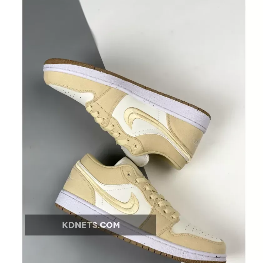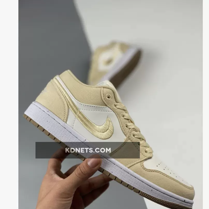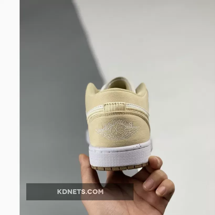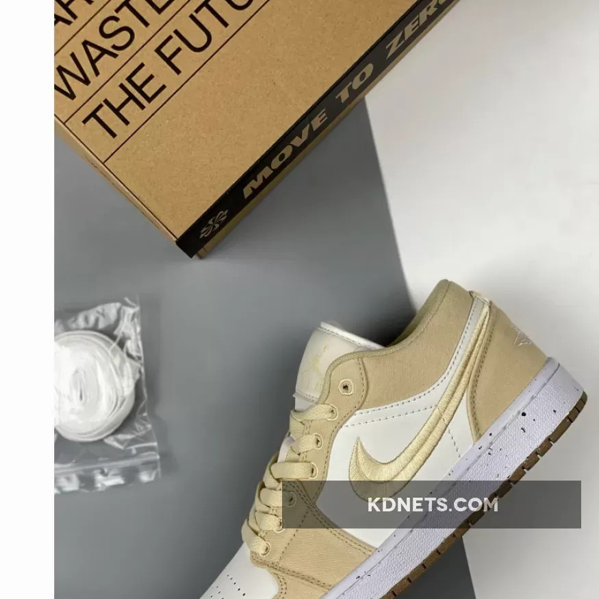 This Air Jordan 1 Los starts off with a cream-like hue on the leather base on the upper while the highlight tan/linen canvas takes care of the overlays, resemblance to the recently-unveiled “Celestial Gold” colorway.