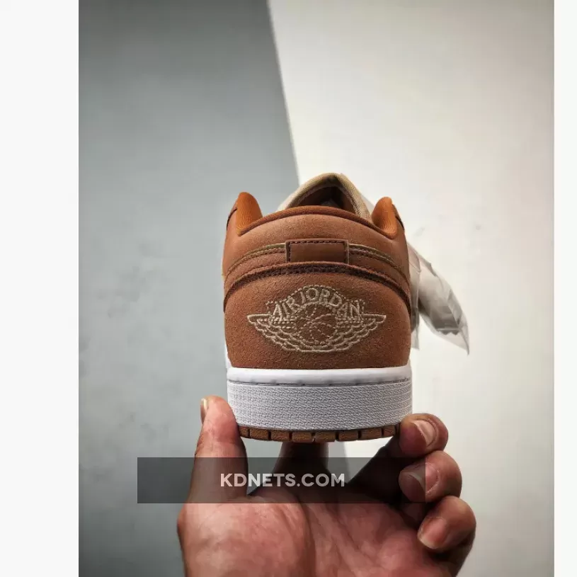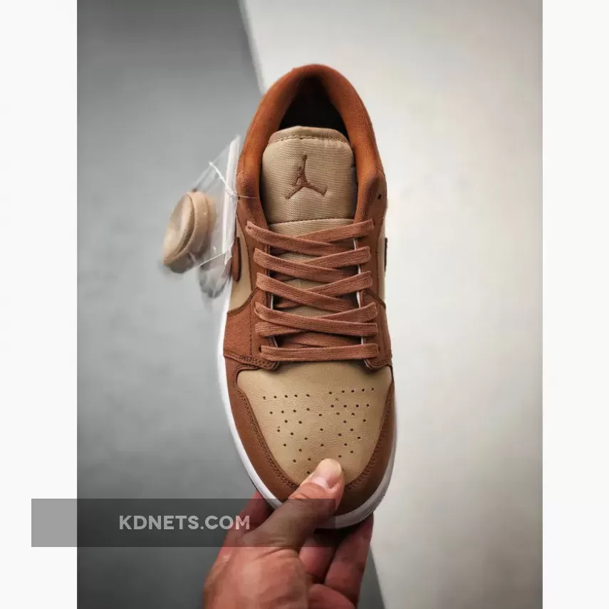 this silo rocks a light brown premium leather base with cracked suede overlays in a darker shade, making waves while the signature Swooshes on the sides, an embroidered Jumpman logo adding that extra pop on the nylon tongue, and the iconic Wings symbol chilling on the heel panel. Hold up; the clean white midsole breaks free from the warm neutrals, rocking a patented Nike Air unit in the heel for that low-profile cushioning game.