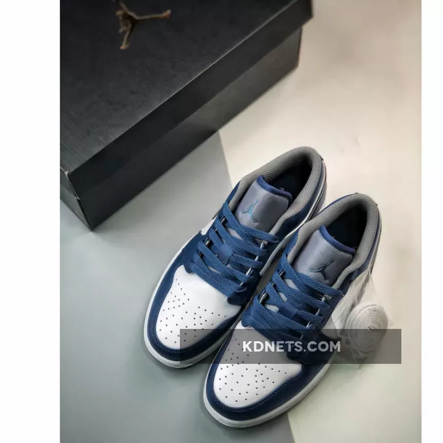 This offering of the low-top Air Jordan 1 features a White leather base with Blue overlays, laces, tongue lining, and insoles.