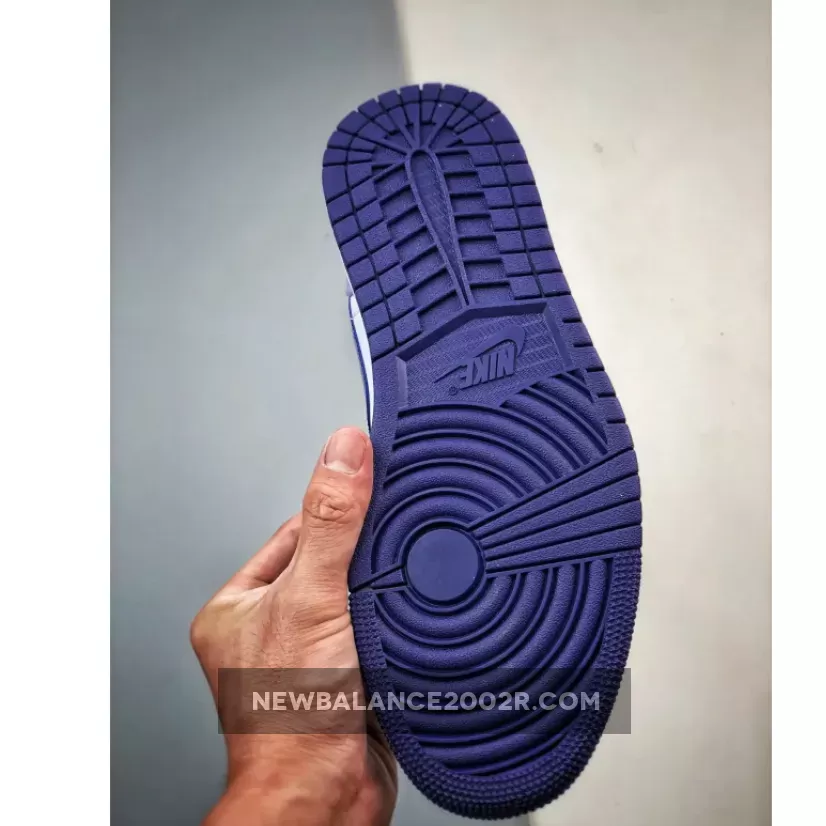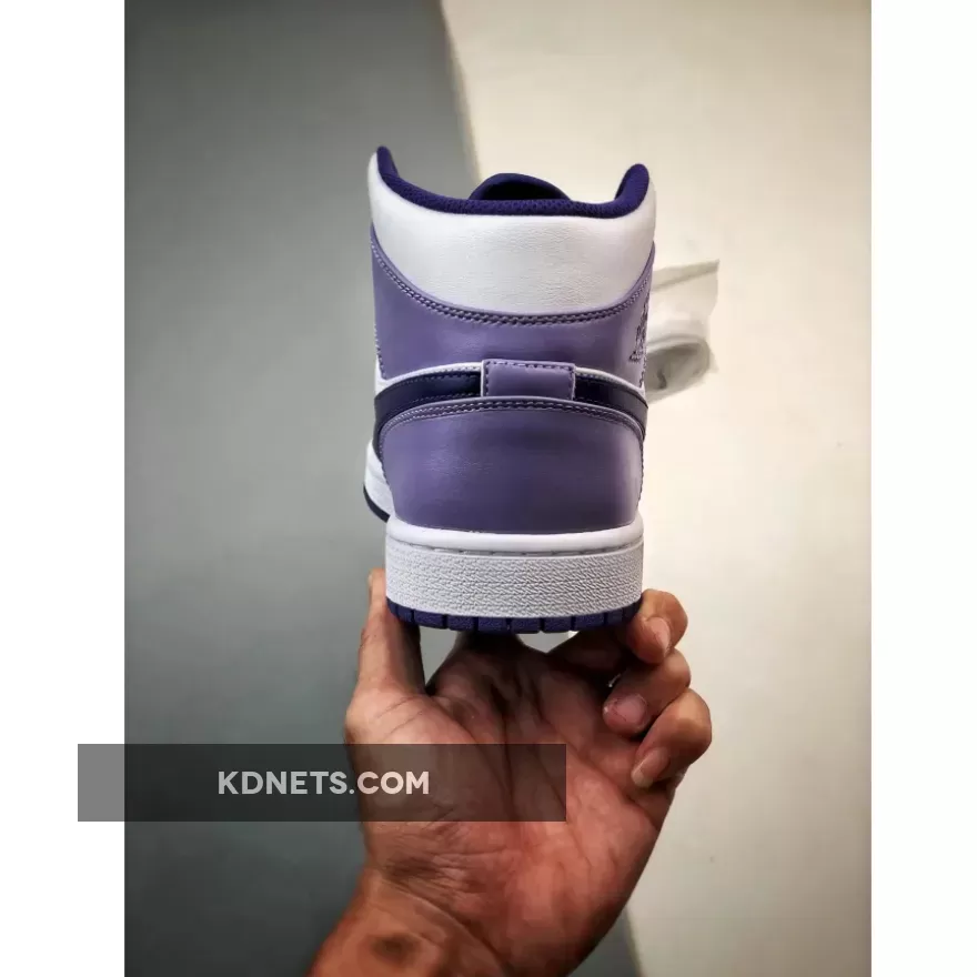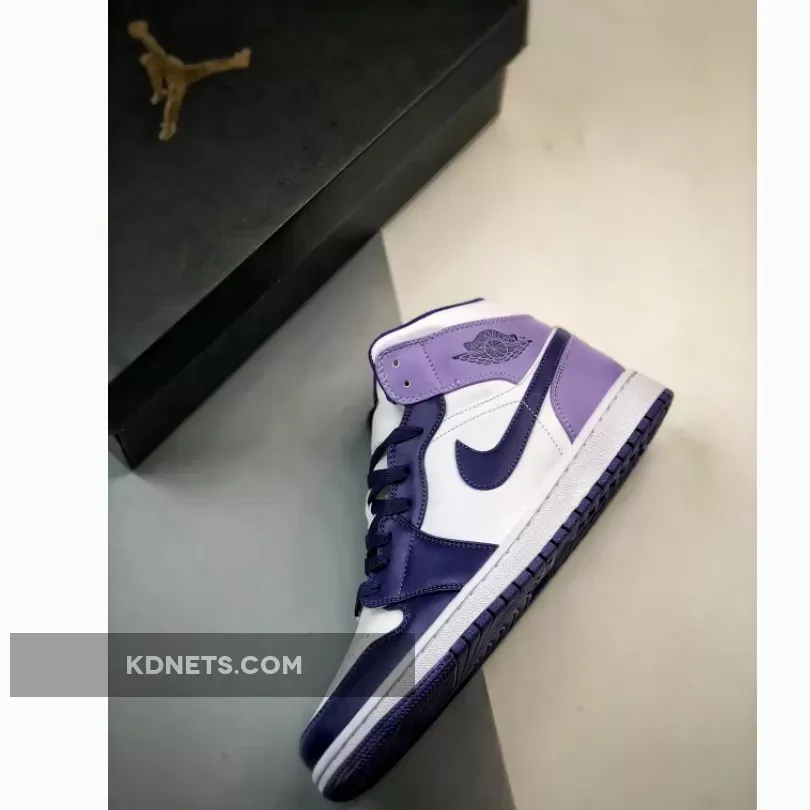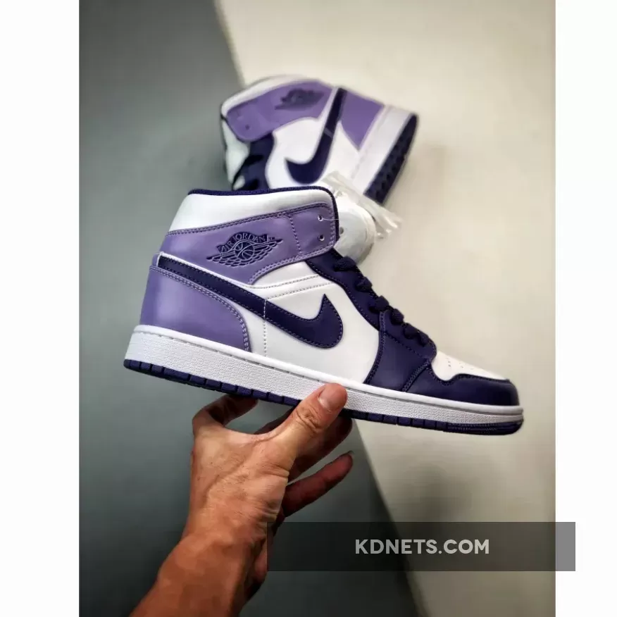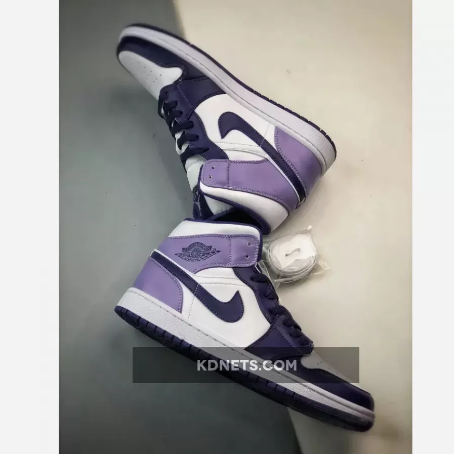 This offering of the Air Jordan 1 Mid features a full leather build on the upper with White serving as the base hue and two different shades of purple seen on the overlays.