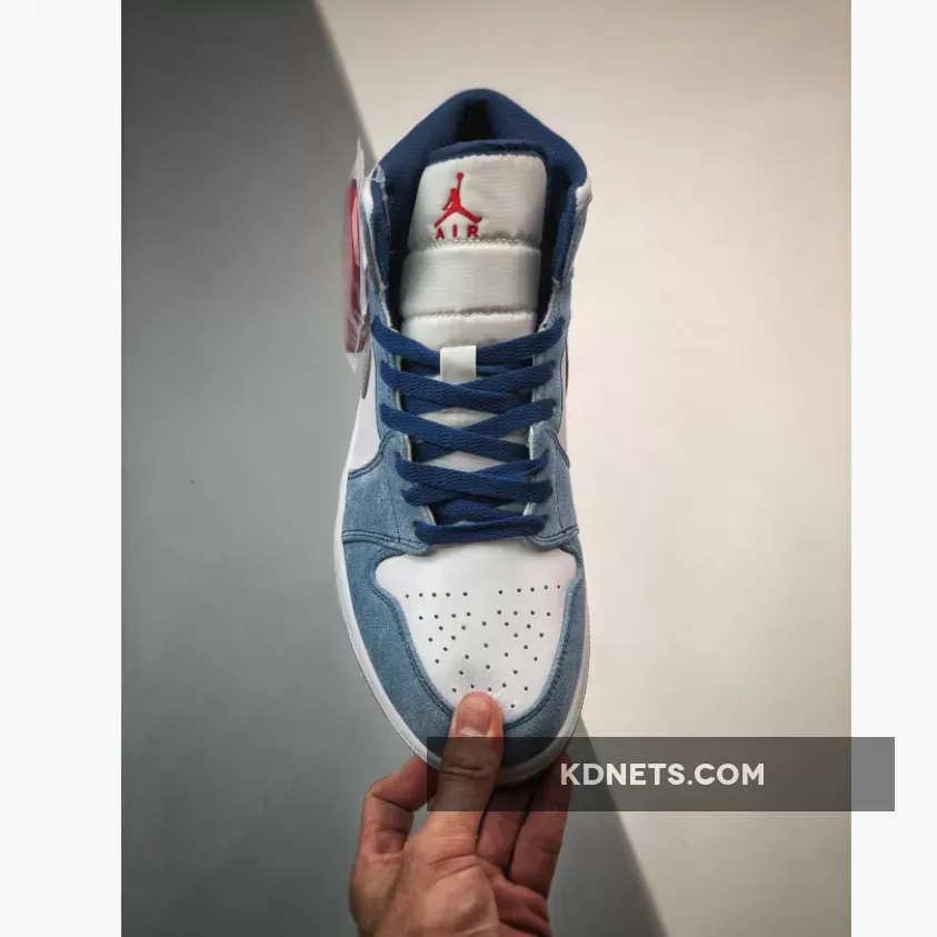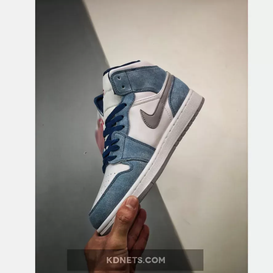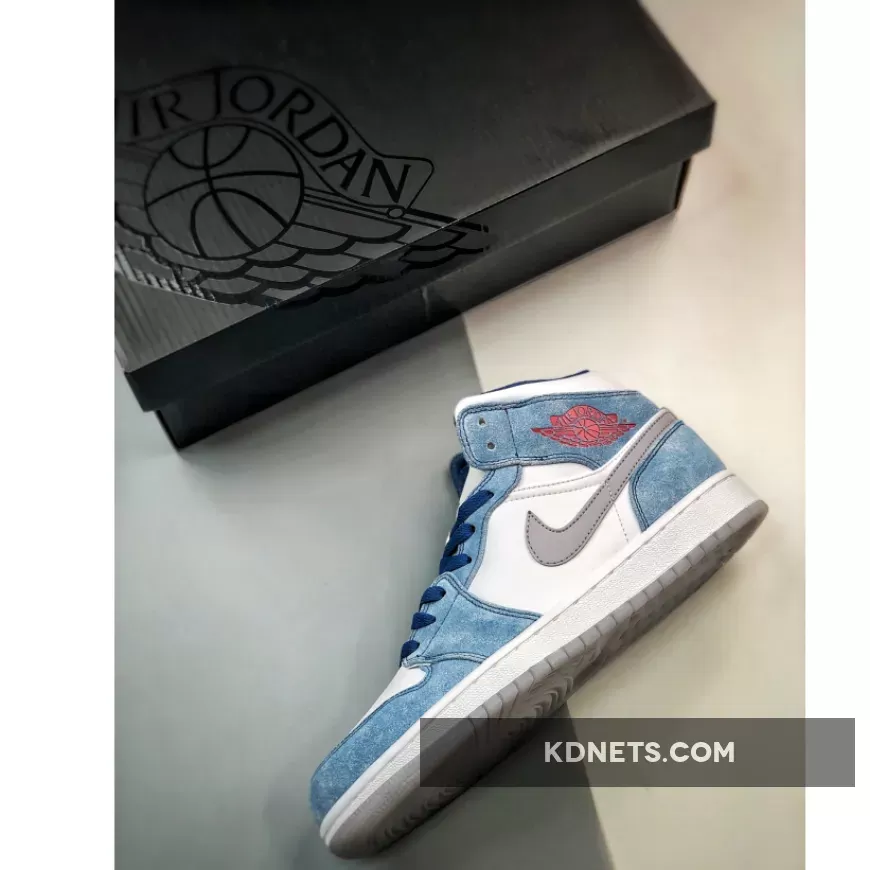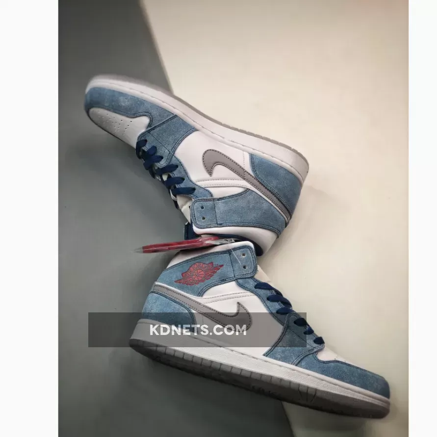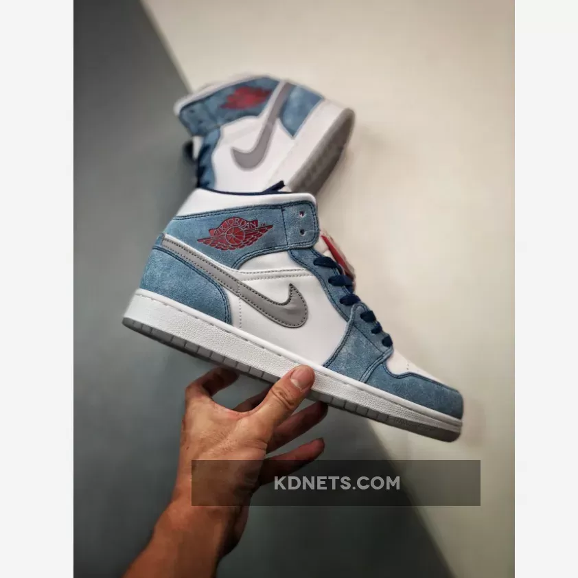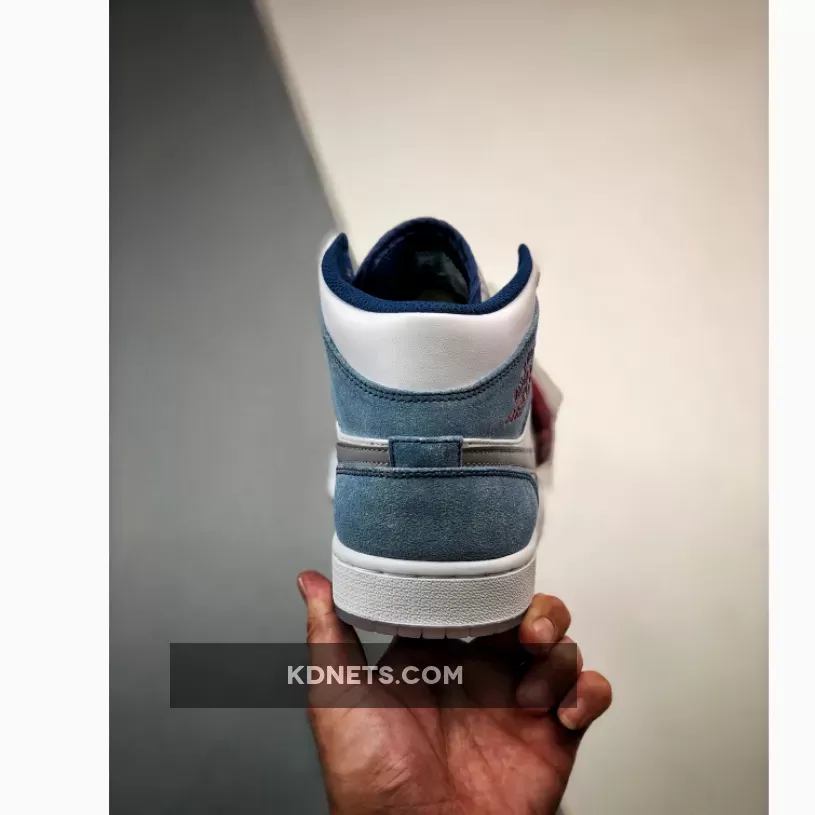Dressed in a French Blue, Fire Red, White, and Light Steel Grey color scheme. This offering of the mid-top Air Jordan 1 features a White leather base with dusty Blue suede overlays. Red Jumpman and Wing logos with Grey Swooshes atop a White midsole and semi-translucent outsole completes the design.