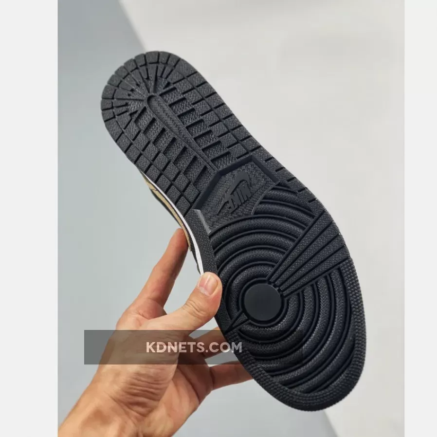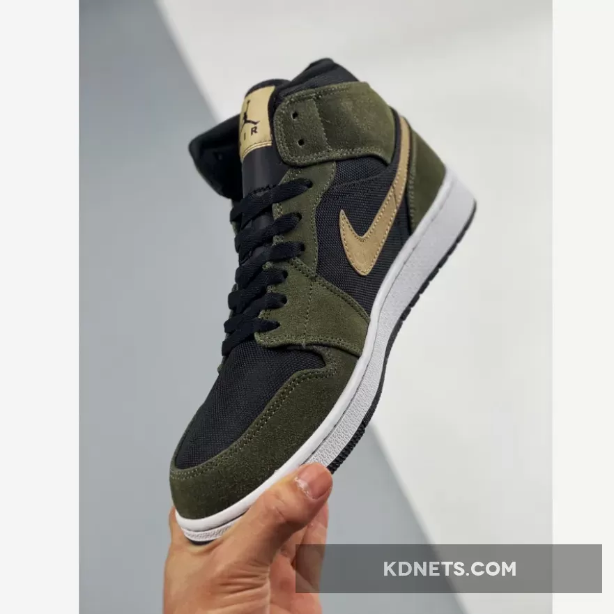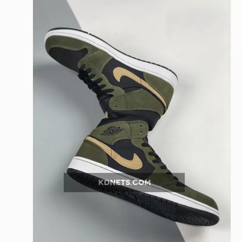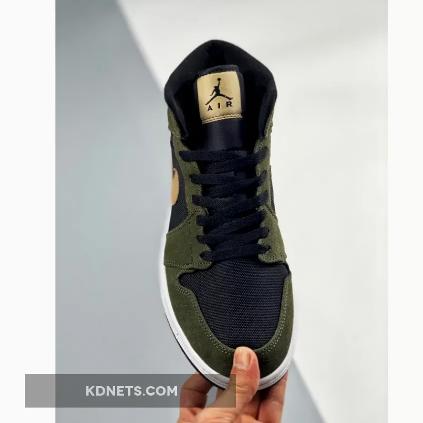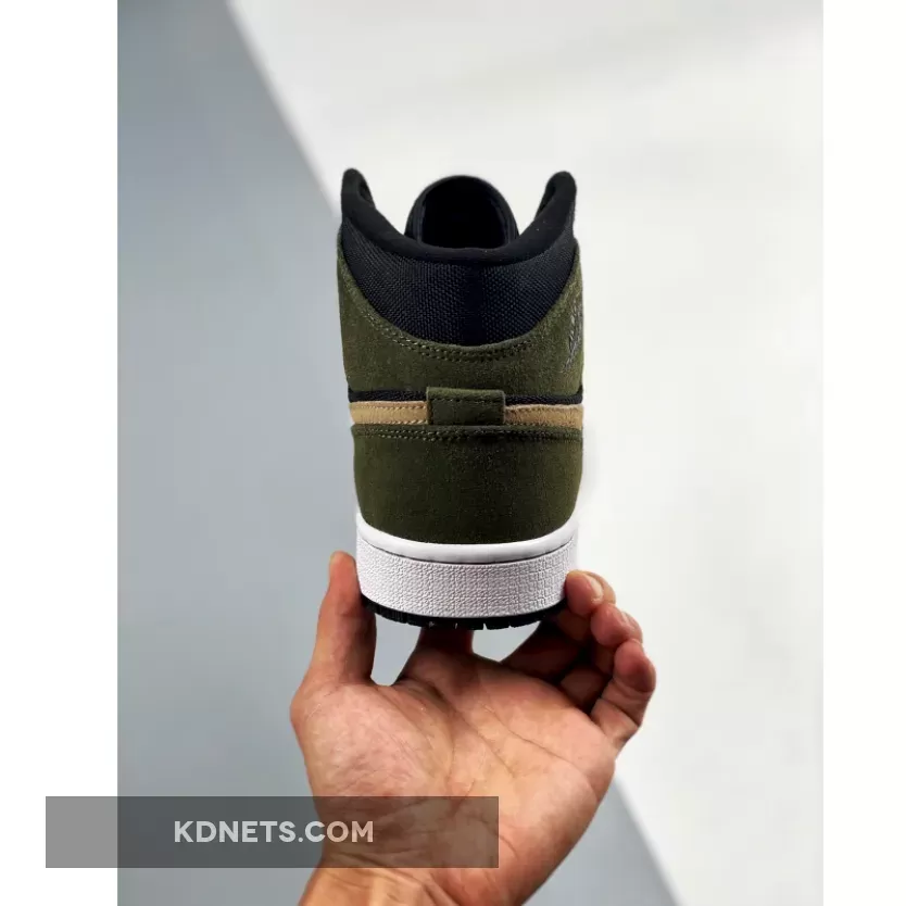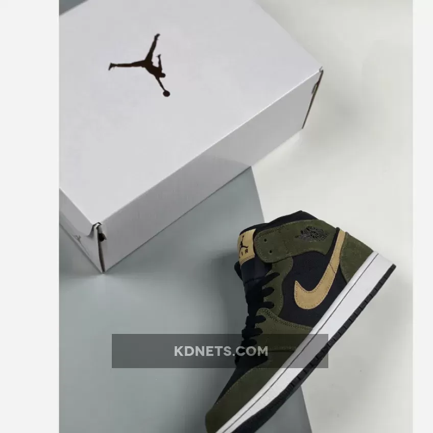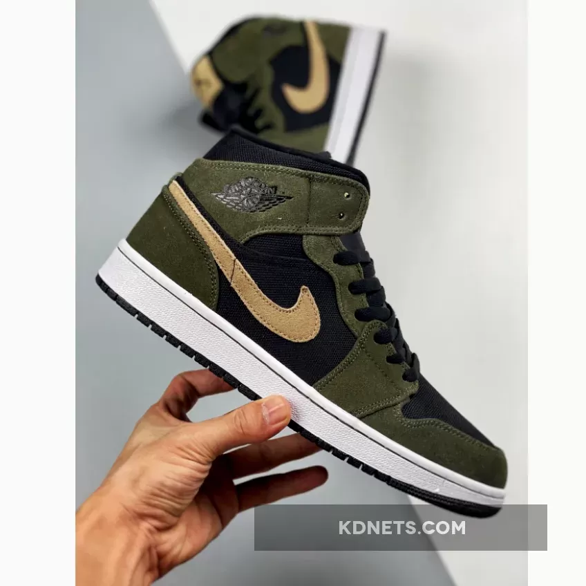 This offering of the mid-top Air Jordan 1 features a Black ballistic mesh upper with Olive suede overlays. A Khaki-colored suede Swoosh on the sides atop a White midsole and Olive Green rubber outsole completes the design.