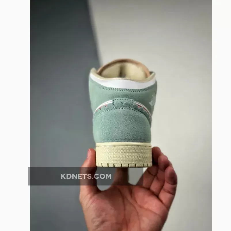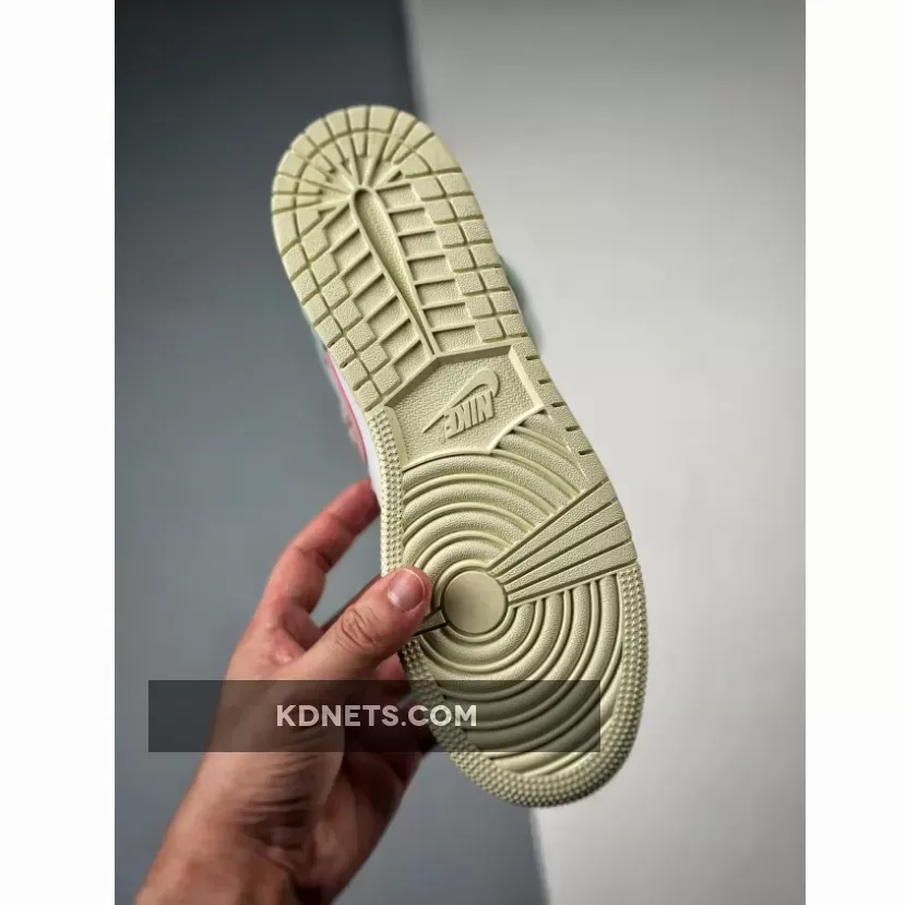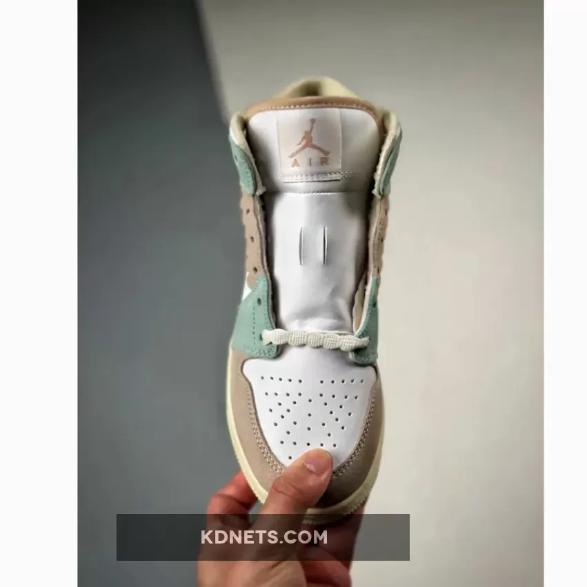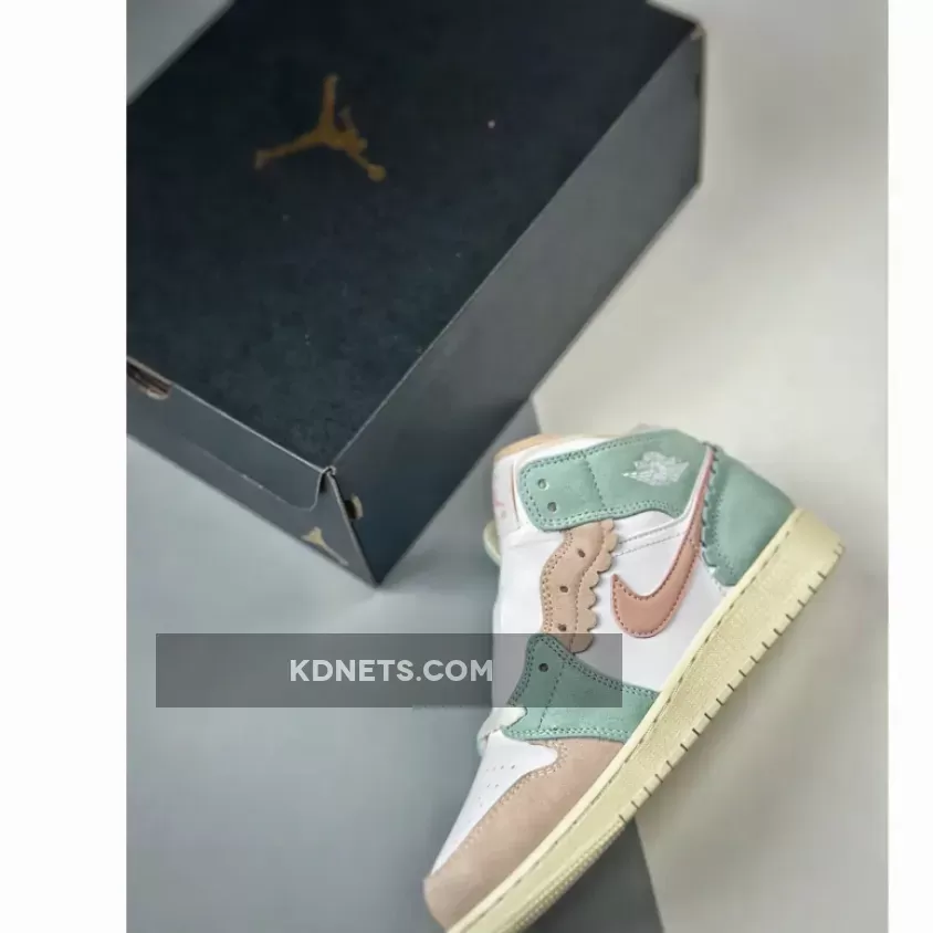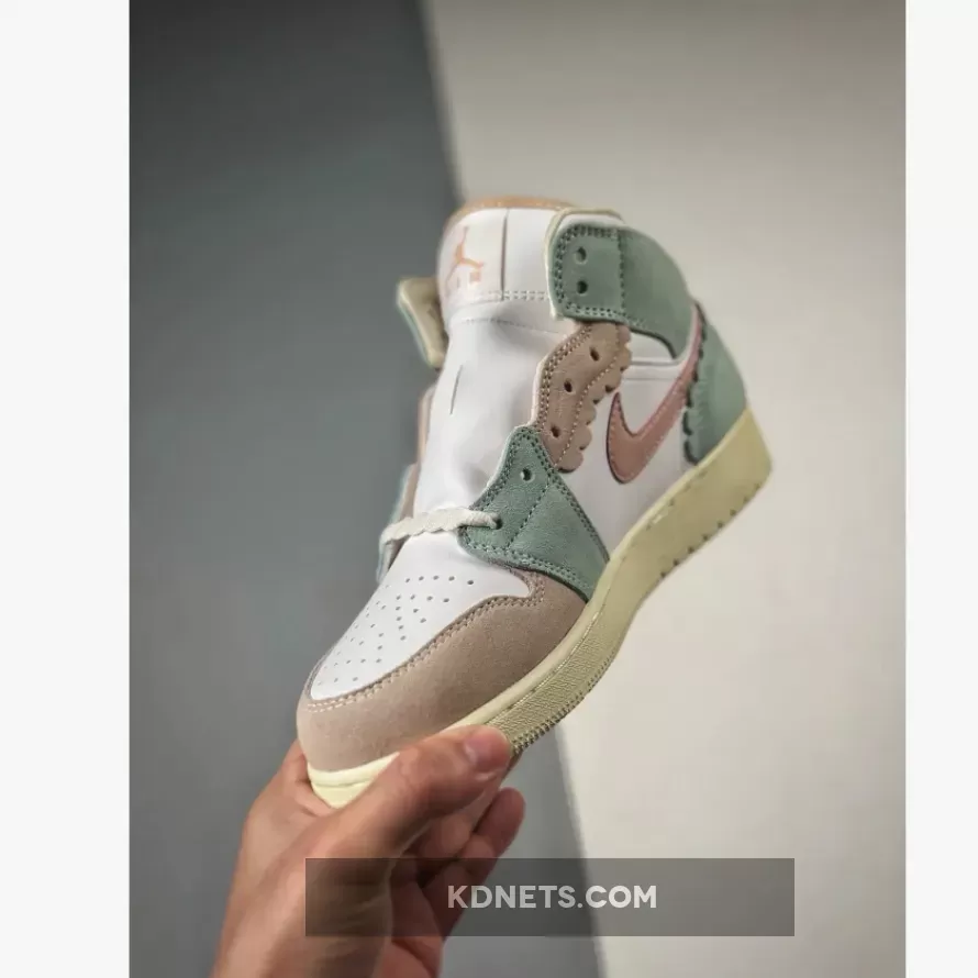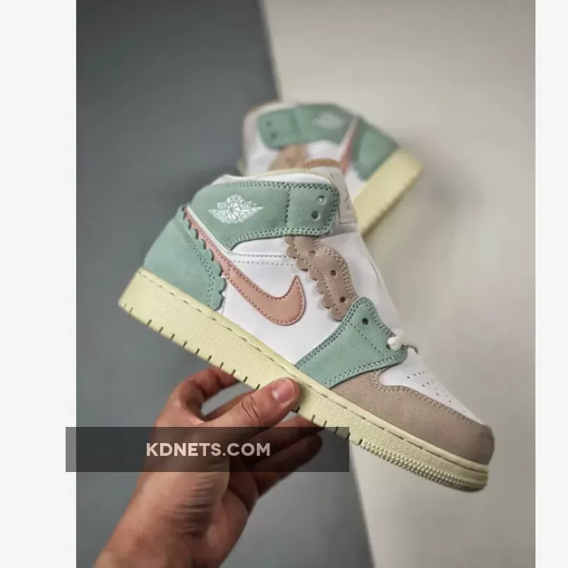 Dressed in a White, Pink Oxford, Jade Ice, Guava Ice, and Coconut Milk color scheme. This offering of the mid-top Air Jordan 1 comes constructed with a White leather base, suede pastel-colored overlays detailed with scalloped edges. Pale orange comes in via the mudguard and upper eye stays, while the lower eye stays, collar overlay and heel panel introduce a soft mint. Branding-wise, you get the signature Swoosh motif partially nestled under one of the scalloped trims for a fun, summery touch. Finally, the gum midsoles introduce a sandy-beige hue and come textured with micro spikes and ridges for traction.