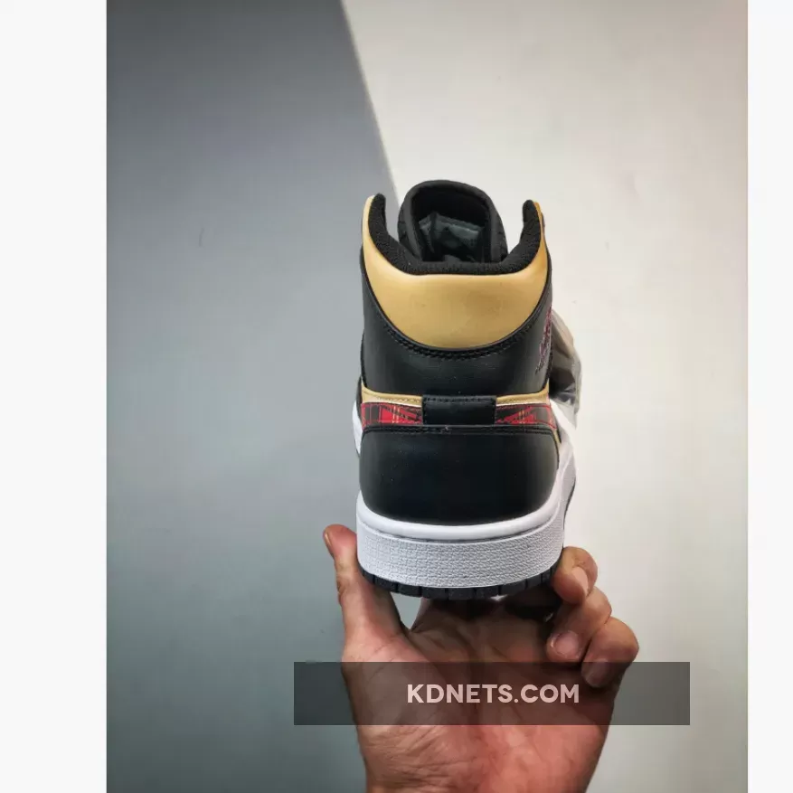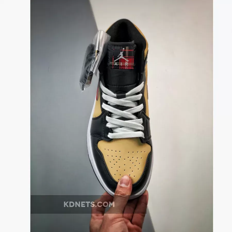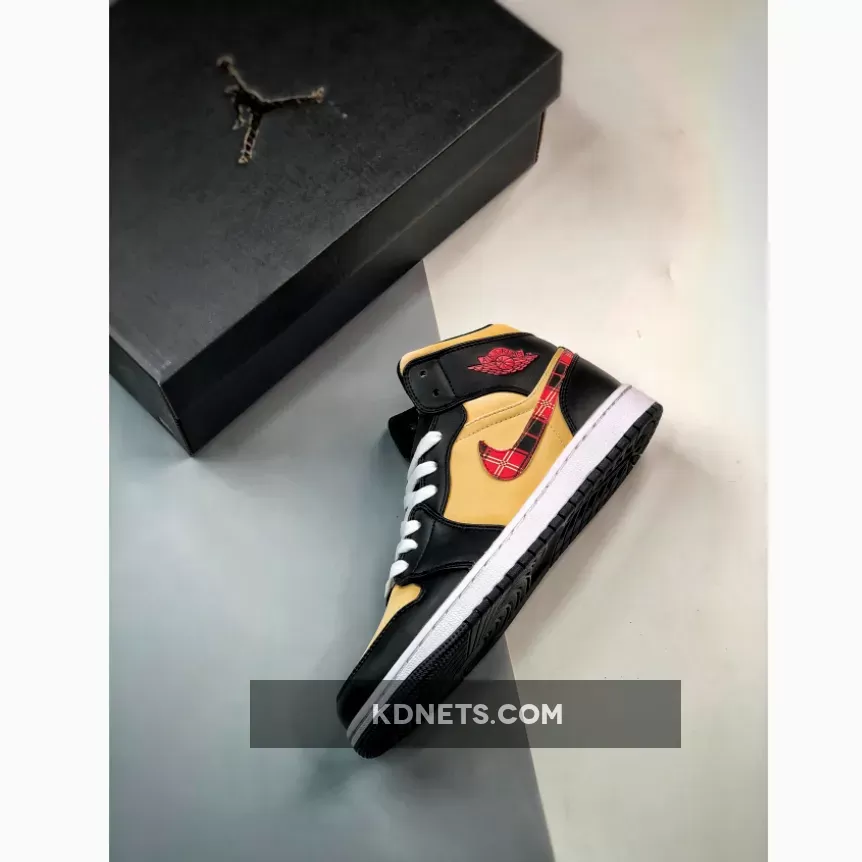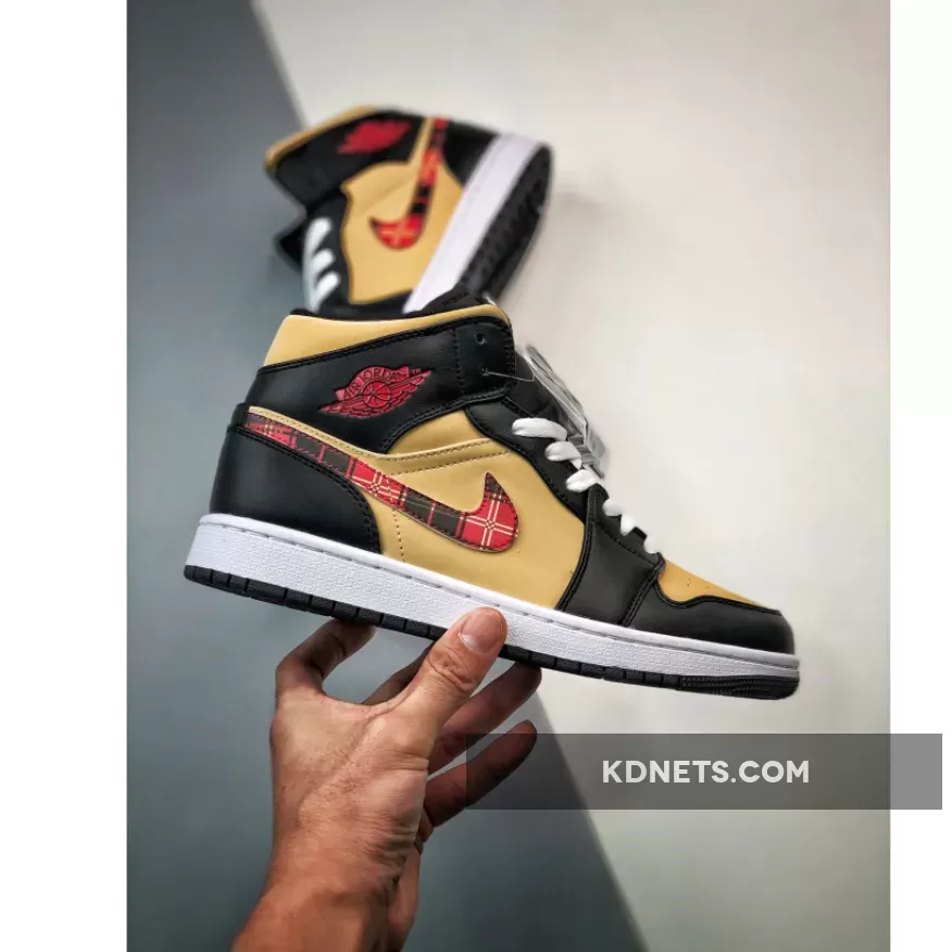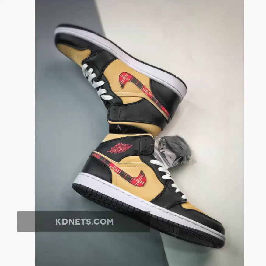 the Air Jordan 1 “Tartan Swoosh” Mid sees black overlays wrap their way around the shoe, while a red, black and tan tartan Nike Swoosh sweeps across its sidewalls.