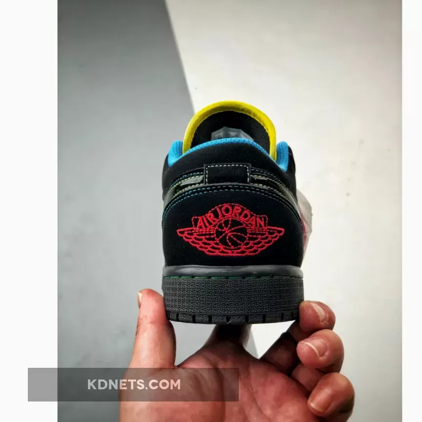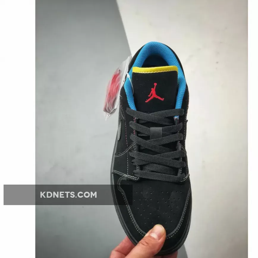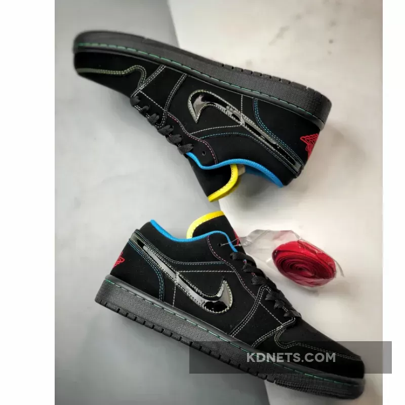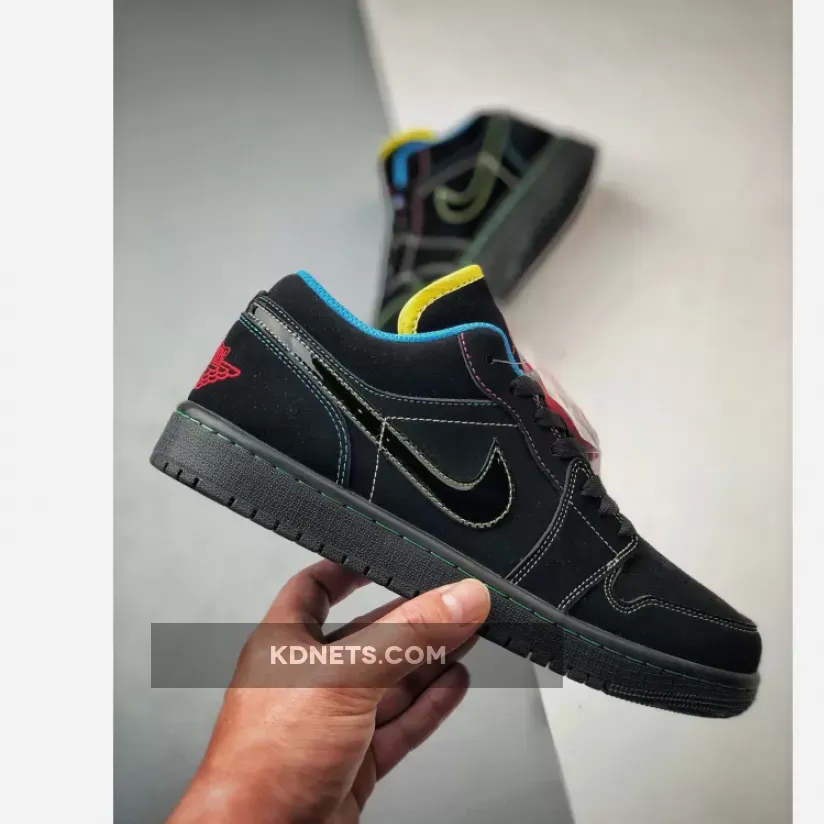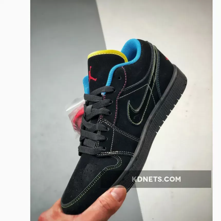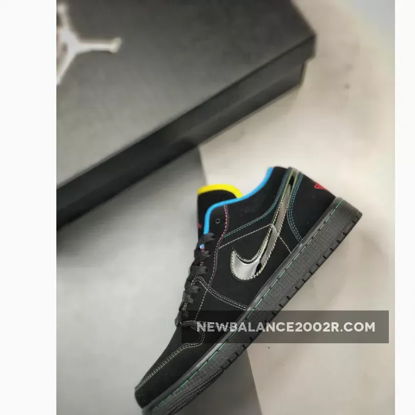 the Air Jordan 1 Phat Low in a black nubuck upper with a glossy faux-croc-skin swoosh and multi-colored contrast stitching.
