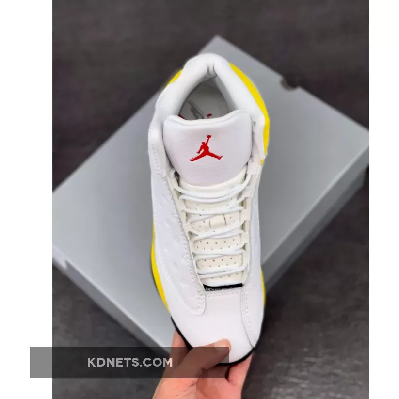 Dressed in a White, University Red, Del Sol, and Black color scheme. This Air Jordan 13 is expected to feature White leather on the panels, toe, and tongues with a matching liner. Other details include Yellow (Del Sol) suede overlays, Red appearing on the Jumpman tongue and outsole completed with a Black rubber sole.