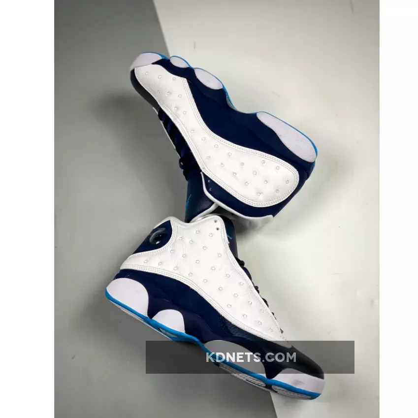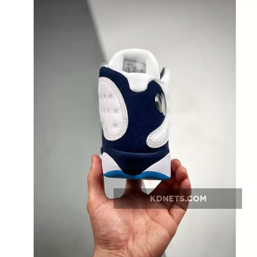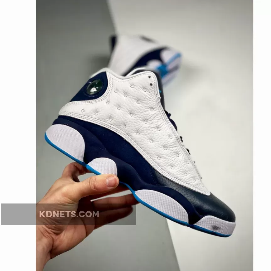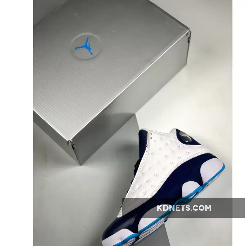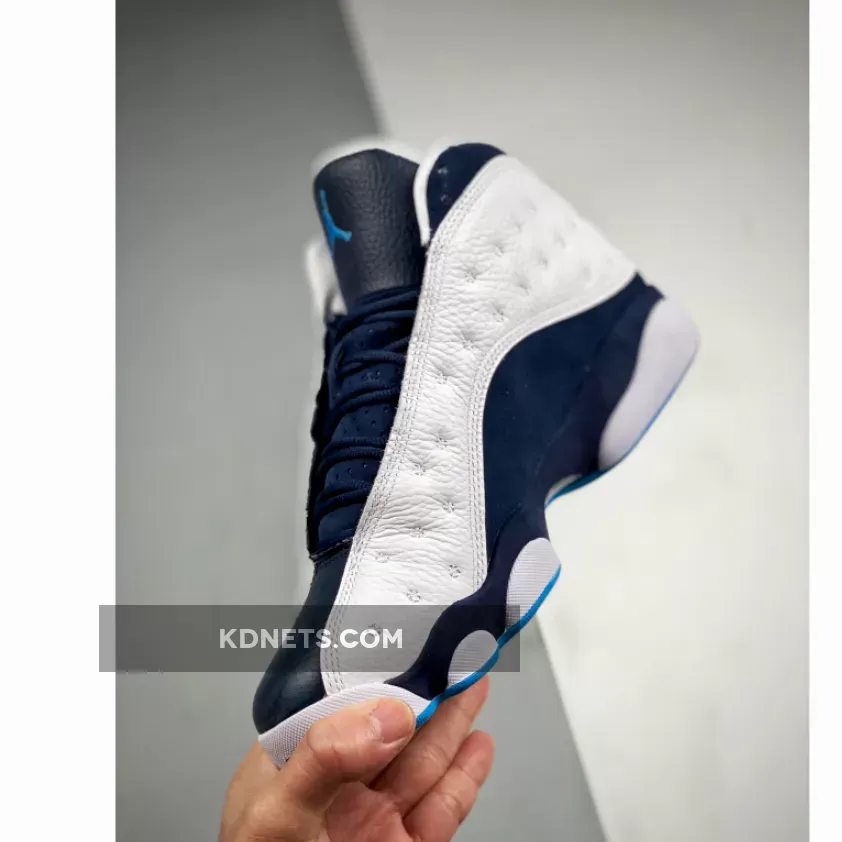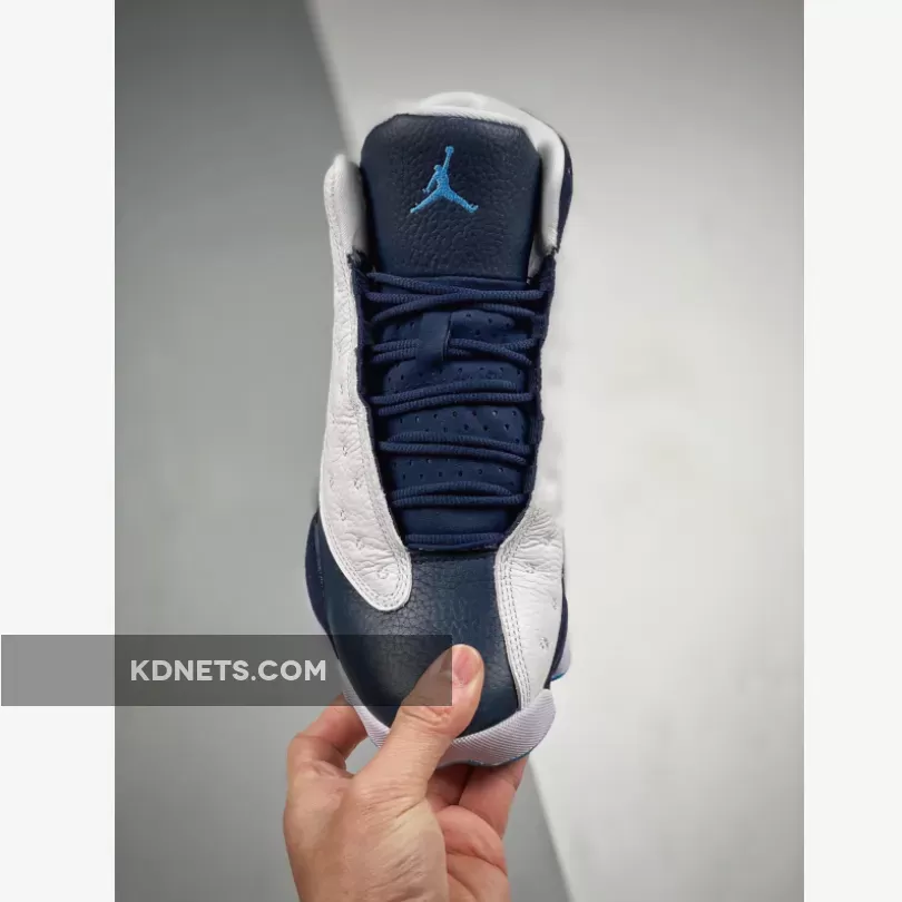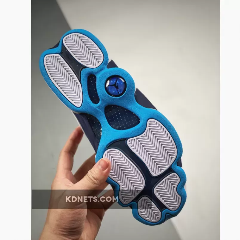 Dressed in a White, Obsidian, and Dark Powder Blue color scheme. This Charlotte Hornets-themed Air Jordan 13 features a White leather upper with Dark Blue underlays along with Light Blue accents on the tongue’s Jumpman logo and rubber outsole.
