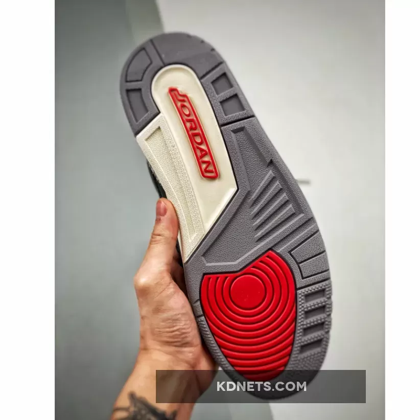 “Cement Grey” detailing is brought back to the upper and outsole while “Fire Red” accents the Jumpman on the tongue, the sockliner and some of the eyelets.