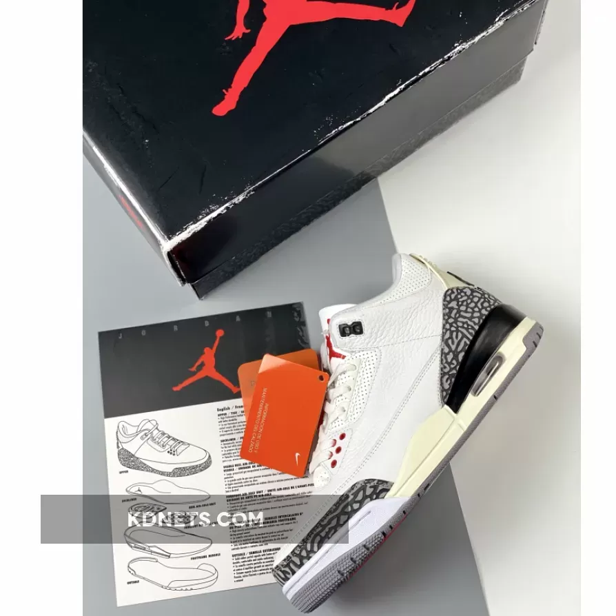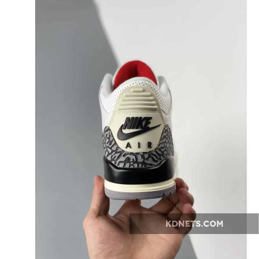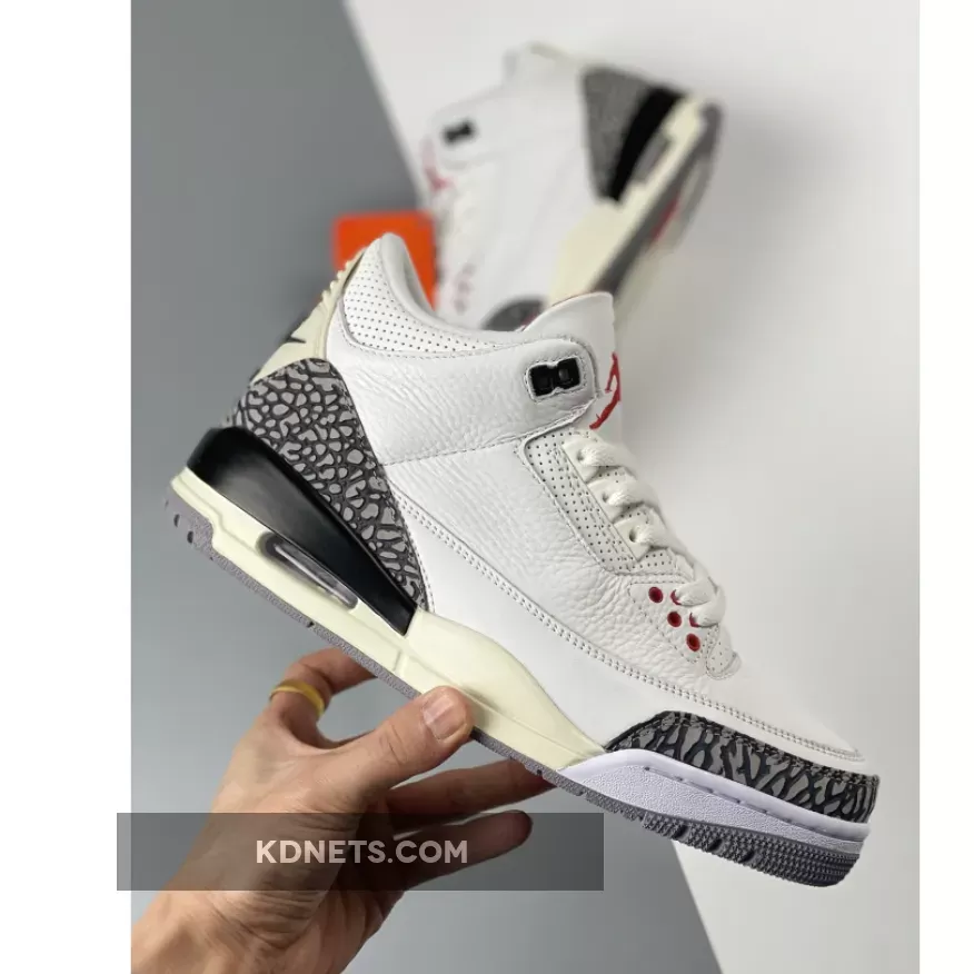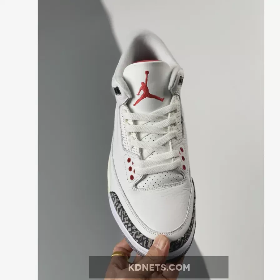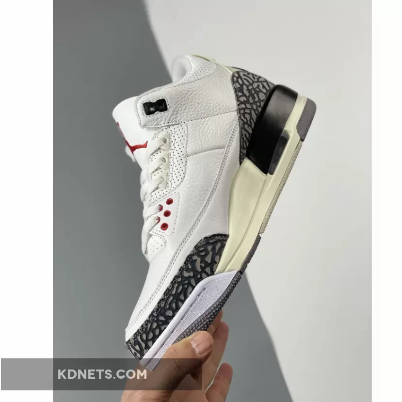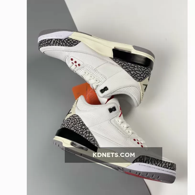 The Air Jordan 3 White Cement Reimagined will express the classic mix of Summit White/Fire Red/Cement Grey with a design inspired by the debut 1988 release. The uppers feature premium white leather with perforated sections paired with Elephant print overlays at the toe and heel regions. Details include a Red Jumpman on the tongues, Nike Air on the heels, elephant print overlays on the toes and heel, White laces and a Red insole with Black Nike Air branding on it.
