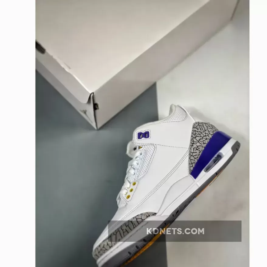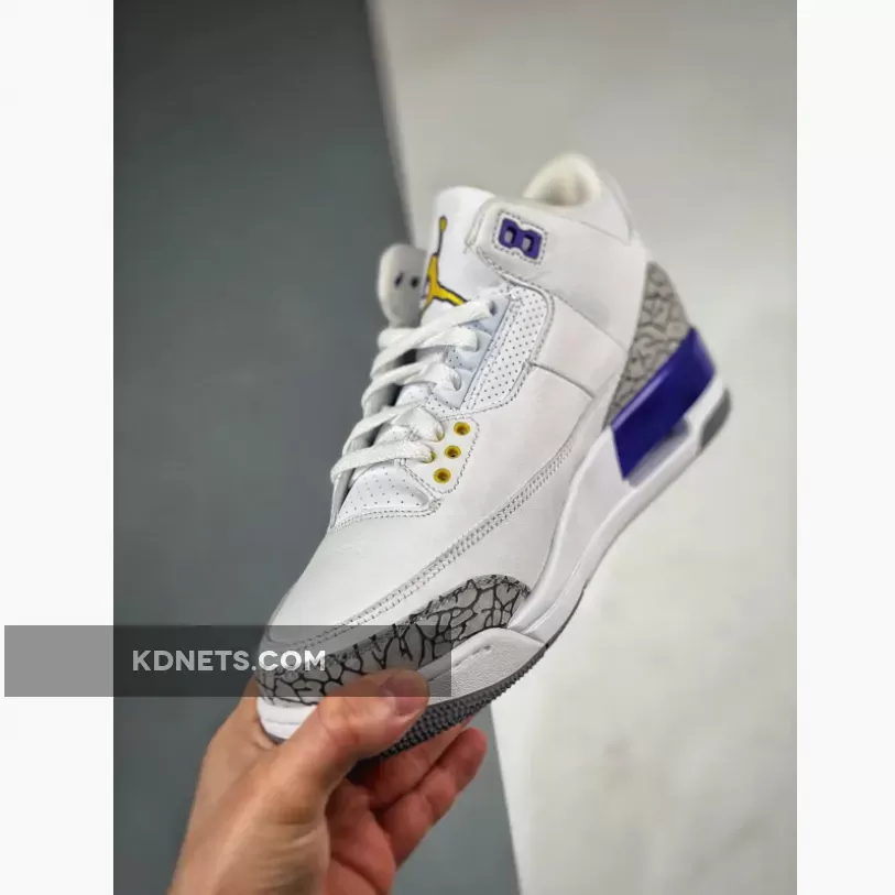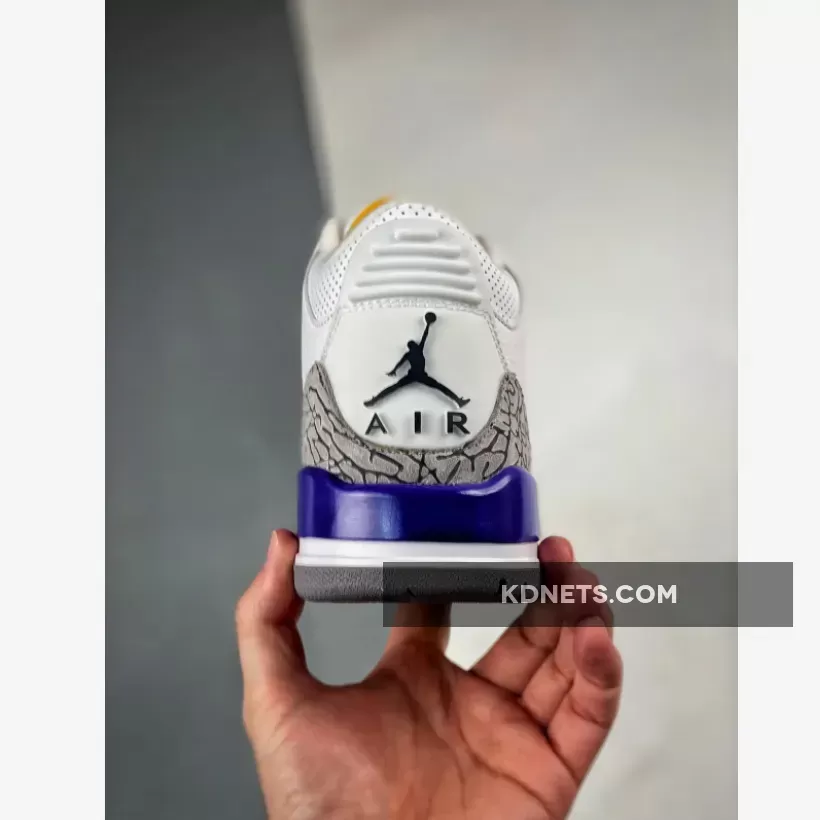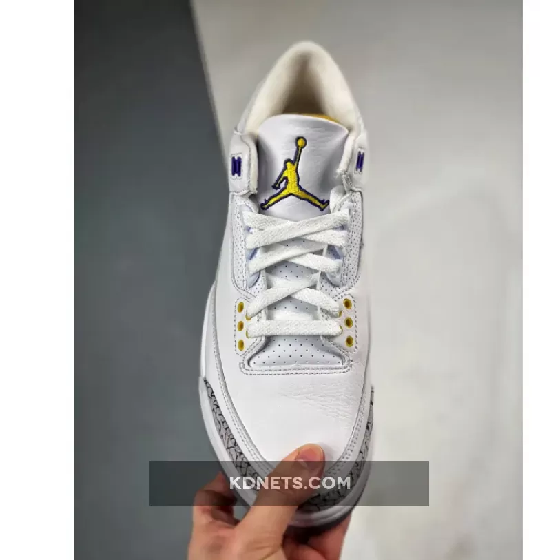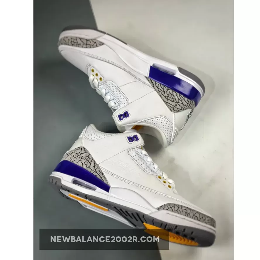 The pair comes with tradition white leather and cement elephant print, but Lakers gold and purple shades hit the heel, Jumpman branding, and lining.