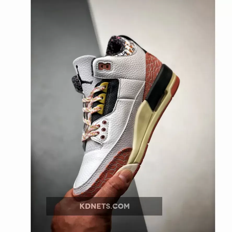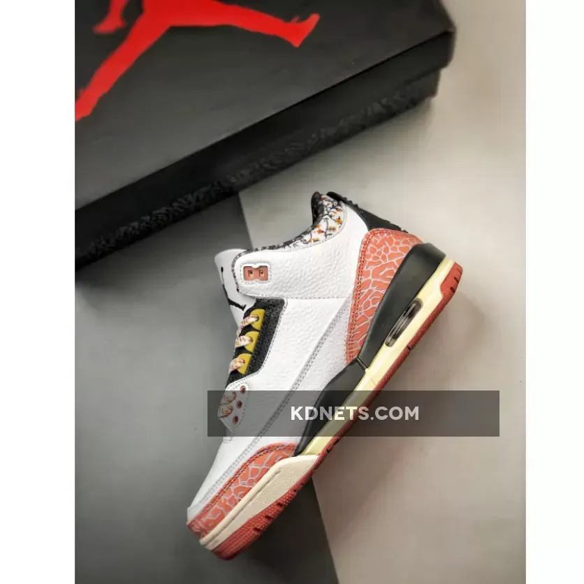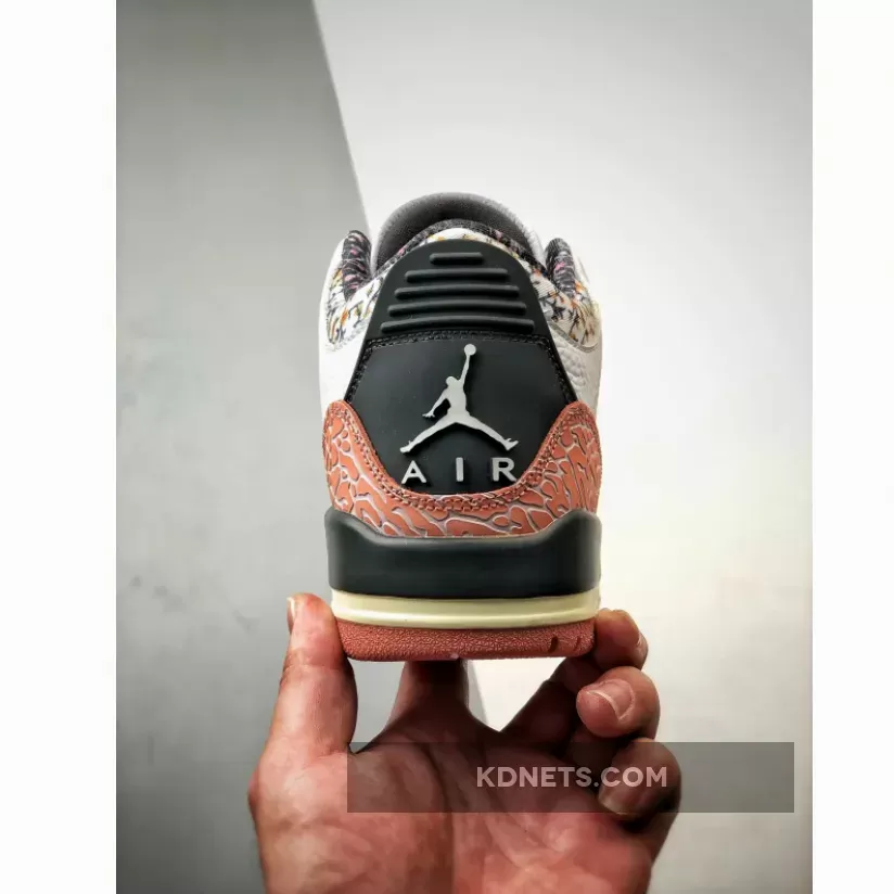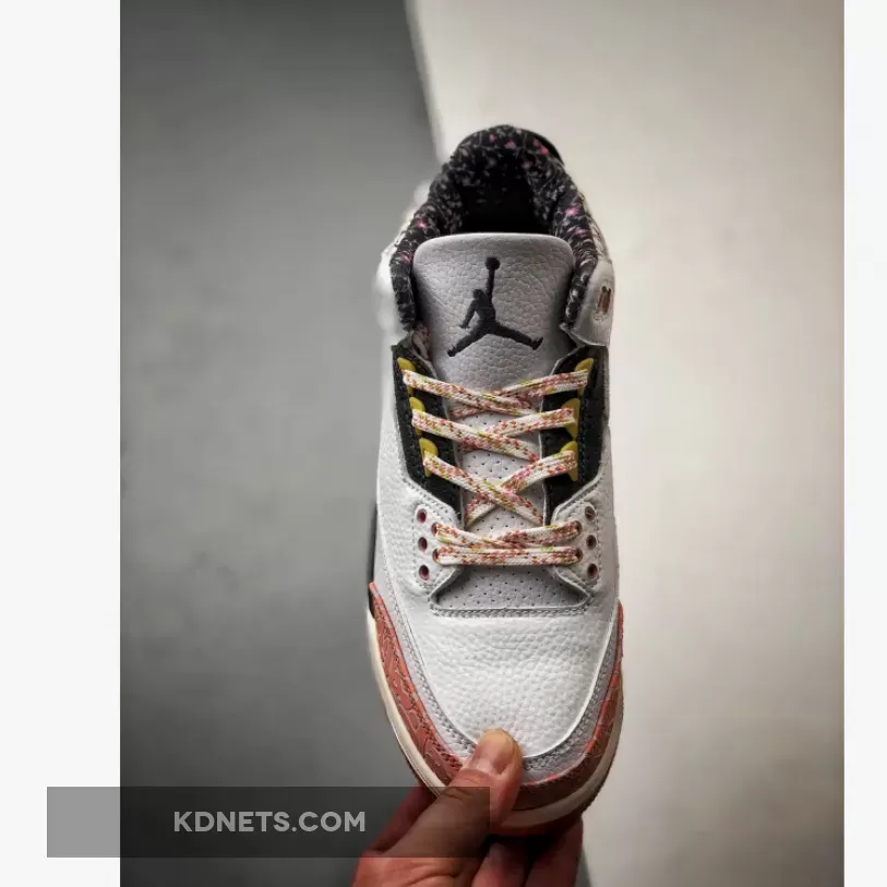 Despite the fresh design elements, classic Air Jordan 3 features remain. The iconic elephant print, a signature detail of the model, is present on the toe guard and heel, maintaining the sneaker’s connection to its heritage. The laces, dotted in a mix of pink and white, complement the overall color scheme of the sneaker.