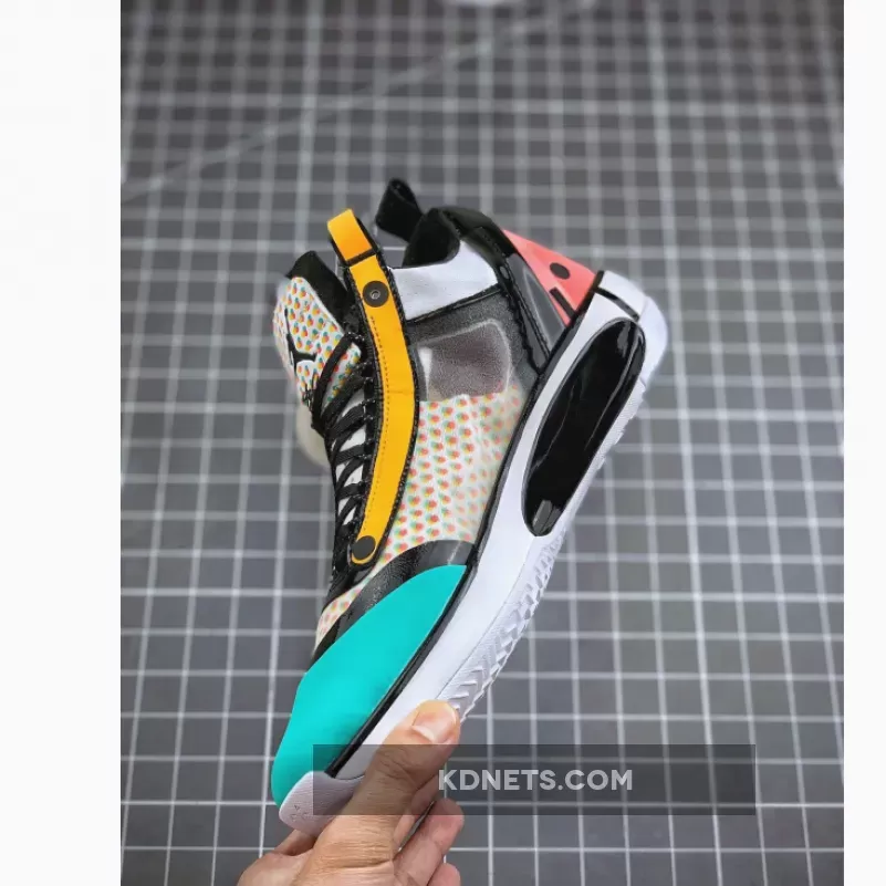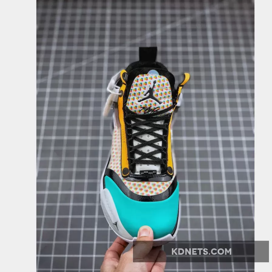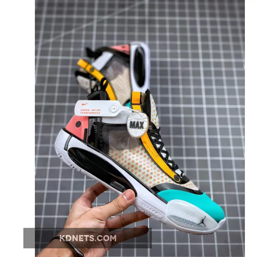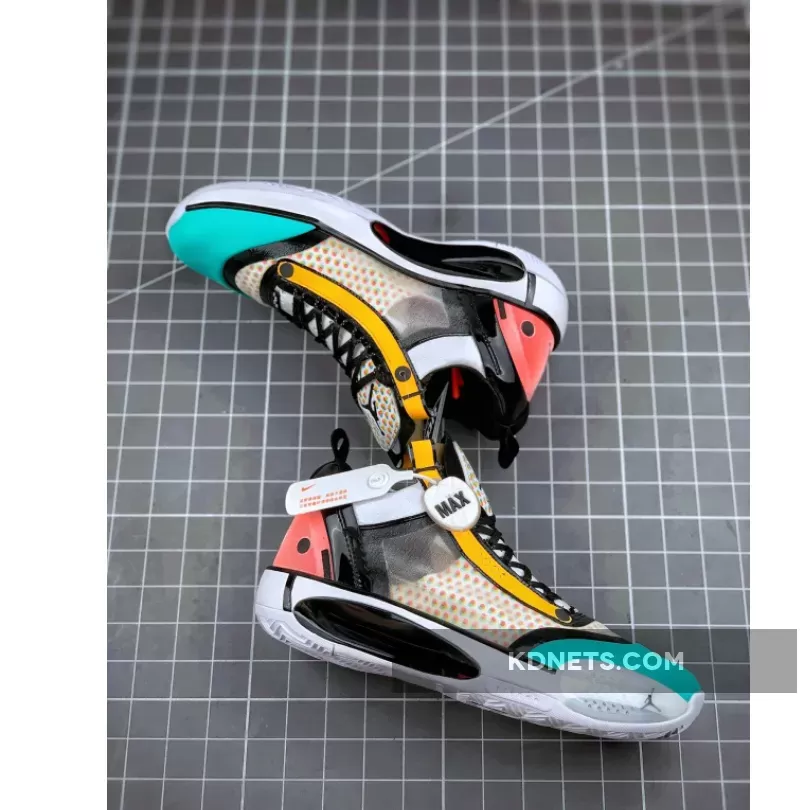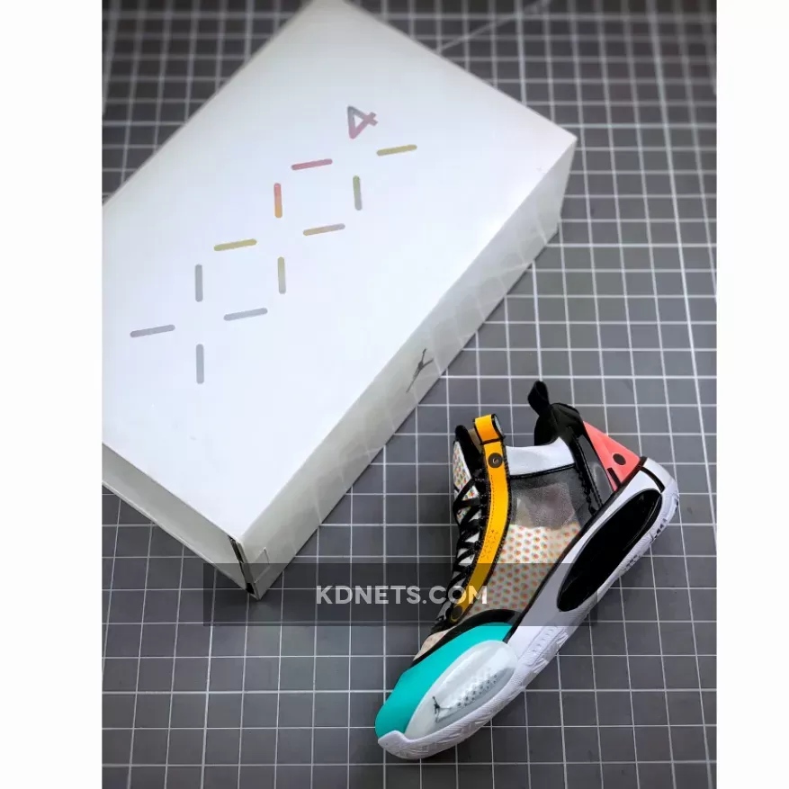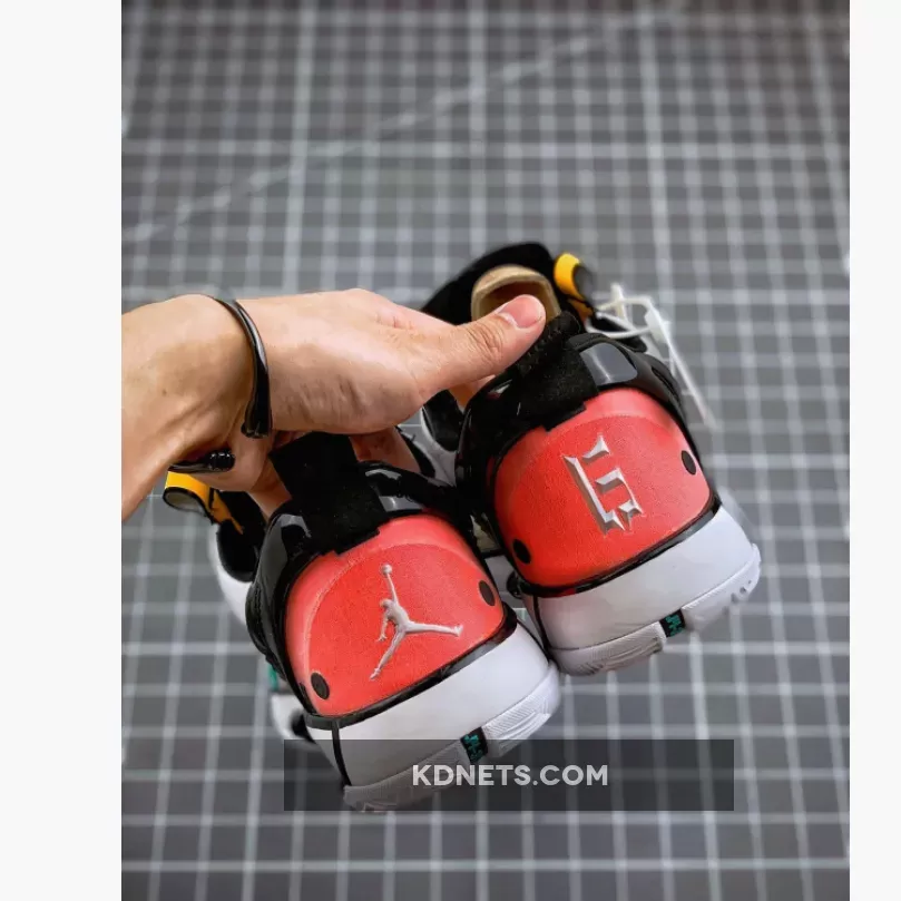 This offering of the low-top Air Jordan XXXIV sports a colorful color blocking with special characters appearing on the inner tongues. Additional details includes Guo’s logo on the right heel in Silver completed with a White rubber sole.