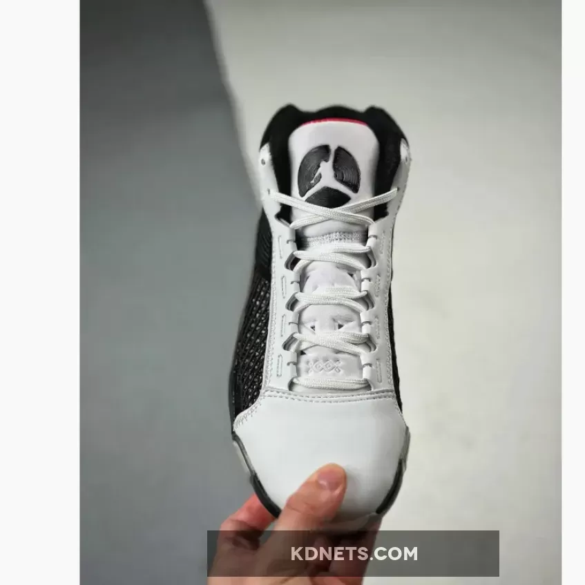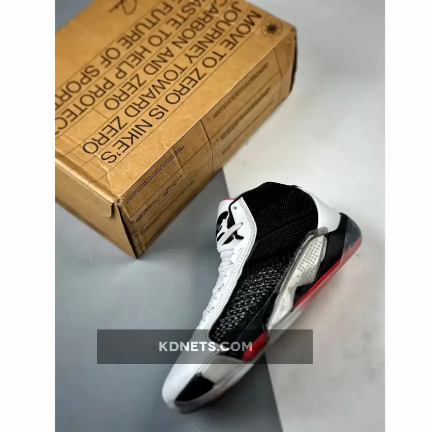 This offering of the Air Jordan 38 comes with a mid-top build features a White base with Black overlay panels along the mudguard and extended up to the ankle area. Along the toe box, tongue, and portions of the eyestays, we see white shades take over, with all but the tongue wrapped in leather.