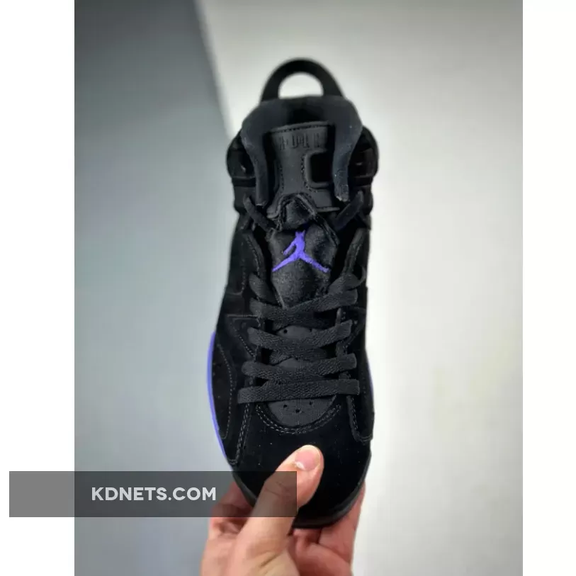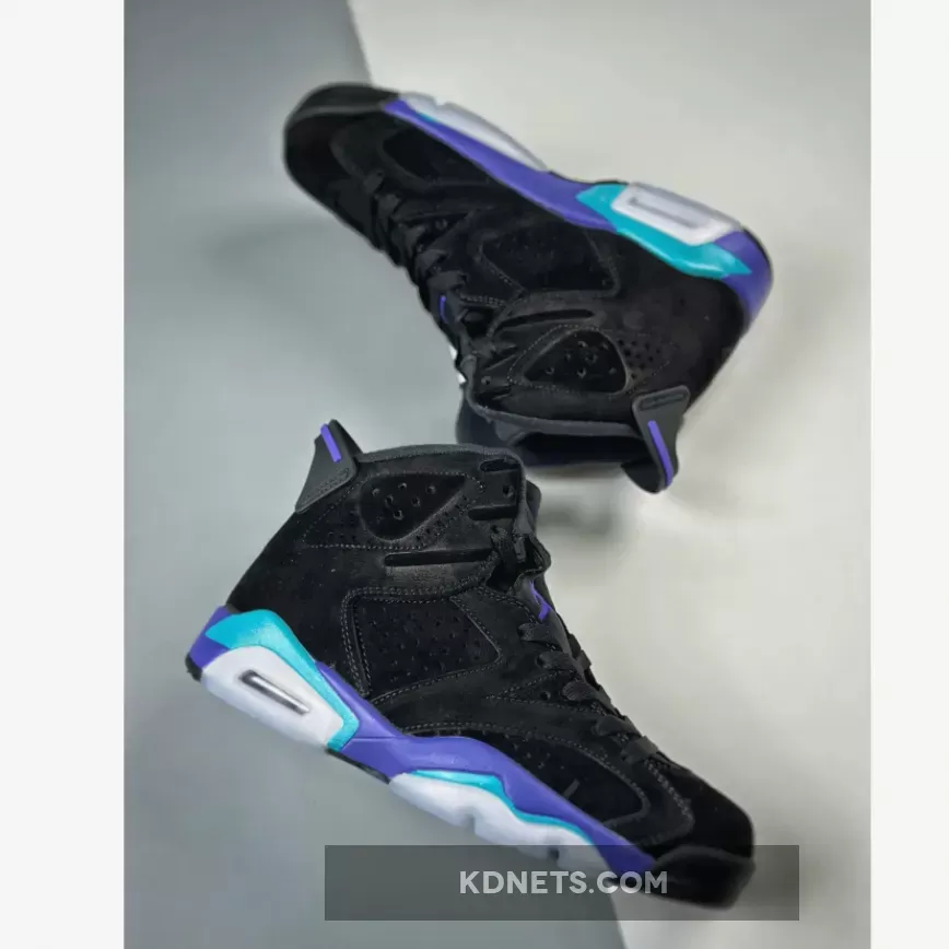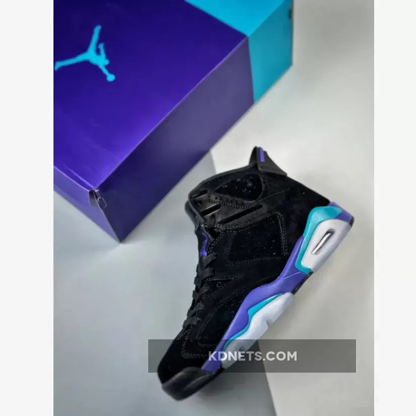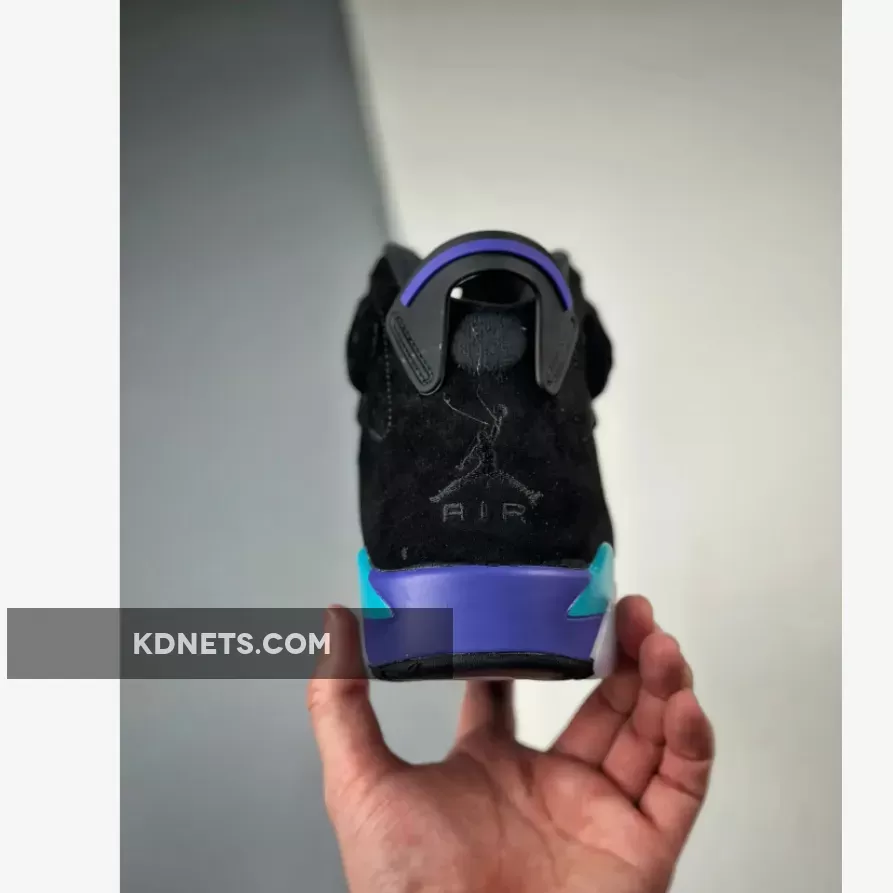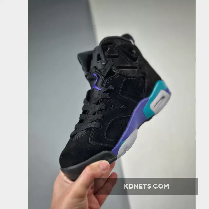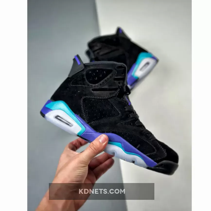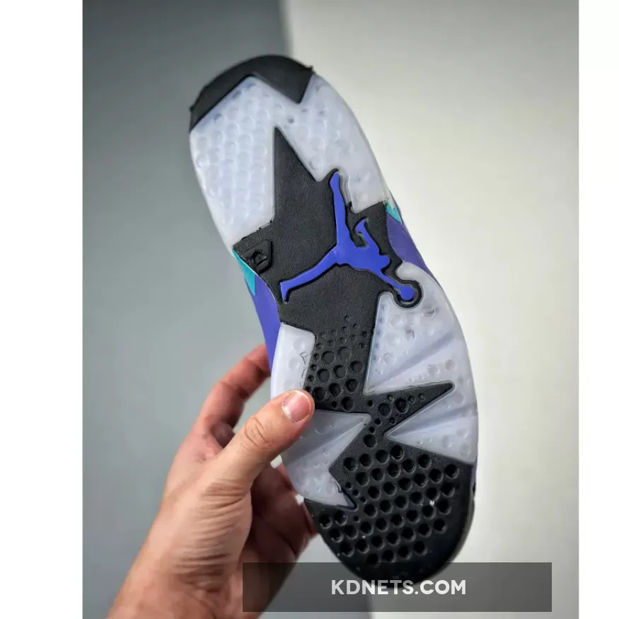 The lower half is where the reference becomes clear, an electric blue and deep purple mixing together on the AJ6’s traditional midsole, foregoing the abstract paint strokes seen on the AJ8 version. Rounding out the final design cues is the black rubber outsole and semi-translucent icy blue rubber near the heel and forefoot.