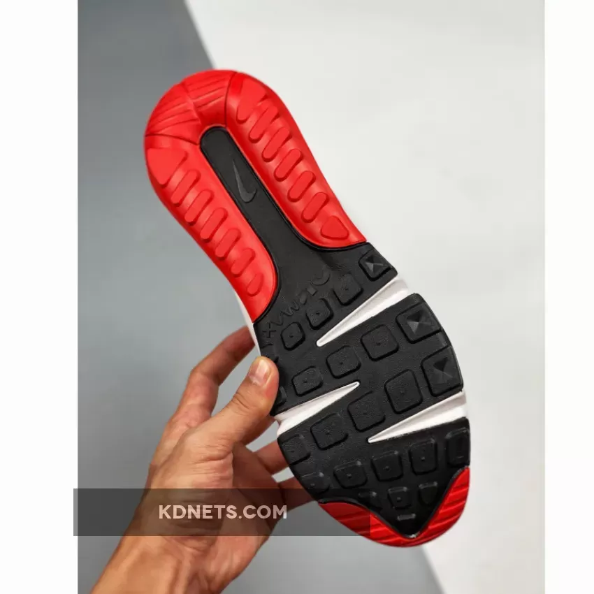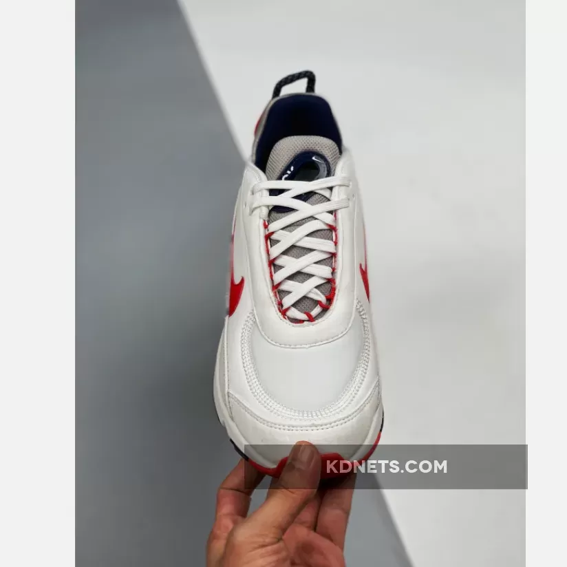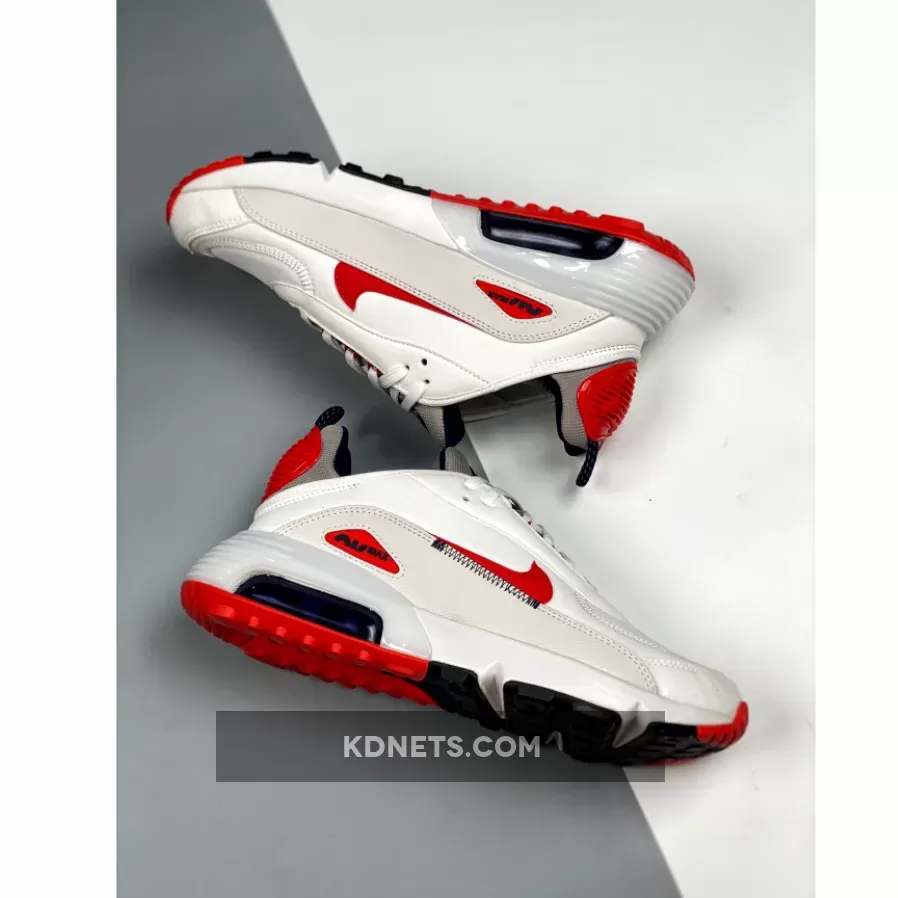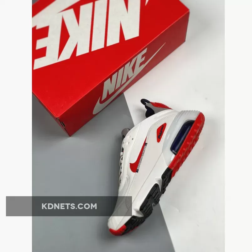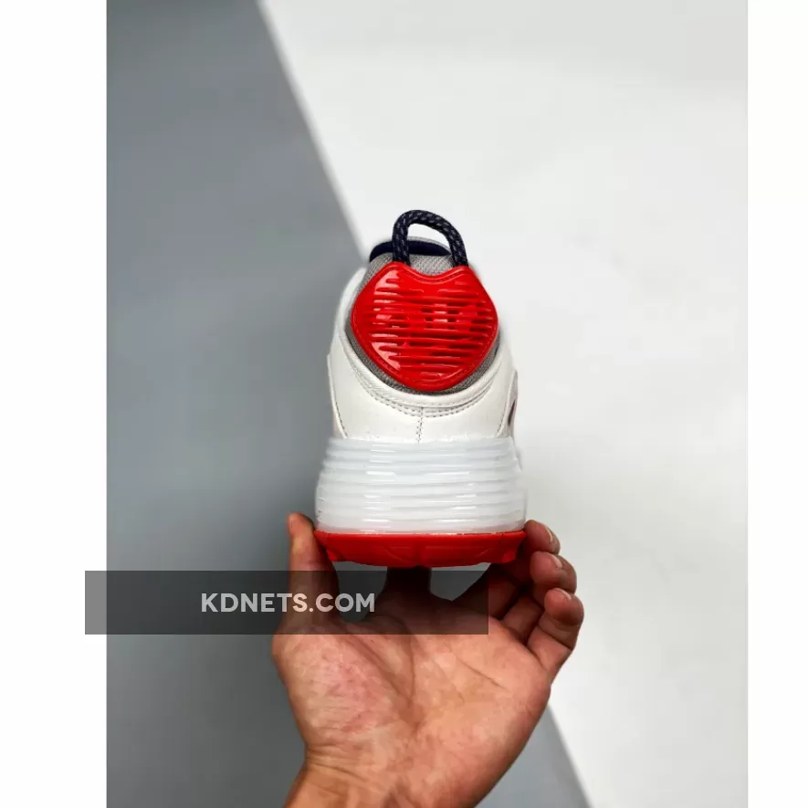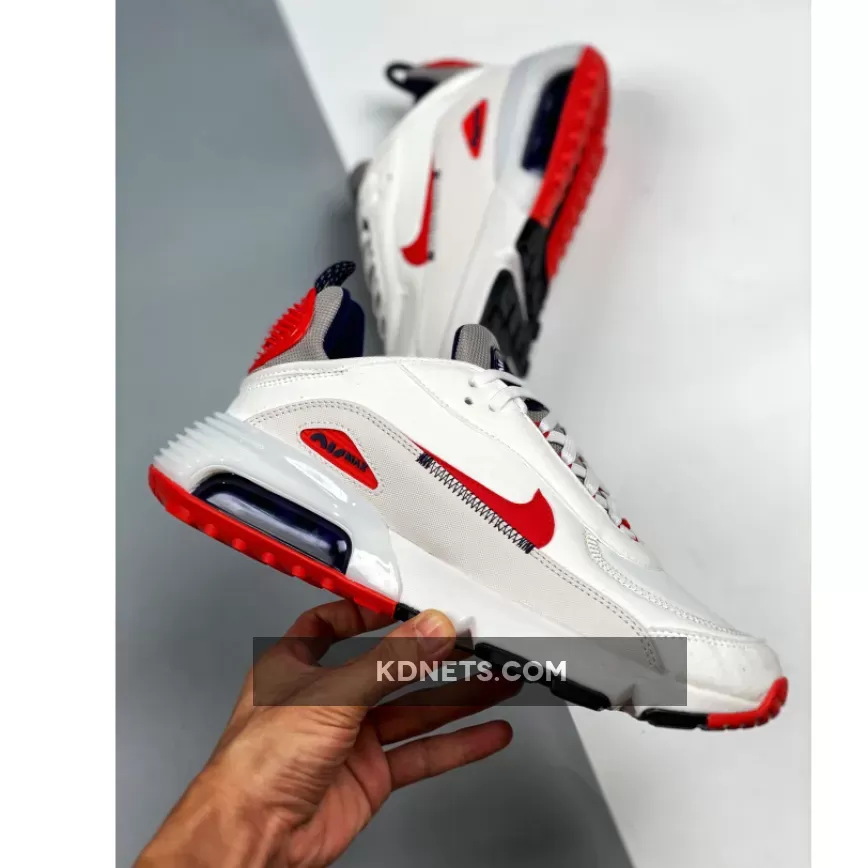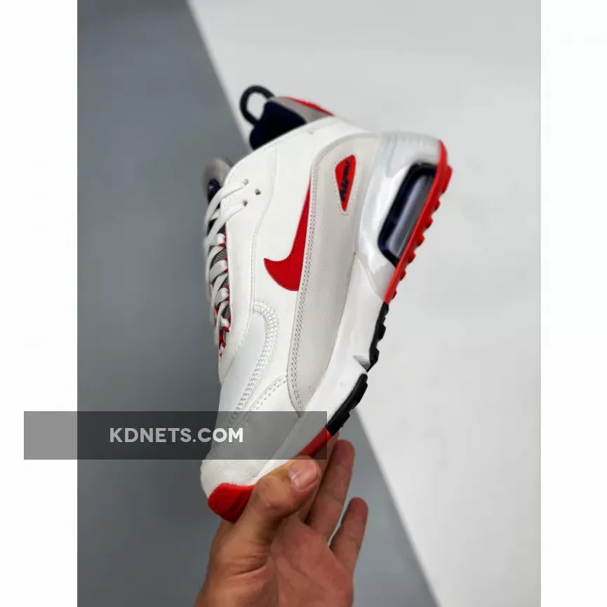 This offering of the Nike Air Max 2090 features a White base constructed with mesh on the toe, fleece covering majority of the upper and textile leather mudguards. Red leather Swooshes, Grey mesh tongues and heels paired with Navy detailing throughout completes the design.