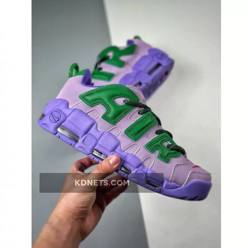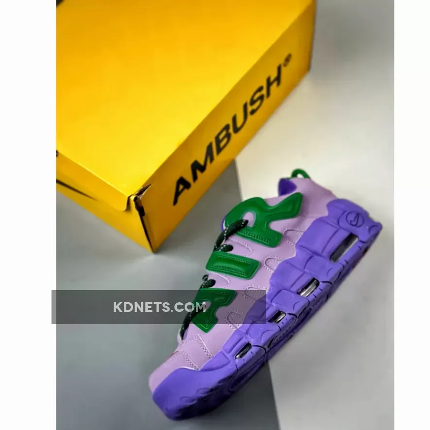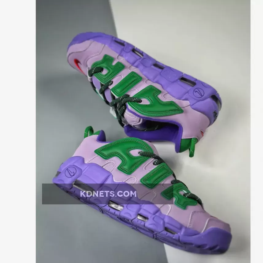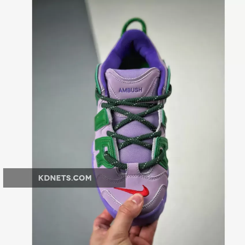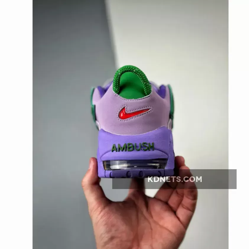 AMBUSH’s Nike Air More Uptempo Low has a “Lilac” nubuck upper with “AIR” lettering across the sidewalls in “Apple Green.” The Nike Swoosh on the toebox is embroidered in “University Red,” which is repeated in bubble form on the heel.