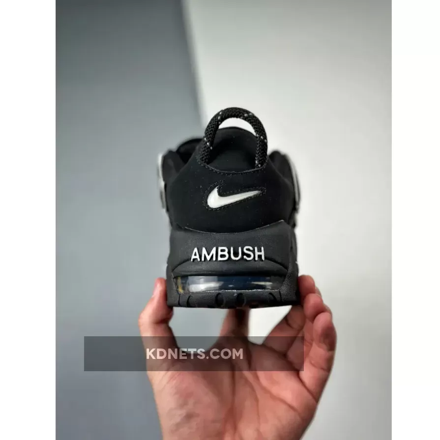 The AMBUSH x Nike Air More Uptempo Low comes in a traditional Black and White scheme of colors. The shoe is made with painstaking attention to detail, with an all-Black nubuck top, mesh tongue flaps, as well as leather “AIR” text highlighted in White.