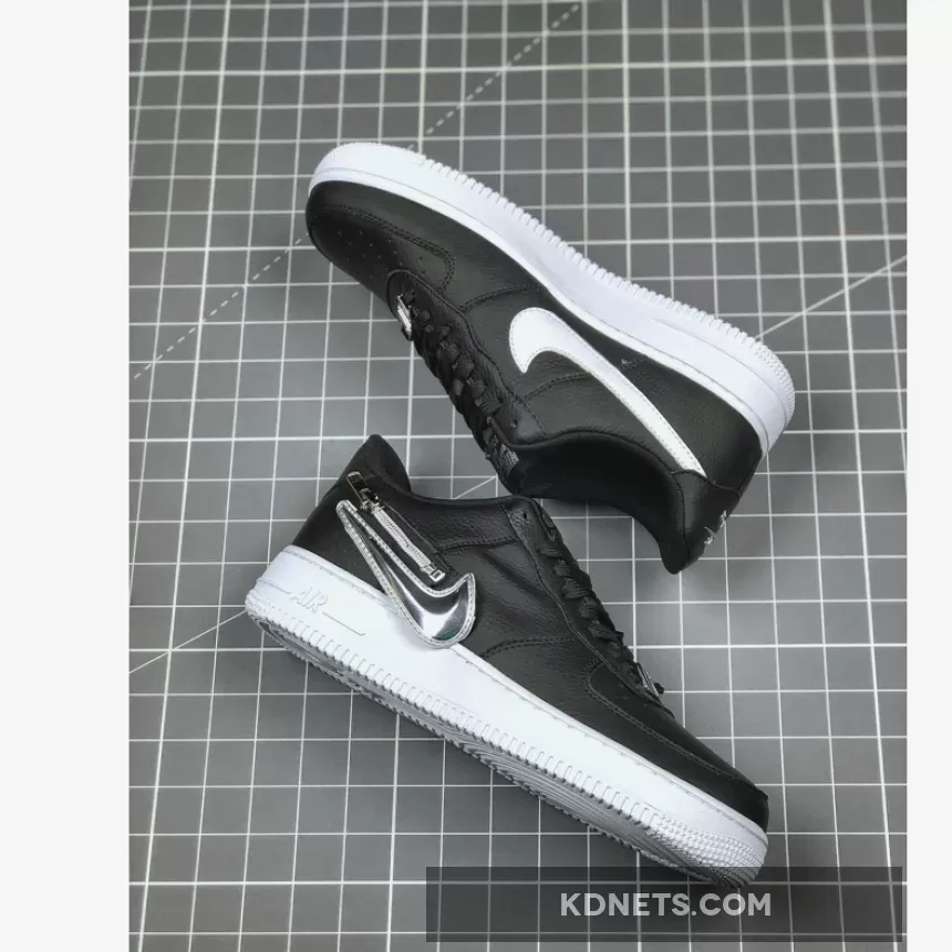 The AF1s are made from premium grained leather and sport a contrasting swoosh emblem on the medial side. Things become more unique, however, on the lateral side where Nike introduces zippable, switchable swooshes. The white pair comes with a pack of red, white and iridescent pink swooshes, while the black pair comes with silver, neon yellow and black offerings. Other unique finishes include a zipper-pull that takes after the Nike swoosh emblem on the white pair, as well as metal “Nike AIR” branding on the heel tab on both colorways. There is also a large silver-toned metal “AIR” lace dubrae, and tongue tags that feature metallic silver lettering.
