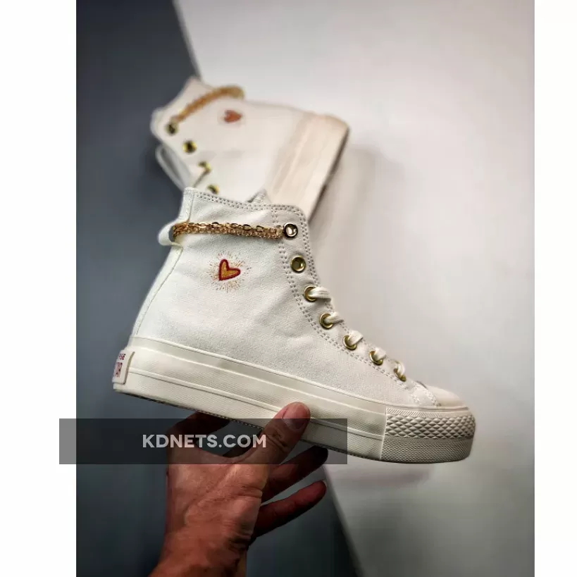 ELEVATED LOVE Bright colours and sun-inspired gold empower love to shine through—inside and out. Covered in radiant elements like gold sholery, these platform Chucks elevate your Valentine’s look.