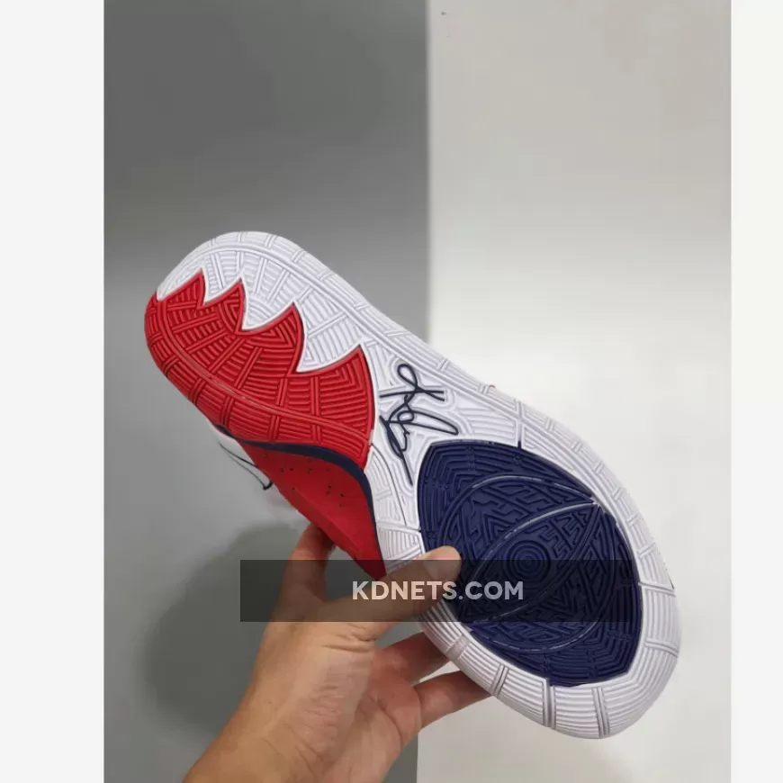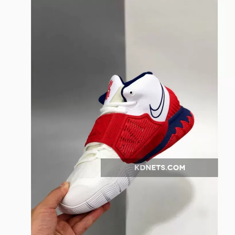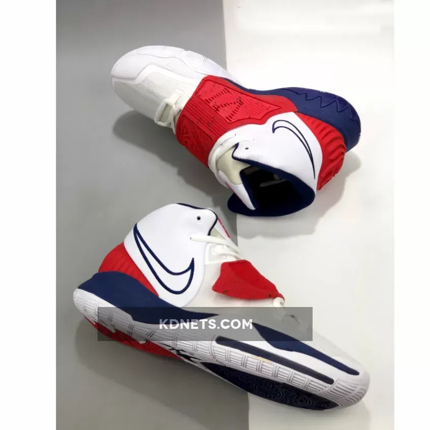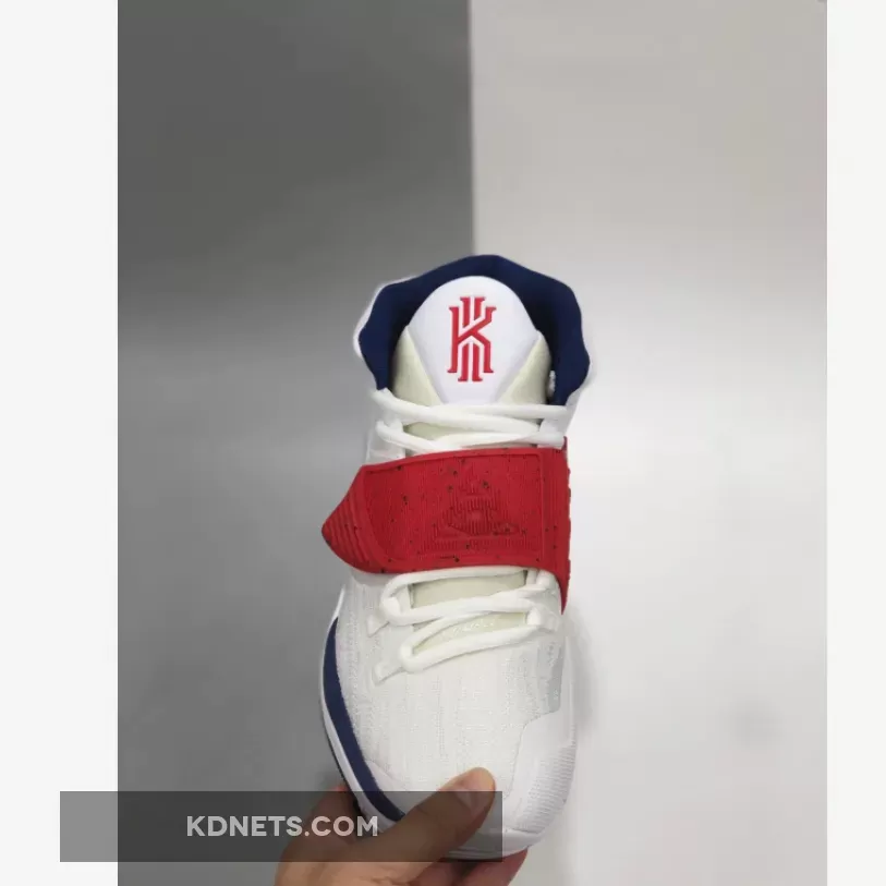 This “USA” edition of the Kyrie 6 sports a White mesh and leather upper paired with Navy embroidered Swooshes, lining, and midsole. Red detailing covers the midfoot strap, tongue branding and heel piece atop a White rubber sole.