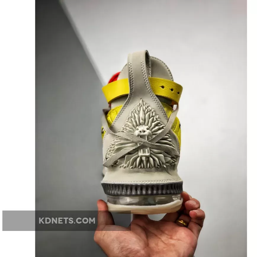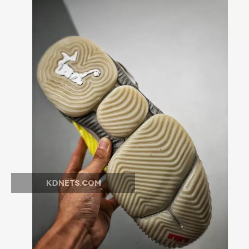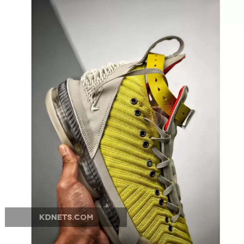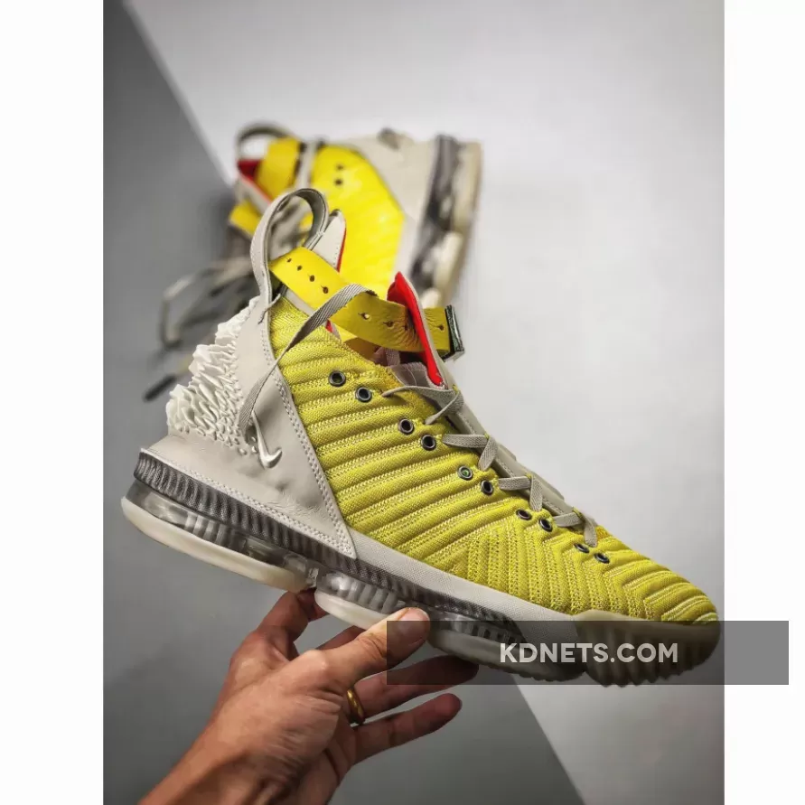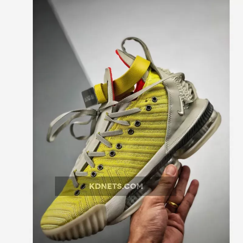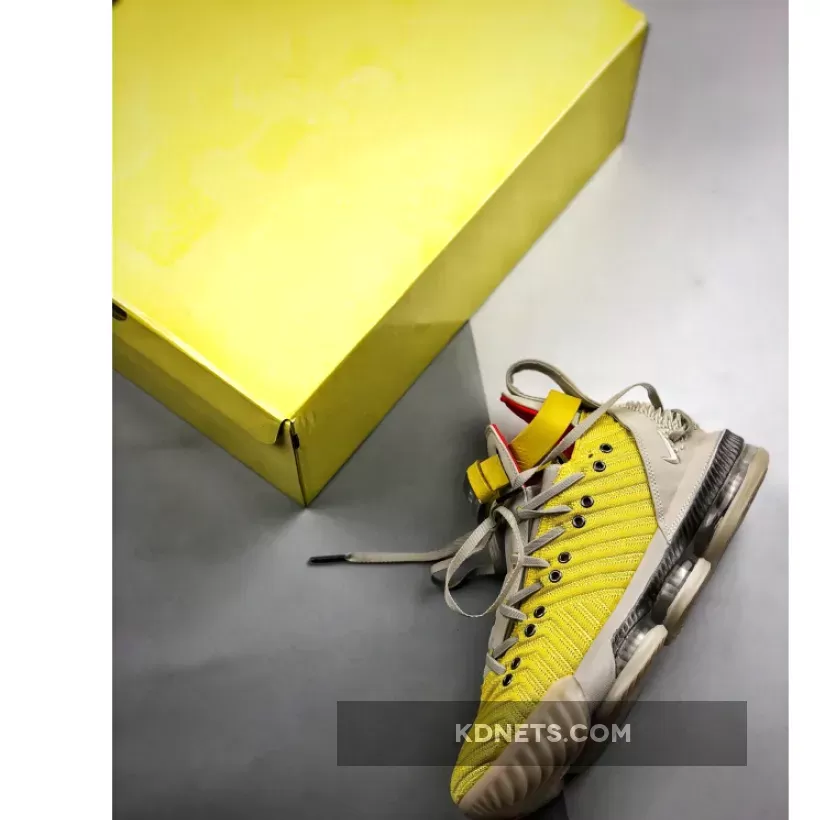 Dressed in a Bright Citron and Summit White color scheme. This HFR x Nike LeBron 16 features a Yellow Battleknit upper, 3D-molded lion’s head that grips the laces in its mouth and a distinctive piece is LeBron’s crown: a detachable leather bracelet you can wear on your wrist.