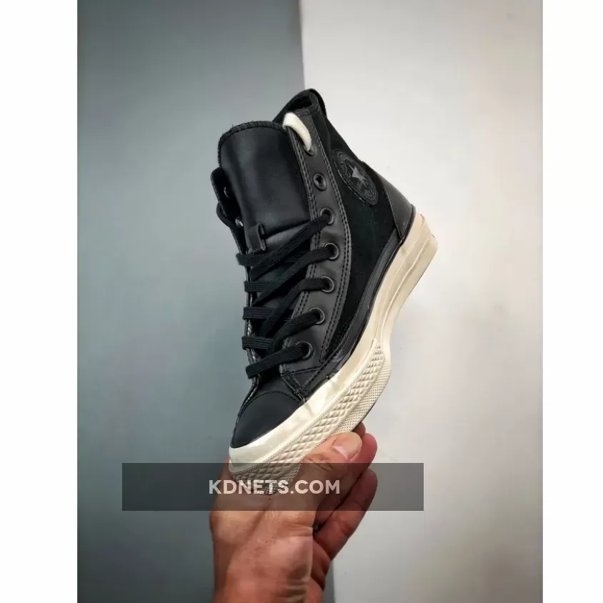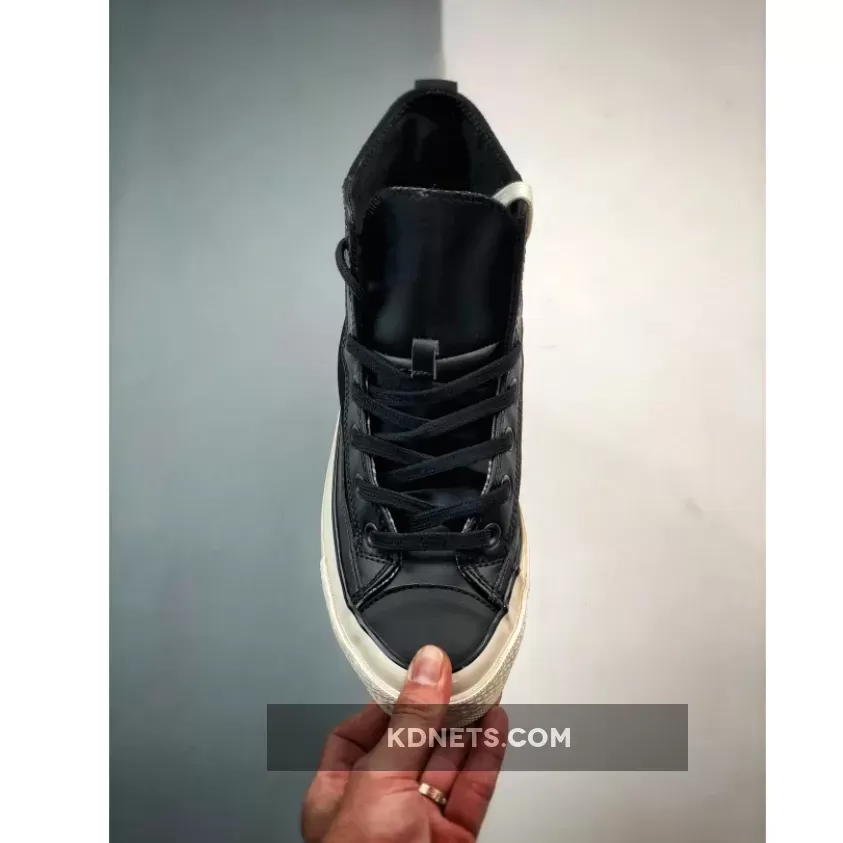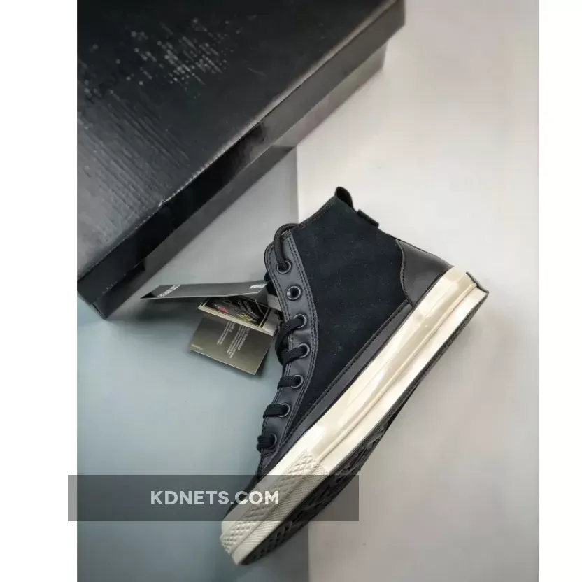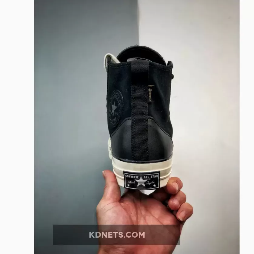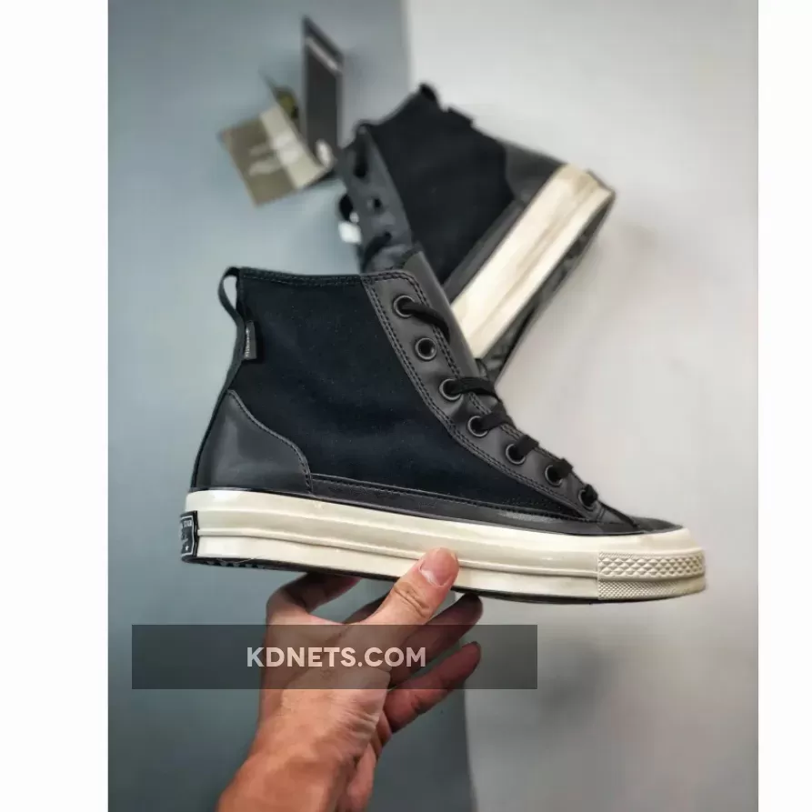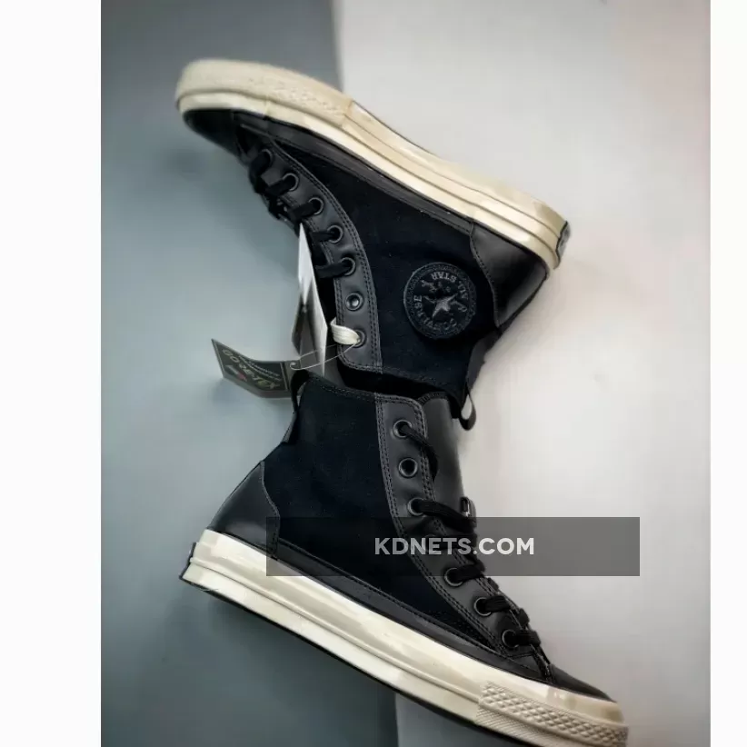 this Chuck 70 High Top is the polar opposite. Firstly, the colour scheme is bold and monochromatic black, including the leather overlays, toe box, and heel cap. The Gore-Tex walls make sure your feet are comfortable, fresh, and snug regardless of the season. The entire boot is ready to adapt to all your footstrikes, fashions, and moods. Finally, the Egret white Converse midsole and black dual brand license plates finish the look.