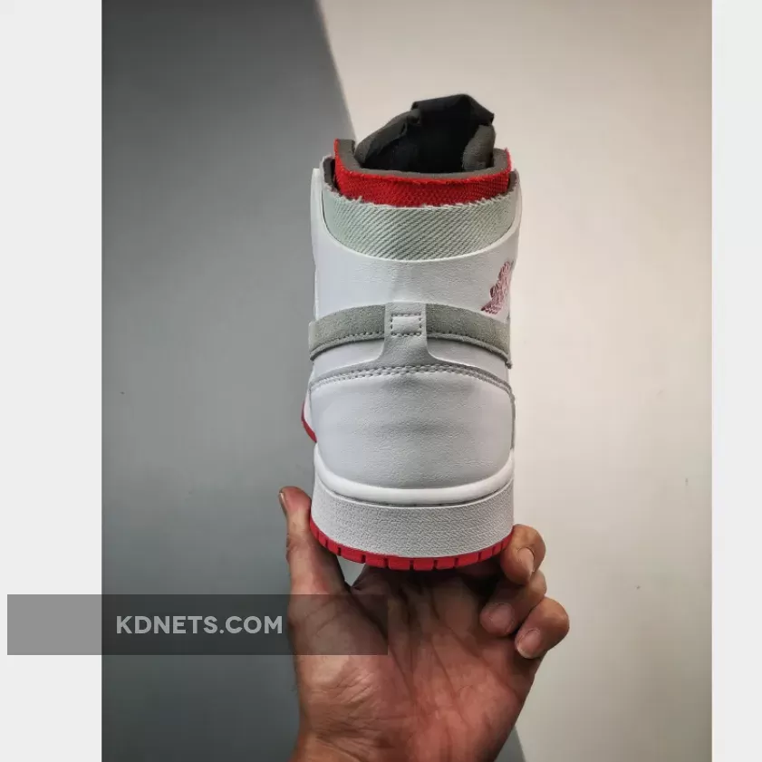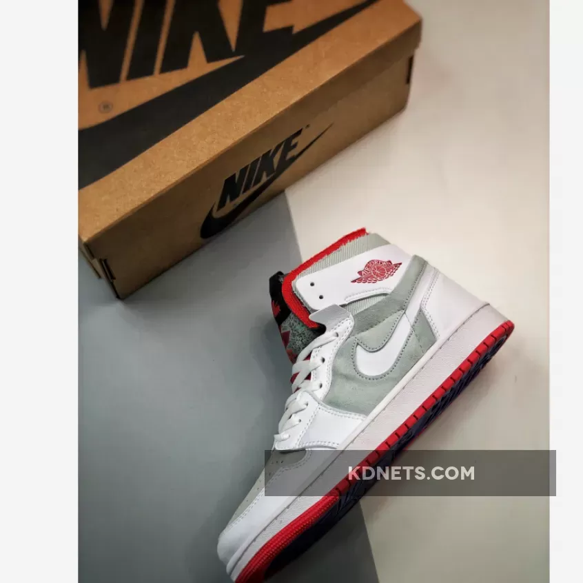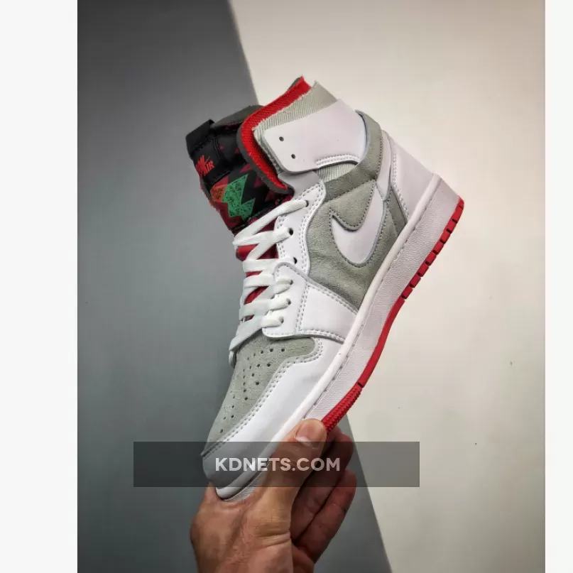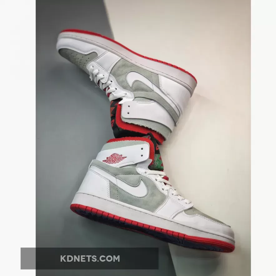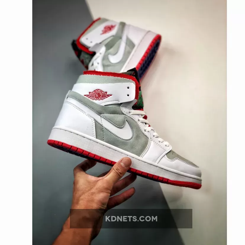 The Air Jordan 1 High Zoom Comfort ‘Hare’ features a familiar design borrowed from an OG Air Jordan 7 colorway of the same name. Inspired by a ‘90s ad campaign that teamed up Michael Jordan with Bugs Bunny, the high-top combines a light grey suede base with white leather overlays at the forefoot and heel. Exposed foam construction is utilized on the collar and tongue, accented with a multicolor print and branded with a woven Zoom Air tag. The white rubber midsole packs a Zoom Air unit in the heel for a comfortable ride. Underfoot, the outsole combines injected EVA in Dark Concord with durable crimson rubber throughout the perimeter.