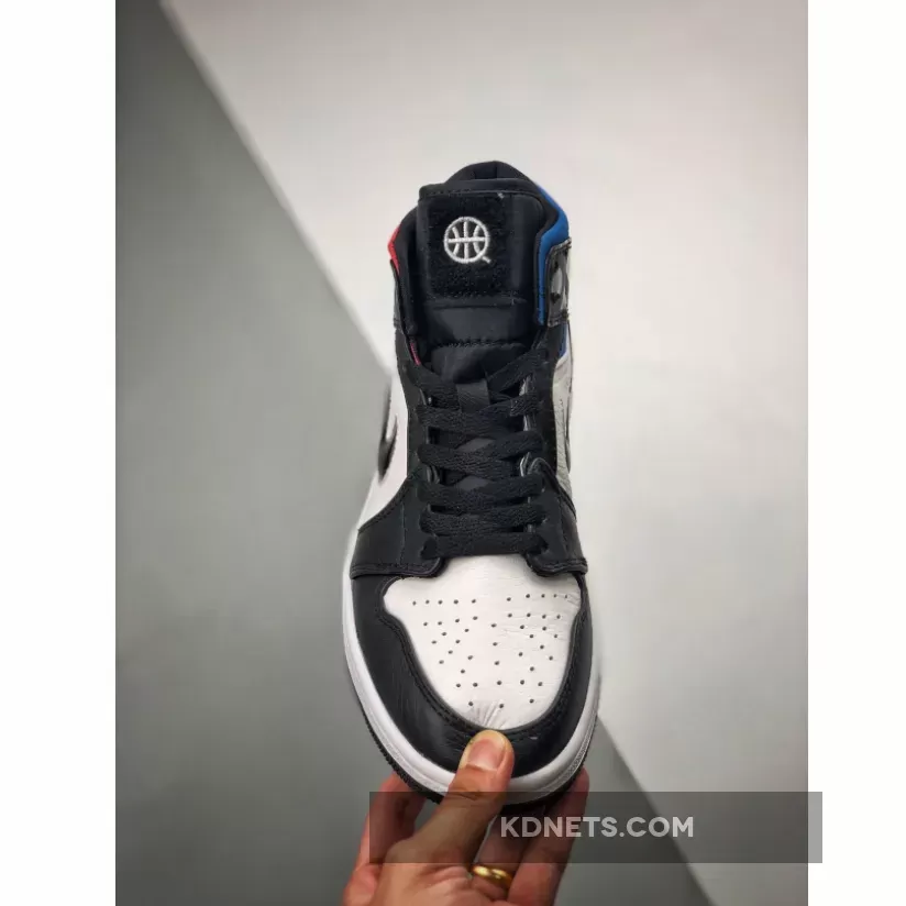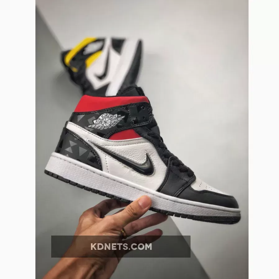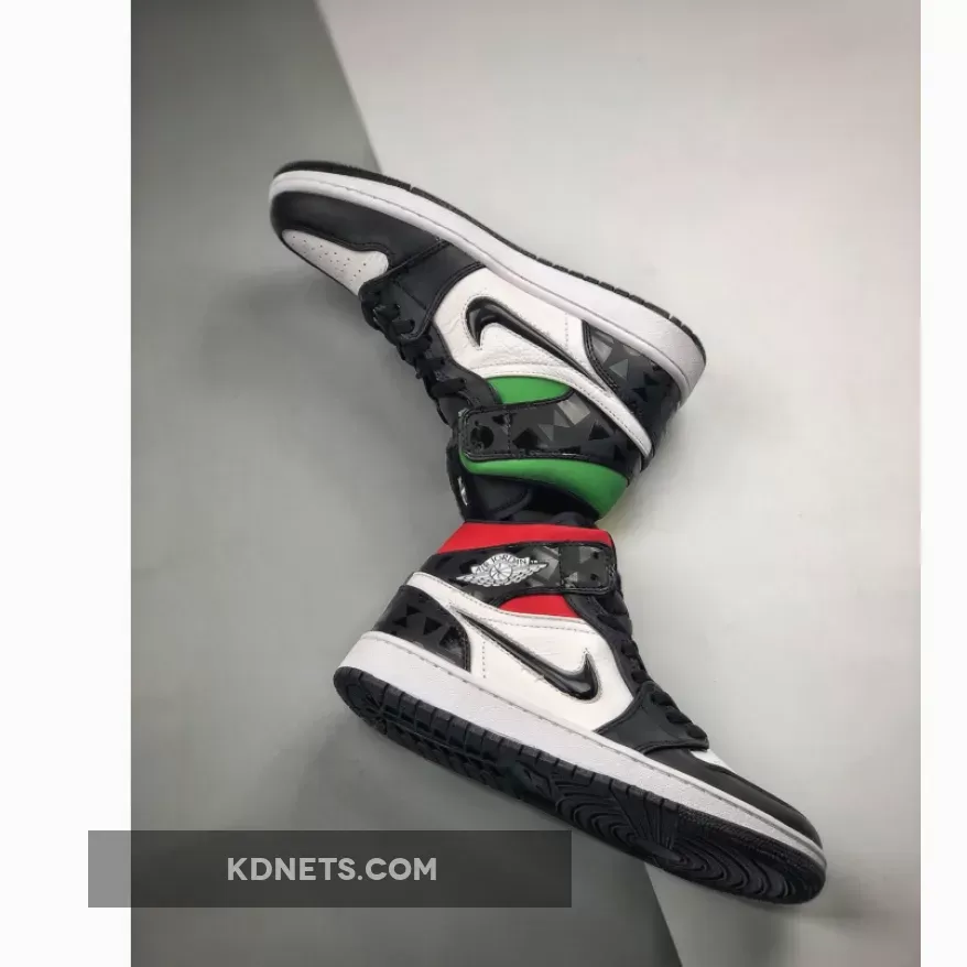 This offering of the mid-top Air Jordan 1 features a White leather upper with Black leather overlays. Other details includes a White Wings logo with a the Quai 54 basketball logo embroidered on the tongues, along with a jewel-like Swoosh logo on the sides. A glossy triangular pattern is displayed on the heel counter, while having Yellow/Green around the upper collar of the left shoe, and Blue/Red on the right shoe. Finishing off the design is the themes colorful shape pattern on the insoles.