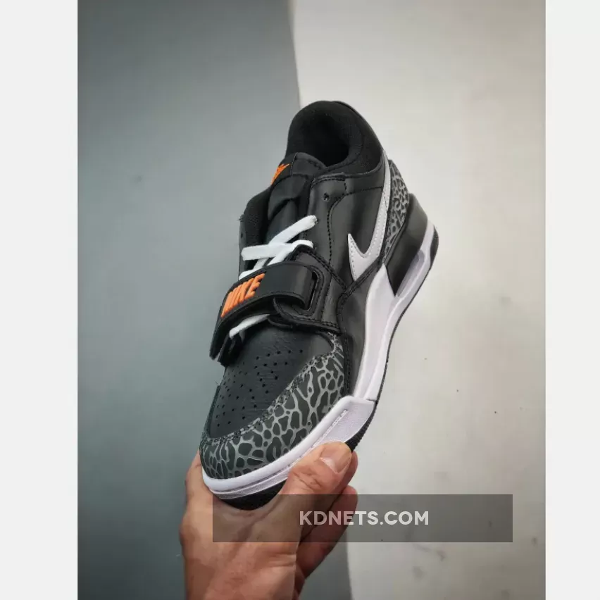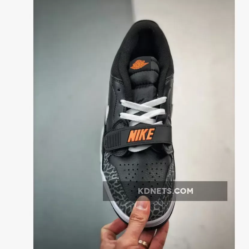 Additionally, the low-top trim features a vibrant orange hue, visible on the heel’s Jumpman logo, and the Nike insignias on the forefoot strap and tongue tab, offering a pop of color that complements the darker tones.