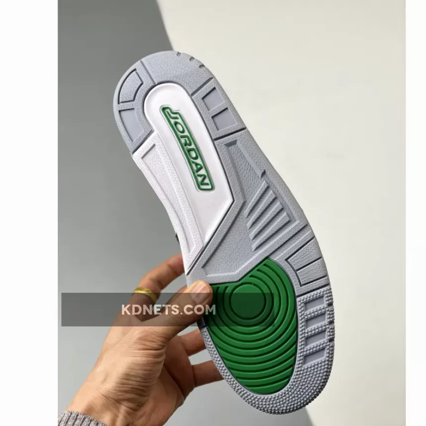 the pair embarks on a lightened take on the iconic color blocking, exercising crisp white leather uppers contrasted in seldom along the jet-black Swoosh and heel mudguard.and the vibrant green accents consume the sock liner, tongue trim, mid-foot overlay and branding atop the forefoot strap and Jumpman affixed to the heel for an illuminated finish.