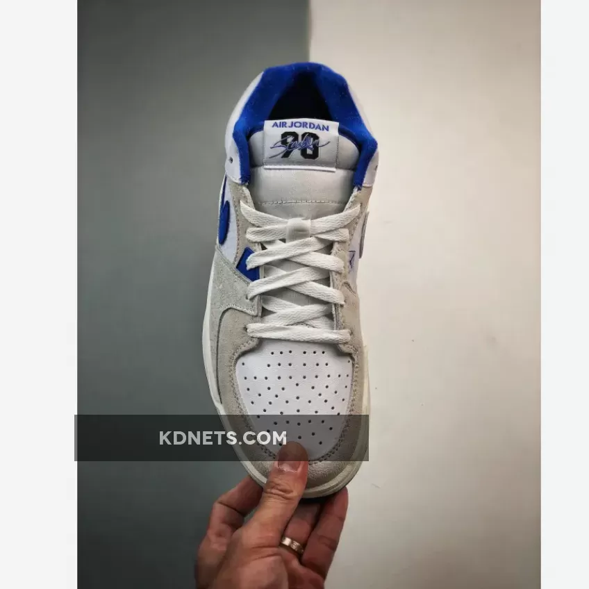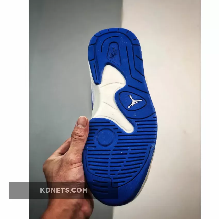 Gaining traction in the modern arena, this silhouette deftly marries the timeless charm of the Air Jordan 5 with contemporary upgrades. Crisp white shades illuminate the ribbed ripstop mid-foot window while bringing further colorless hits to the smooth leather vamp and laces. The laces, tongue and heel collar are adorned in white while the suede profile Swoosh, heel logo, inner lining and tread are accented in the royal blue. The shoe sits atop a sail midsole on top of a royal blue rubber outsole to round out the design.
