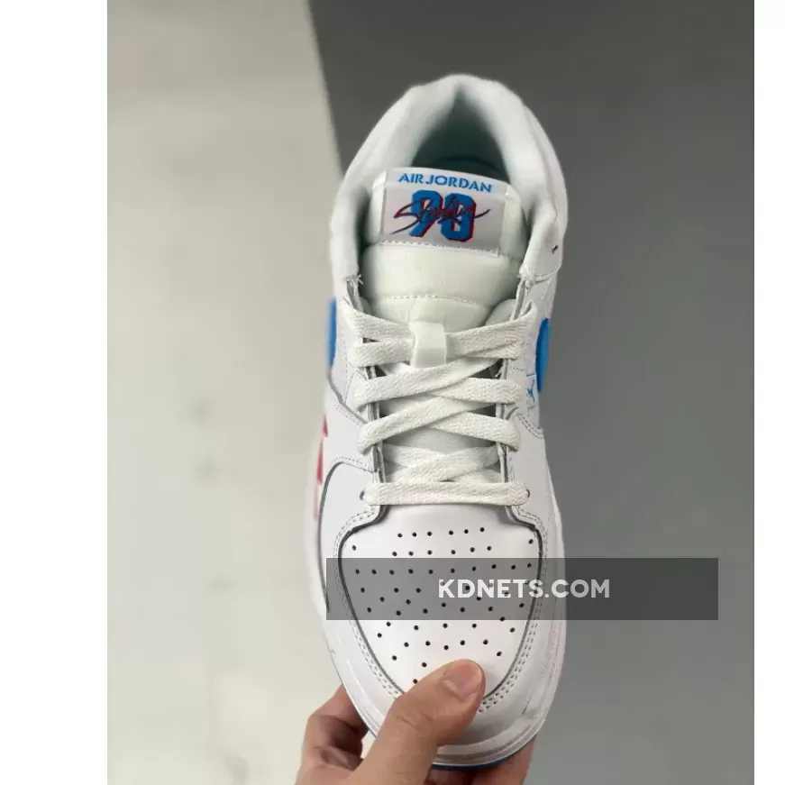 Completing the look is a retro-inspired tongue tag that ties the entire color scheme together, uniting the elements of blue, red, and white in a cohesive arrangement.