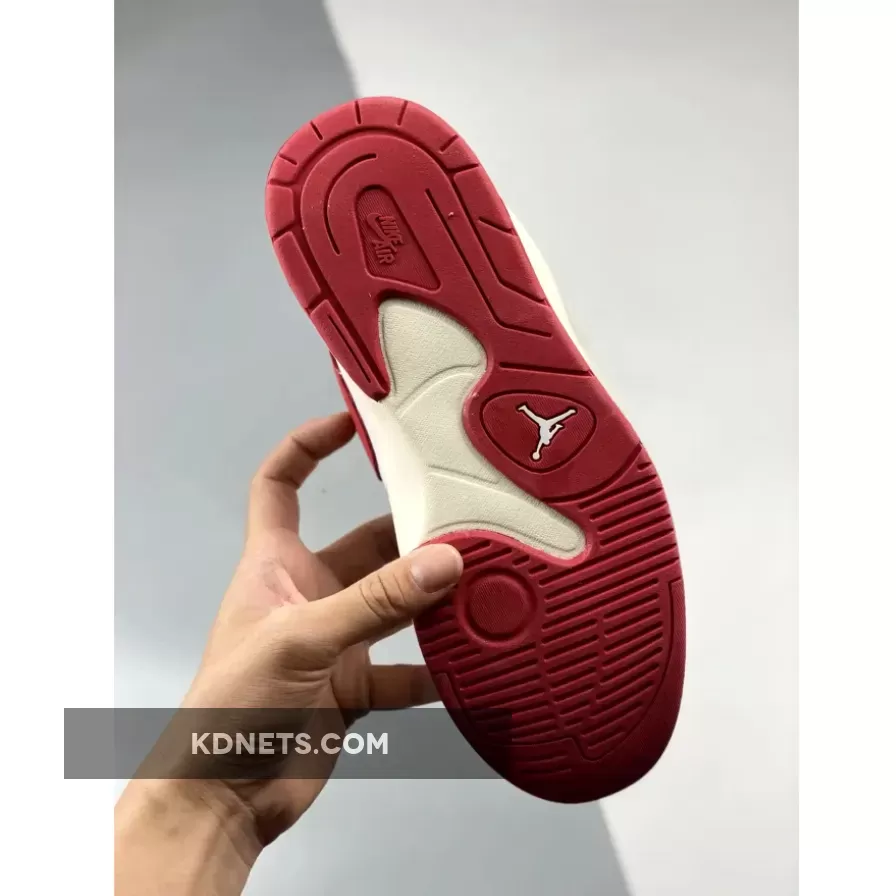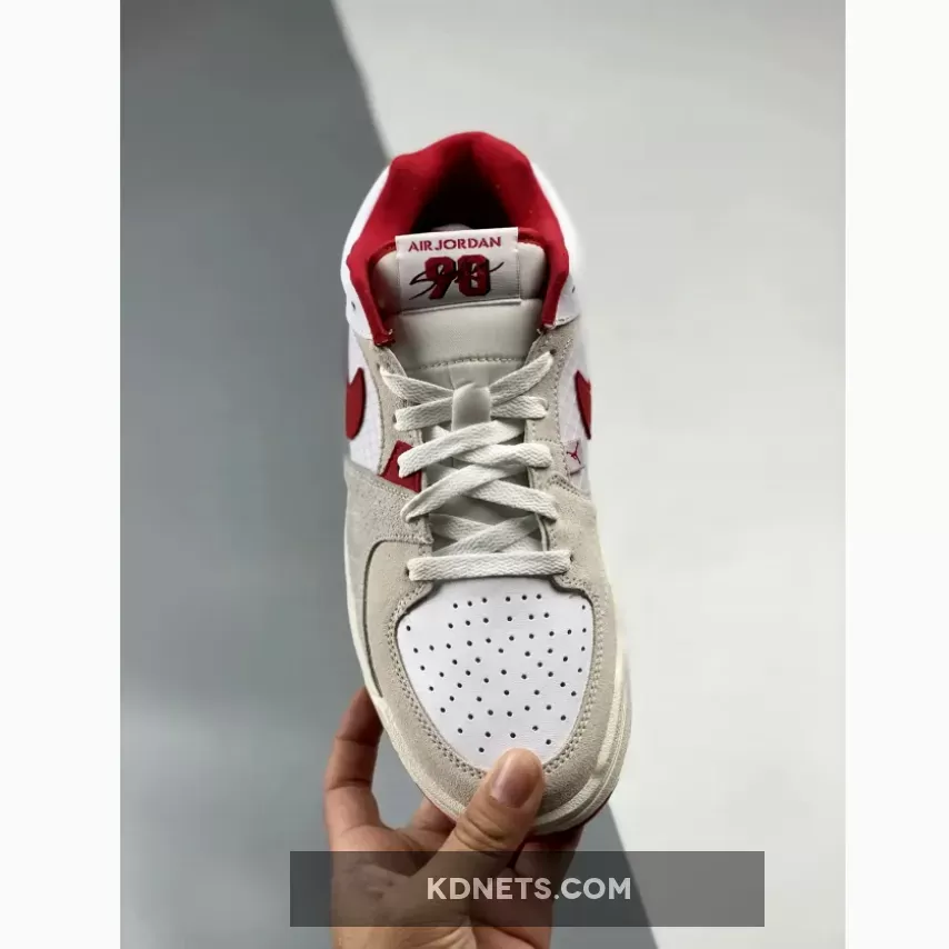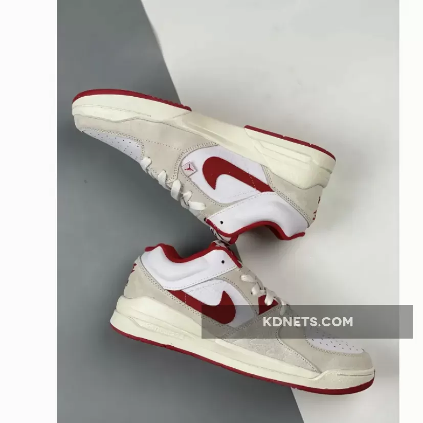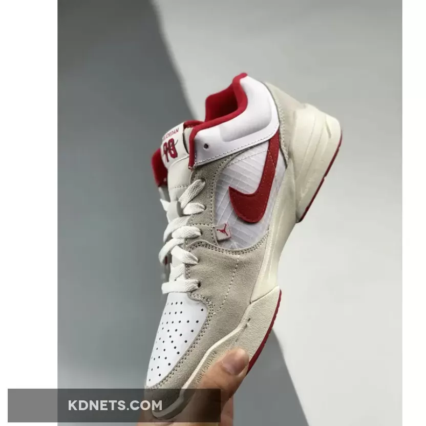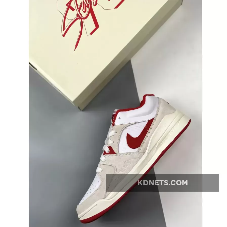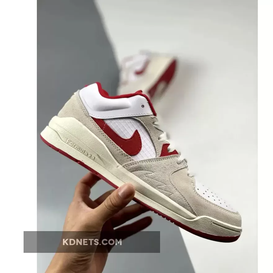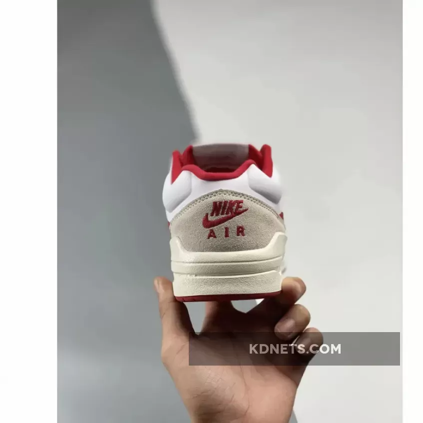 The upper comprises a white base made up of leather at the toe box and ribbed mesh at the medial side. Velvety beige suede overlays at the mudguard, eye stays, medial side and toe, creating a sense of depth. Contrasting the base are hits of red that come in via the middle eye stay and signature Swoosh appliqué on the medial side. To round things off, the lining, tongue patch and trim as well as the logo embroidery on the heel follows suit, too.