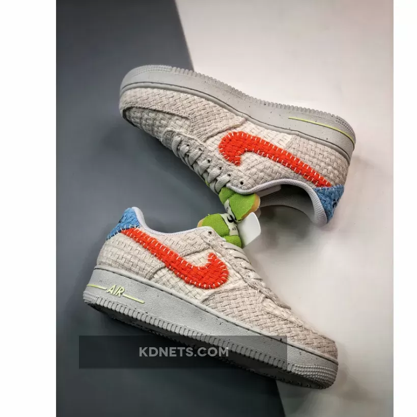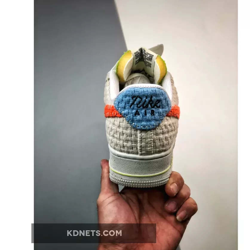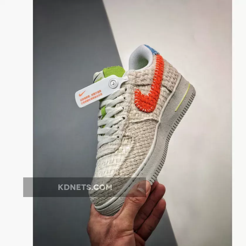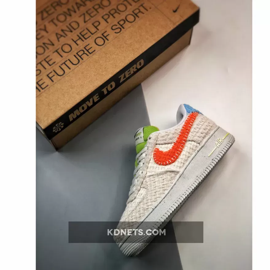This Nike Air Force 1 Low gets engulfed in a fully knitted construction throughout the upper which incorporates recycled materials. Crafted with recycled knitted uppers in an off-white hue, the silhouette receives pops of colors via the red-orange panel swooshes, lime green padded tongues and insoles and baby blue heel tabs. Branding can be found on the exposed foam tongue’s logo, which features the swoosh, Air Force 1 and Hemp insignias, the Move to Zero Pinwheel emblem on the insoles, the Air symbol on the midsole and the stitched Nike Air badge on both heel tabs.