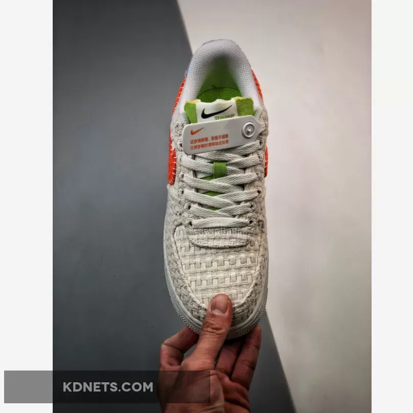 Unlike how we’re used to seeing it, the silhouette deceptively appears handmade. The upper is woven in a thick, white thread, wrapping everything from the to the heel. Even the Swoosh and heel tab are built similarly, though they opt for a vibrant orange and blue coloring, respectively. Elsewhere, the tongue, in its neon green finish, is far more standard, while the sole below is part-recycled, evidenced by its subtle speckling.