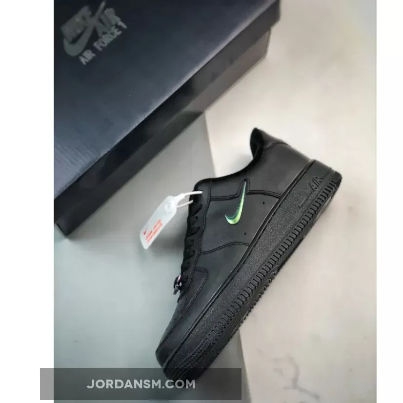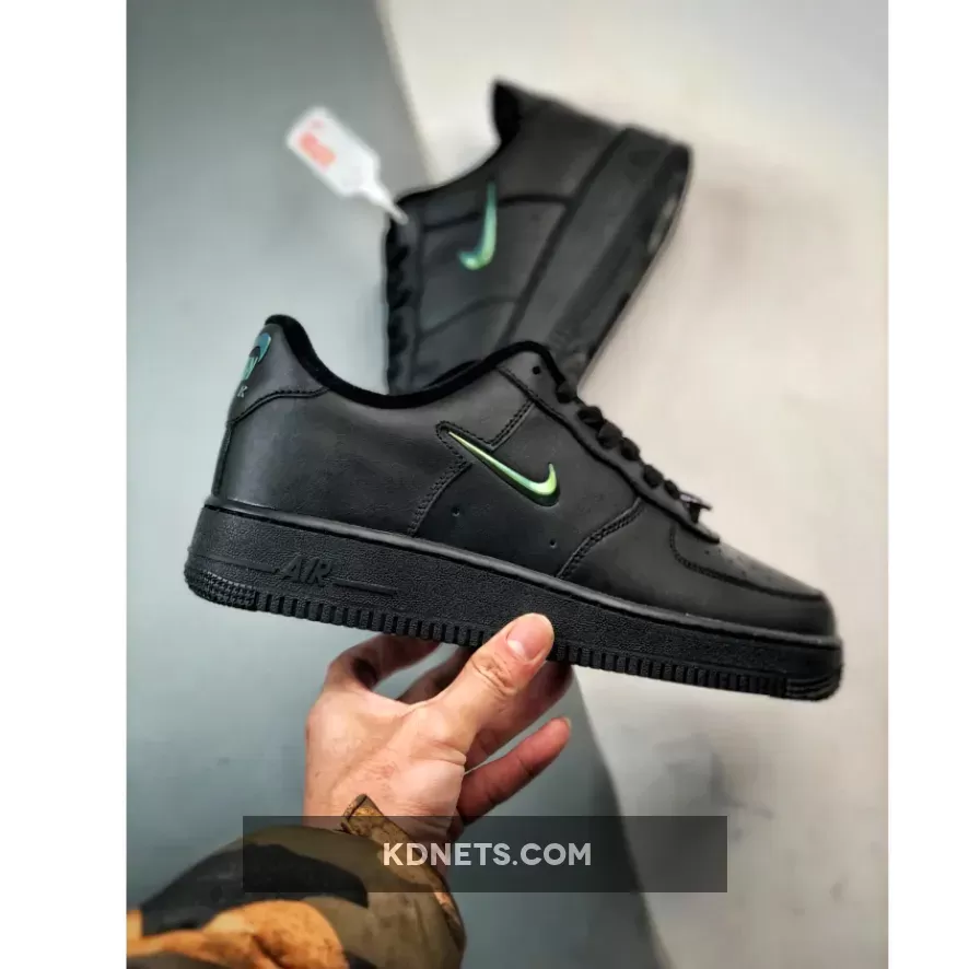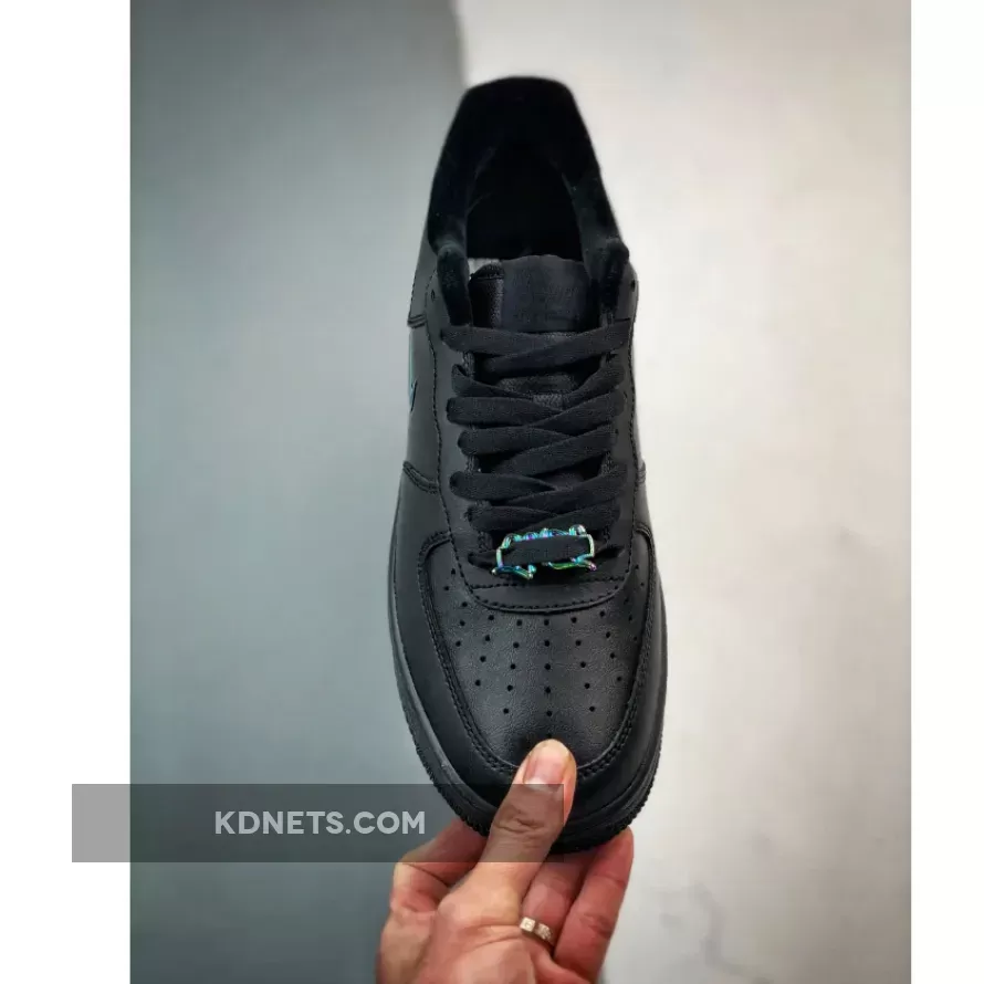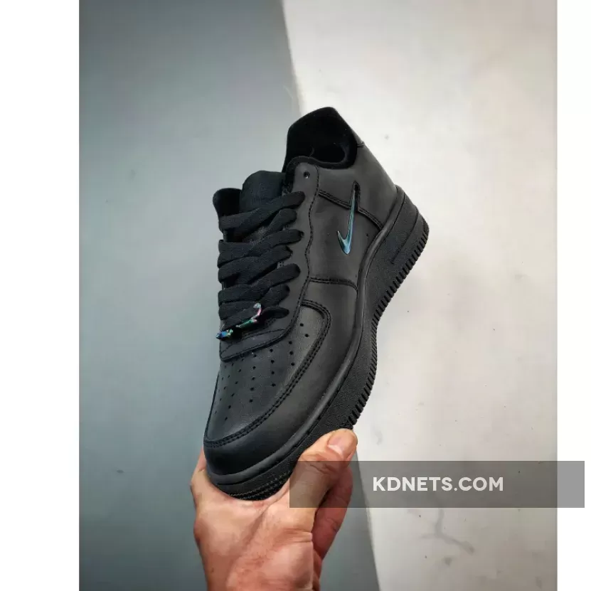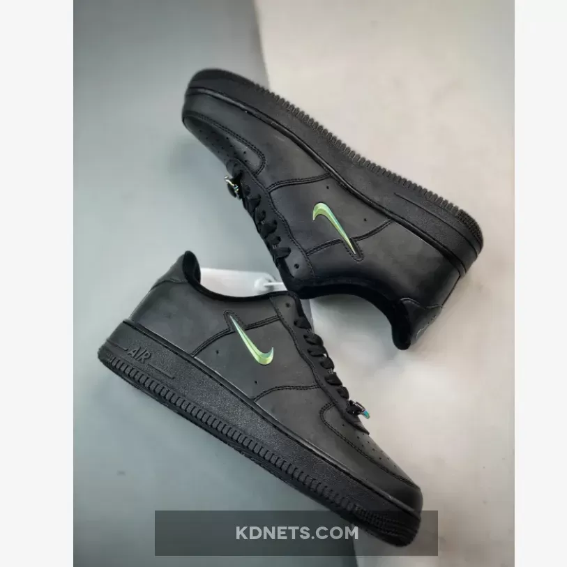 The Nike Air Force 1 Low in this release boasts a full leather construction, along with breathable mesh tongues and a luxurious velvet inner lining. The shoe’s all-Black foundation is accentuated by iridescent Swoosh logos, “Just Do It” lace dubraes written in cursive, and unique upside-down “Nike” logos on the heel tabs. To wrap up the design, a solid Black AF1 rubber sole is added for that iconic finish.