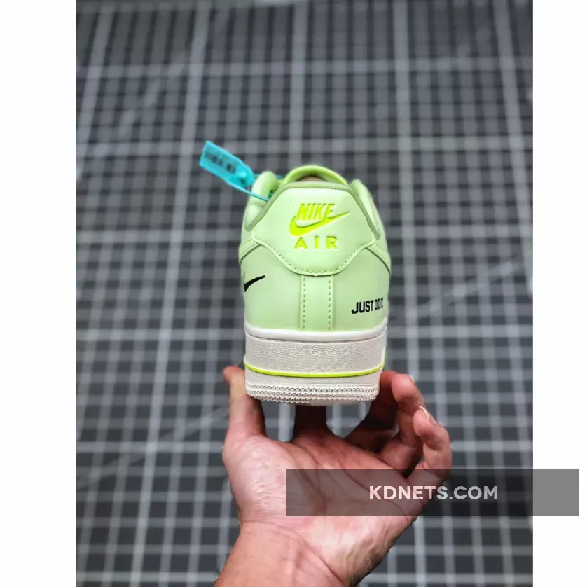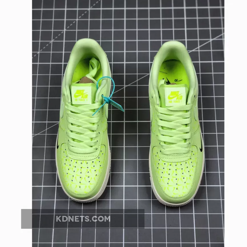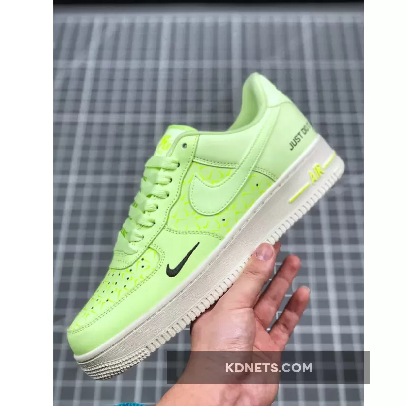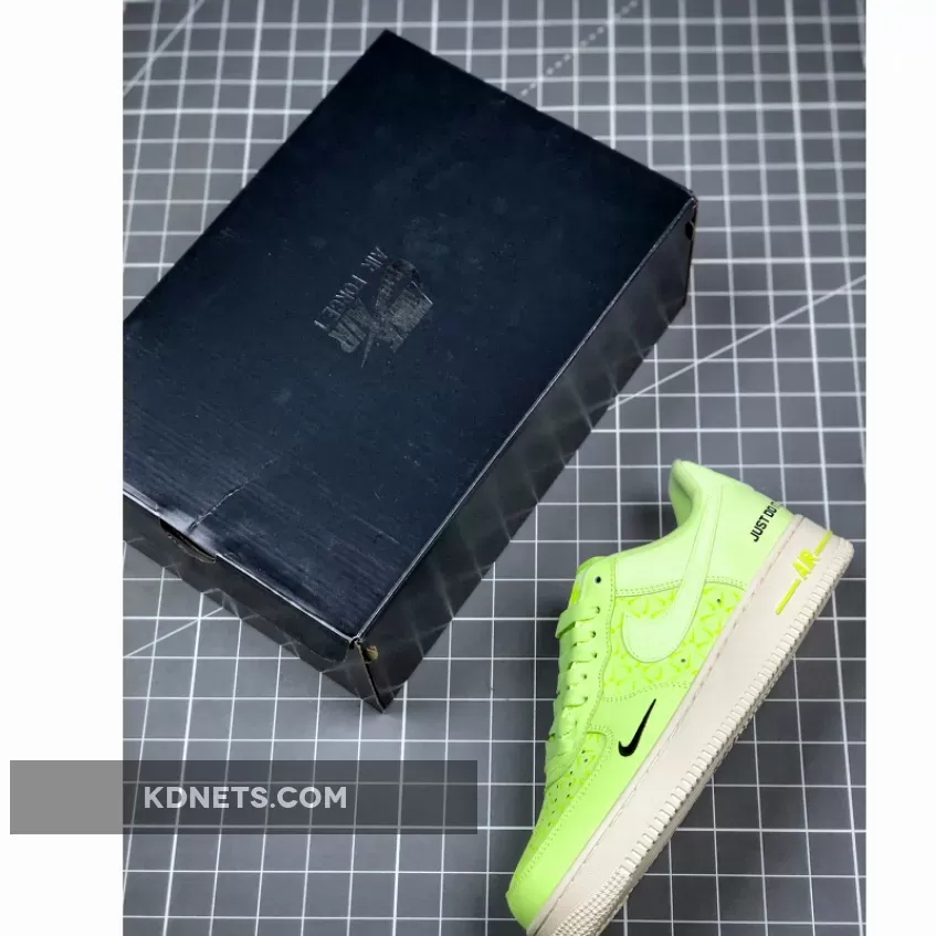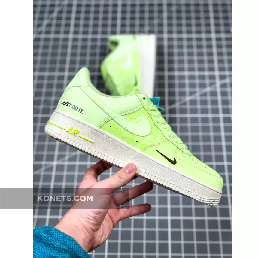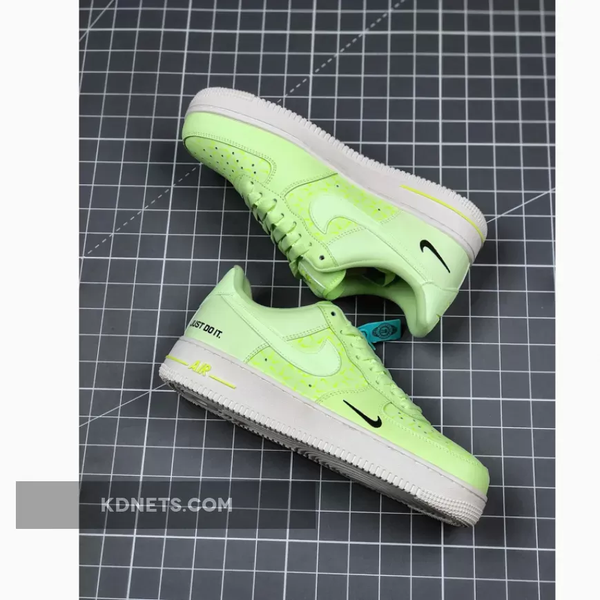 This offering of the Nike Air Force 1 Low features a full Neon-colored upper highlighted with Volt mini Swoosh logos on the toe and side panels. Black embroidered Swoosh on the sides with “Just Do It” on the heels completes the design.