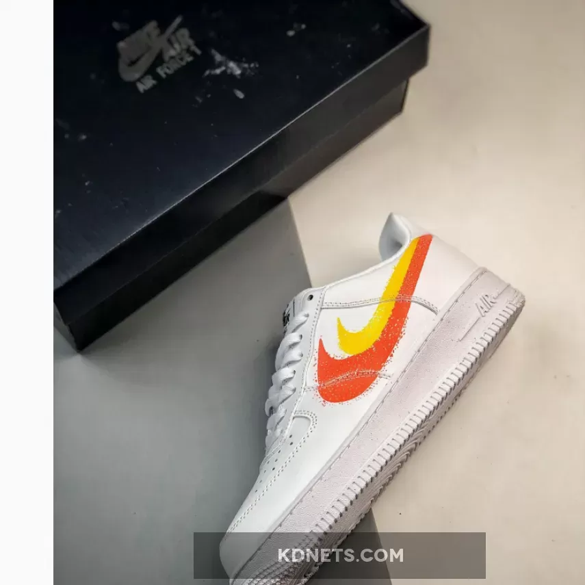 Mirroring its monochrome pair’s double-painted Swooshes rendered atop one another along the mid-foot, the enlarged option enjoys a bright orange streak while golden yellow hues encompass the latter check. Devoid of any spray paint bottle motifs, the Bruce Kilgore design indulges in its synonymous Nike Air branding cast in a contrasting swatch of black while a faint speckling attributes the sole unit in connection to the unavoidable markings left over from the paint job.