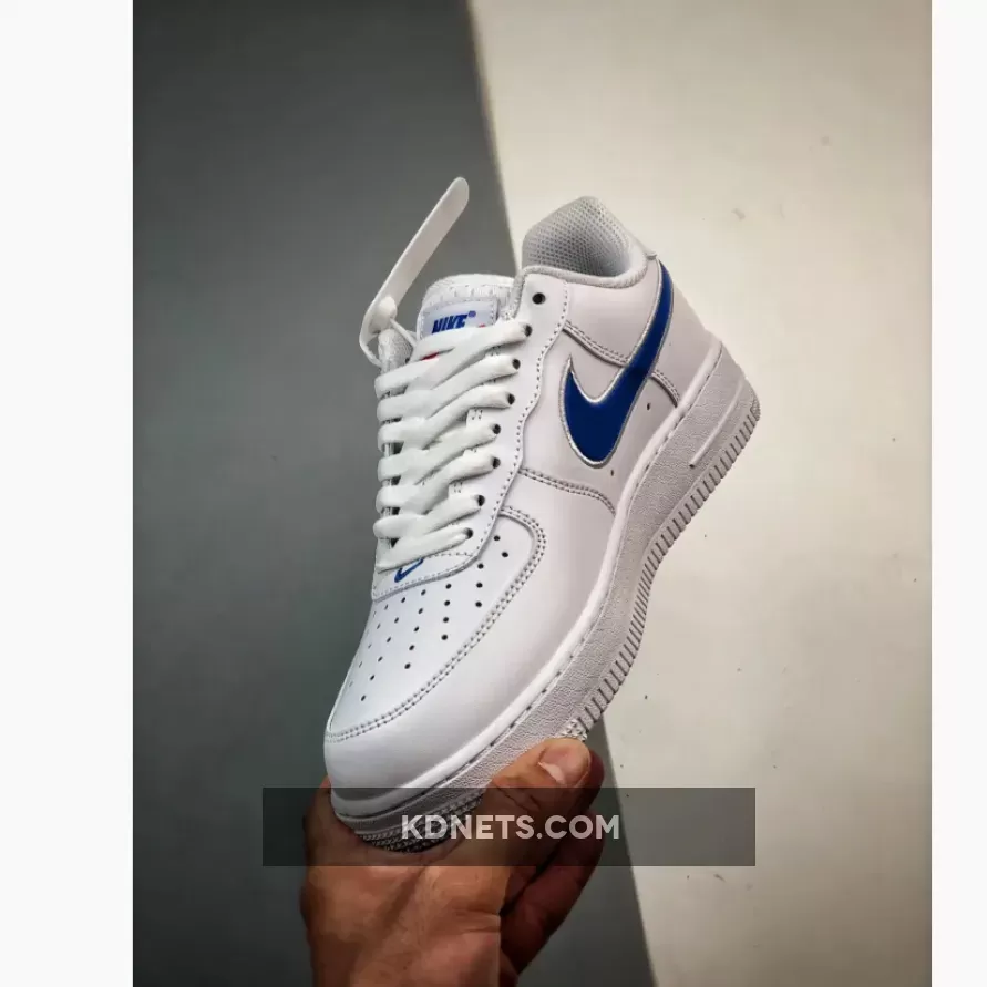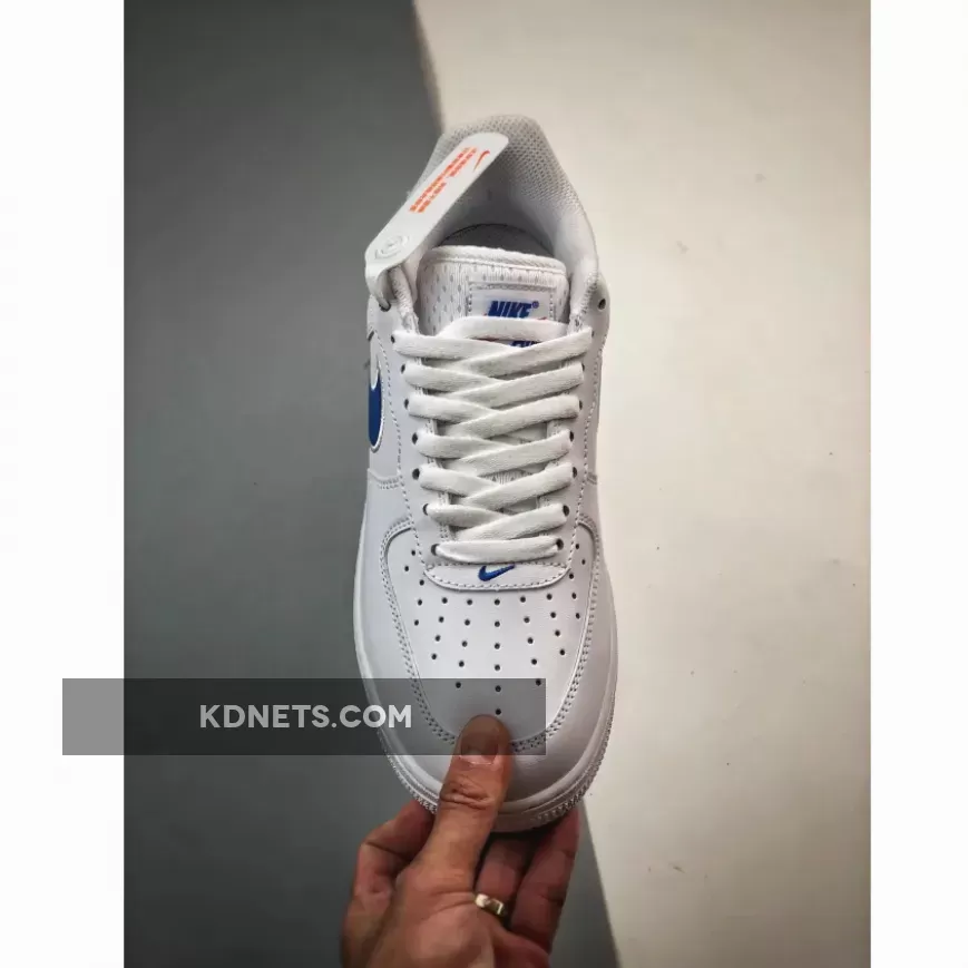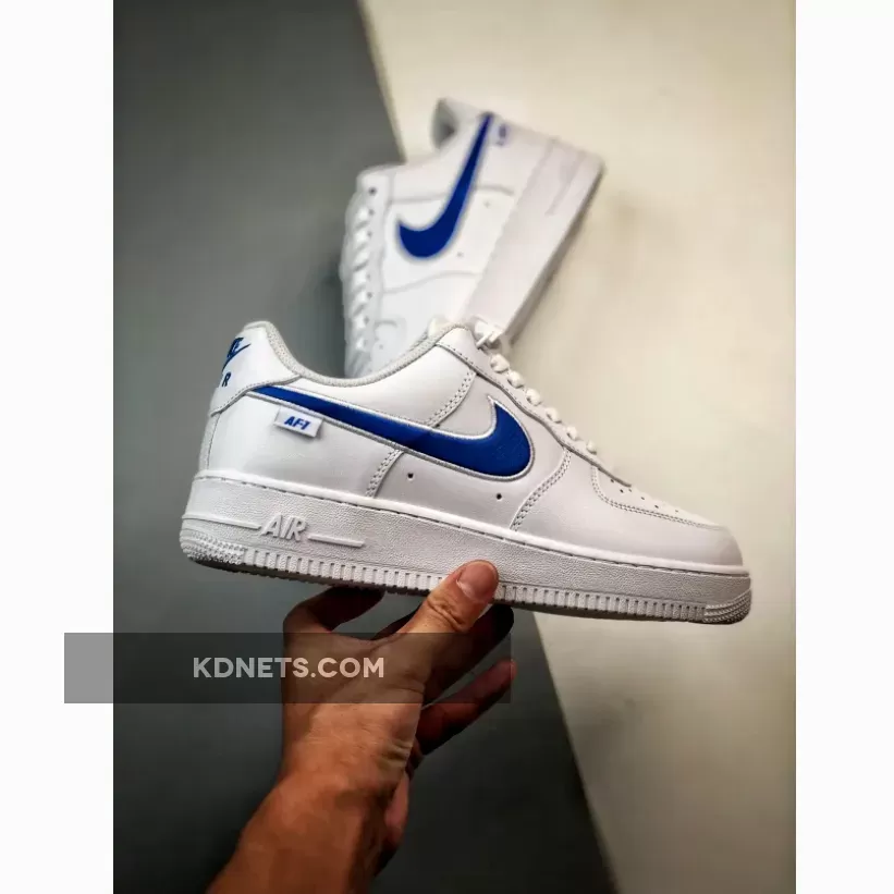 Going over this Nike Air Force 1 Low, it features White smooth leather on the upper, eyestays, and heels. Next, we have jersey mesh on the tongues, a nod to when the shoes were used on basketball courts. Color-matching the cerulean blue hue throughout the heel and vamps branded embellishments, an “AF-1” hangtag is added to further entrench the model’s athletic roots while a seldom orange shade attributes the tongue tab’s Swoosh in conclusion.