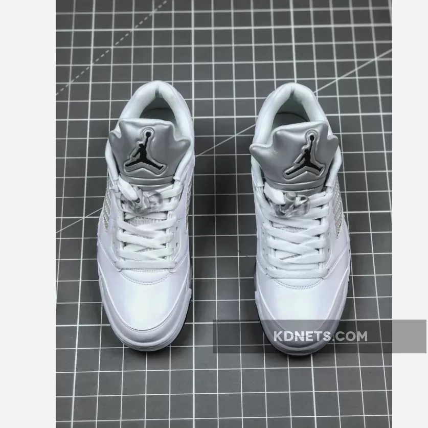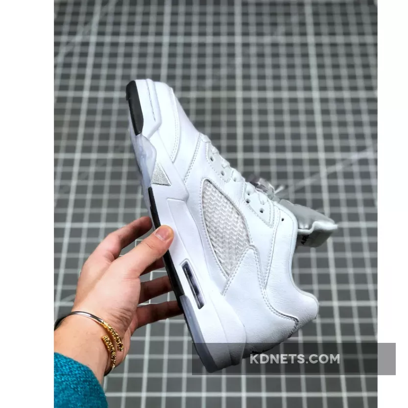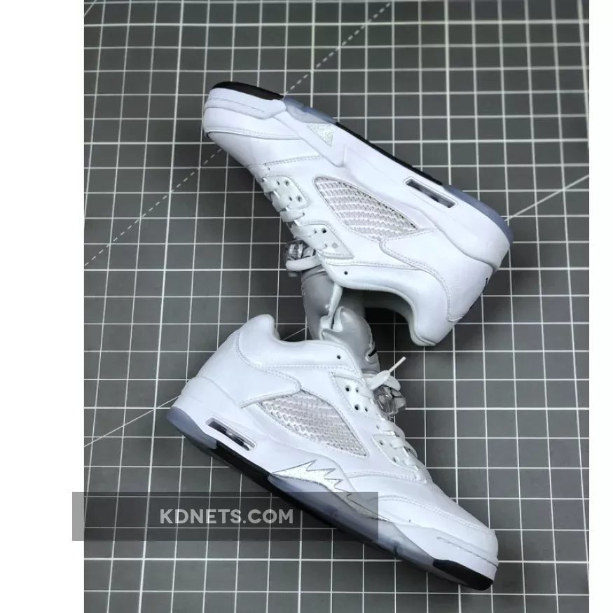 This Air Jordan 5 Low has a lot of similarities to the previous Air Jordan 5 “Metallic Silver” release that is dressed in a White, Black and Wolf Grey color scheme. The shoe features an all-White leather base upper with Black detailing and Wolf Grey accents throughout. Finishing off the look is an icy translucent outsole.