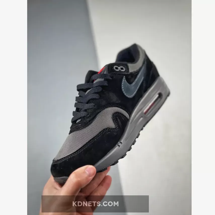 The shoe is constructed in an anthracite mesh base which is complemented by sleek black overlays and mudugards. Suede accents on the overlays and the iconic Swoosh add a touch of luxury to the shoe, while university red hues make appearances on the tongue tags, insoles, embroidered heel branding and Air Max heel units, delivering that signature “Bred” aesthetic. An anthracite rubber midsole with red visible Air Max heel units and a Black rubber outsole cap off the look on.