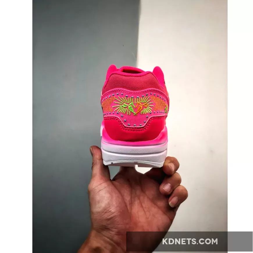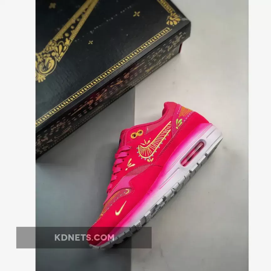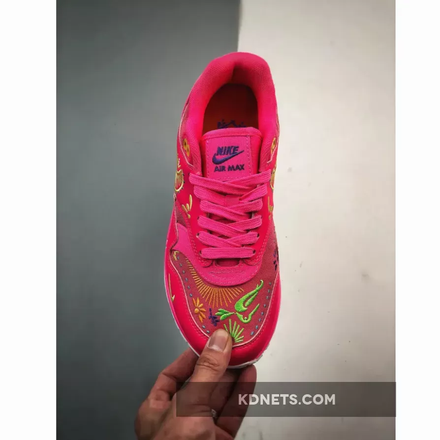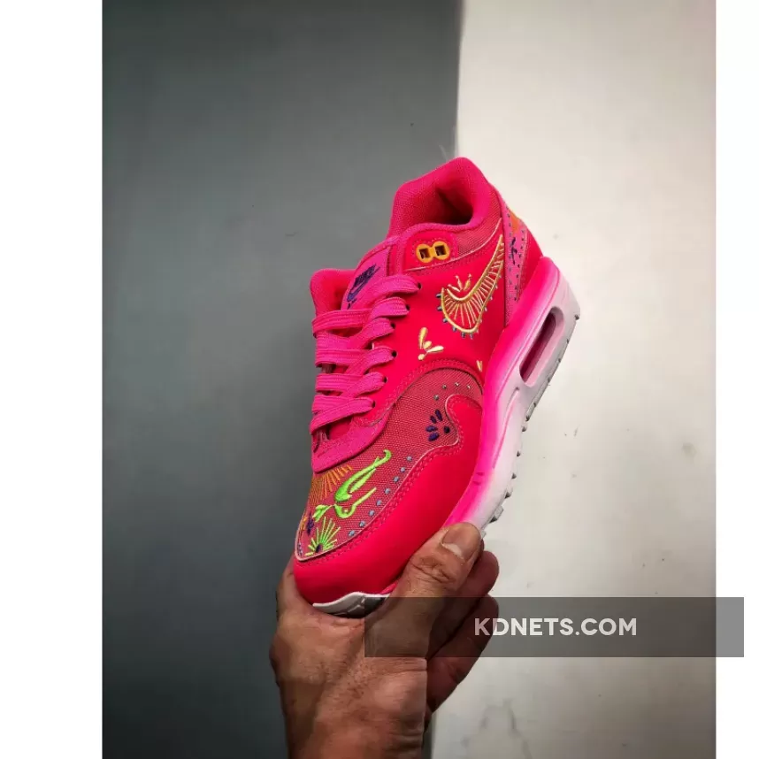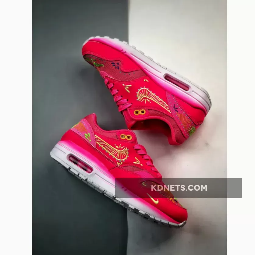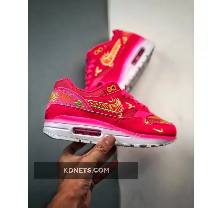the Nike Air Max 1 PRM Familia “Dia De Los Muertos” sports a vibrant hyper-pink outfit embellished with intricate designs in opti yellow, green strike, total orange, and blue lightning inspired by the Day of the Dead celebrations. this vibrant Nike Air Max 1 iteration has a lightweight hemp base with leather overlays encompassing the mudguard, midfoot, and heel for added durability and protection. Ornate embroidered details engulf the toe, Swoosh, and rear in colourful neon accents, a homage to the intricate patterns spotted on Mexican sugar skulls. Purple hues adorn the Nike Air Max label on the tongue and Familia branding on the sockliner. The PU foam midsole veers away from the spirited design of the upper, instead displaying a gradient effect transitioning from light pink to white, highlighting the visible pink Air Max unit in the heel. The classic waffle sole has the same white tone to wrap up this attention-grabbing AM1 rendition.