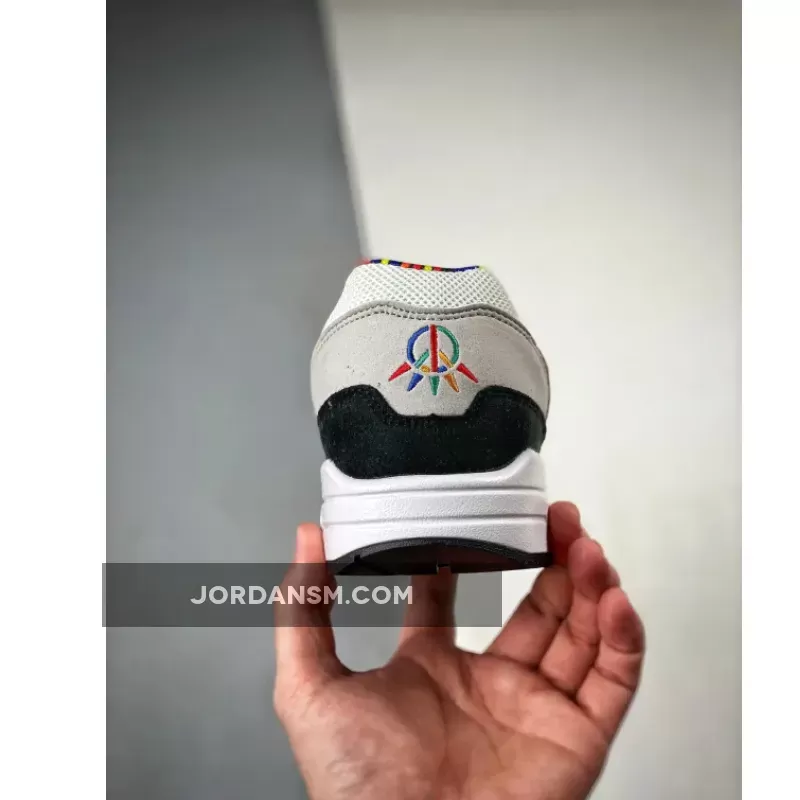 This iteration of the ‘90s runner features a white mesh upper accented by a variety of different colors. Black suede overlays tread across the mudguard to the heel counter, while grey leather overlays sit directly above it. Like the aforementioned Air Raid, it shares the same multi-color arrangement around its sock-liner and tongue. Yellow contrast stitch marks the forefoot along the edge of the black mudguard, while alternating swooshes hue red and blue atop the lateral and medial sides, respectively. Elsewhere, the lining is marked all over with the vibrant retro print and the heels are embroidered with a special peace sign.
