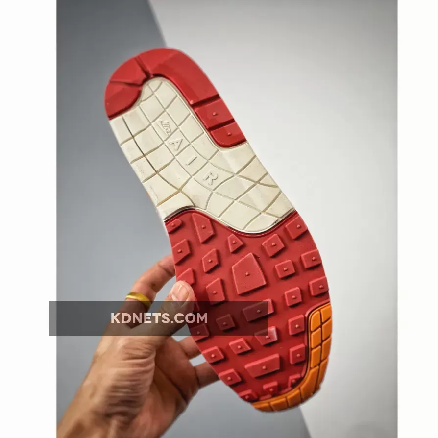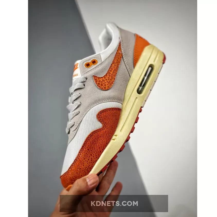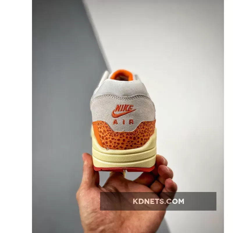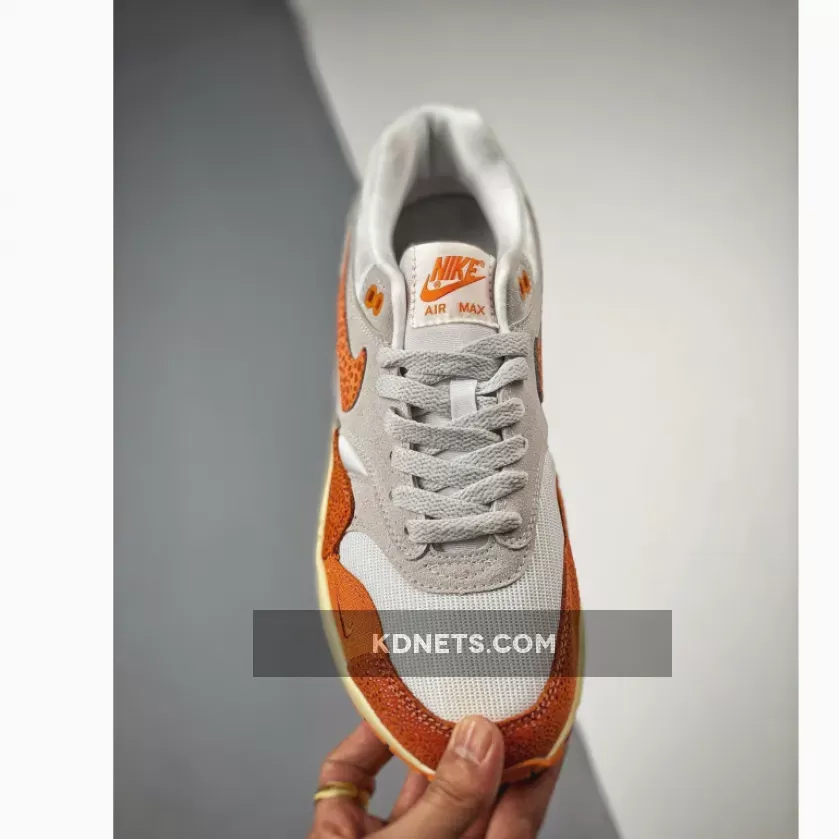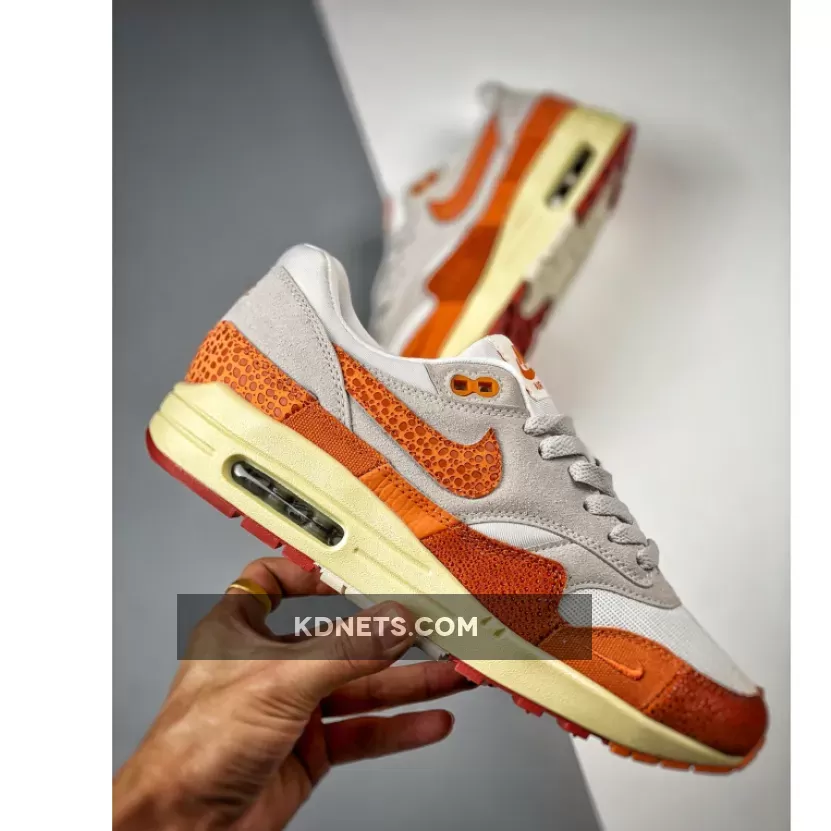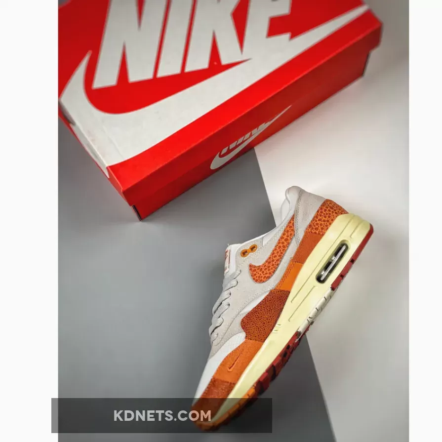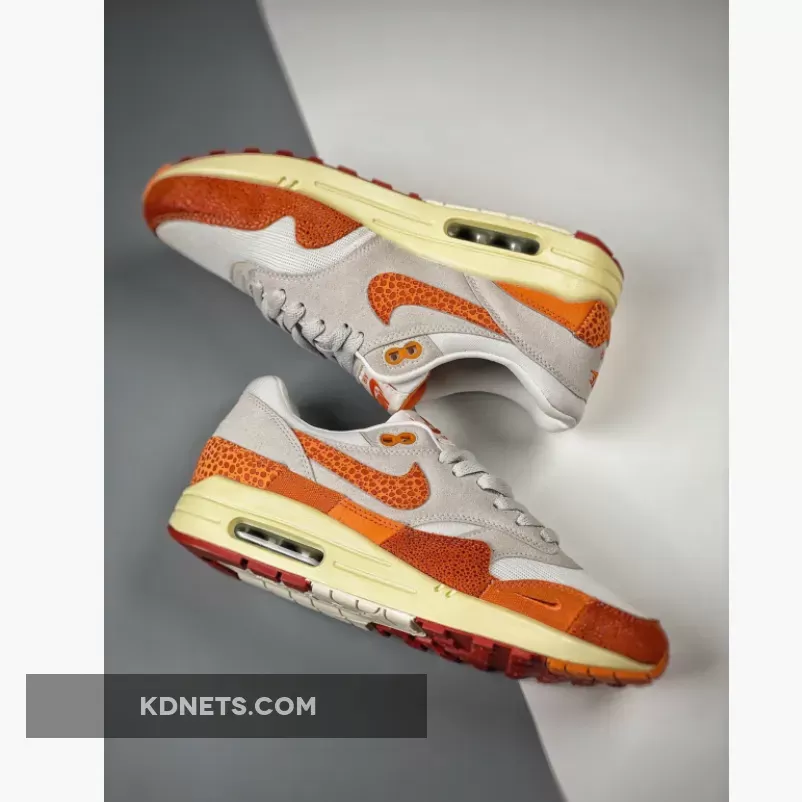 This Nike Air Max 1 comes dressed in a Light Bone, Magma Orange, and Neutral Grey color combination. Highlighted with various prints on the Swoosh and mudguard that pay tribute to the different designs used on previous AM1 drops. Light Bone adorns the mesh toe with Grey suede on the overlays. Other details include an aged midsole and a mixture of the three aforementioned colors on the rubber outsole.